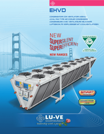 EHVD CONDENSATO RI CON VENTILATORI ASSIALI AXIAL FAN TYPE AIR COOLED CONDENSERS CONDENSEURS AVEC VENTILATEURS HELÏCOIDES LUFTG EKÜ HLTE VE RFLÜ SSIGER MIT AXIALVENTI LATOREN EHVD CONDENSATOR I CON VENTILATOR I ASSIALI AXIAL FAN TYPE AIR COOLED CONDENS ERS CONDENSEURS AVEC VENTILATEURS HELÏCOI DES LUFTGEKÜ HLTE VERF LÜ SS IGER MIT AXIALVE NTILATOR EN REDUCED WEIGHT IMPROVED AIR DISTRIBUTION Copertina e pag. 1: condensatore con accessori Cower and page 1: air cooled condensers with accessories Couverture et page 1: condenseurs avec accessoires Umschlag und seite 1: Luftgekühlte Verflüssiger mit Zubehör 1 Sospensione batteria Coil suspension Suspension batterie Aufhängungsbatterie Struttura brevettata Patented structure Structure brevetée Patentierte Aufbau: EHVDF EHVDN EHVDS EHVDX EHVDT • Funzionamento e consumi di energia normali. • Normal operation and normal energy consumption. • Fonctionnement et consomma180 ÷ 2232 kW tions d’énergie normales. 112 Models • Normalausführung und norma224 Version ler Energieverbrauch. EHVDU EHVDR • Funzionamento silenzioso e consumi di energia ridotti. • Low noise operation and low energy consumption. • Fonctionnement silencieux et basse consommations d’énergie. • Leise Ausführung und niedriger Energieverbrauch. • Funzionamento silenziosissimo e consumi di energia ridottissimi. • Super low noise operation and super low energy consumption. • Fonctionnement super silencieux et très basse consommations d’énergie. • Sehr leise Ausführung und sehr niedriger Energieverbrauch. Nuovo scambiatore di calore Turbocoil La straordinaria efficienza dello scambiatore di calore deriva dalla combinazione ottimale di nuove alette con tubi di configurazione speciale. I vantaggi ottenuti con il nuovo scambiatore di calore sono: • potenza elevata con bassa portata d’aria • basso assorbimento elettrico dei motori • funzionamento silenzioso • riduzione del volume interno del circuito e del fluido refrigerante. New Turbocoil heat exchanger The extraordinary efficient performance of the heat exchanger is given by a combination of new fins and a special tube configuration. The new heat exchanger advantages are the following: • high in performance with low air quantity required • low motor consumption • low noise operation • reduction of internal circuit volume and refrigerant. E U R O V E N T CERTIFIED PERFORMANCE “CERTIFY-ALL” Nouvel échangeur de chaleur Turbocoil AIR COOLED CONDENSERS Dati certificati dei condensatori EHVD - Potenze (ENV 327) - Portate d’aria - Assorbimenti motori - Superfici esterne - Livelli di potenza sonora (EN 13487) Certified data of air cooled condensers EHVD - Capacities (ENV 327) - Air quantities - Motor power consumption - External surfaces - Sound power levels (EN 13487) Données certifiées de condenseurs à air EHVD - Puissances (ENV 327) - Débits d’air - Puissances absorbées moteurs - Surfaces externes - Niveax de puissance acoustique (EN 13487) Zertifizierte Daten der luftgekühlten Verflüssiger EHVD - Leistungen (ENV 327) - Luftdurchsätze - Motorleistung Aufnahmen - Äußere Flächen - Schalleistungspegel (EN 13487) Convogliatore Boccagli delle ventole di nuovo disegno ad alta efficienza per eliminare il ricircolo dell’aria e ridurre la rumorosità. Fan shroud New high efficiency fan shrouds to eliminate air backflow and to reduce the noise. Diffuseur Diffuseur de nouvelle conception à haute efficacité pour éliminer le recyclage de l’air et réduire le bruit. Luftführung Neue Ventilatordüsen mit hohem Wirkungsgrad verhindern Rückluft und senken den Geräuschpegel. L’extraordinaire efficacité de l’échangeur est née de l’union optimale des nouvelles ailettes avec le tubes à configuration spéciale. Les avantages donnés par le nouvel échangeur de chaleur sont: • prestations élevées avec une quantité d’air réduite • réduction de la puissance absorbée par les moteurs • fonctionnement silencieux • réduction du volume du circuit et de réfrigérant. Neue Wärmeaustauscher Turbocoil Die ausserordentliche Leistung von Hitec® Wärmeaustauschern ist möglich durch die Kombination der neuen Lamellen mit dem innen geriffelten Rohr. Die Vorteile der neuen Wärmeaustauscher sind: • Hohe Leistung bei niedriger Luftmenge • Geringe Motorleistungsaufnahme • Niedriger Geräuschpegel • Reduziertes inneres Volumen und Kältemittelmenge. 2 Sospensione batteria SAFETUBES SYSTEM Coil suspension SAFETUBES SYSTEM ® by LU-VE ® Aufhängungsbatterie SAFETUBES SYSTEM by LU-VE SAFETUBES SYSTEM ® by LU-VE ® by LU-VE Il nuovo sistema brevettato LU-VE Contardo di sospensione della batteria esclude totalmente il contatto dei tubi con la struttura del condensatore e assicura la completa protezione dei tubi della batteria durante il trasporto, l’installazione e il funzionamento del condensatore. The new patented coil suspension system LU-VE Contardo completely eliminates the tube contact with the condenser frame and provides full protection for the coil tubes during the condenser transport, installation and operation. Le nouveau système breveté LU-VE Contardo de suspension de la batterie exclut complètement tout contact des tubes avec la structure du condenseur et garantit une totale protection des tubes de la batterie pendant le transport, l’installation et le fonctionnement du condenseur. Das neue patentierte Aufhängesystem LU-VE Contardo schließt den Kontakt der Rohre mit dem Verflüssigergehäuse aus und garantiert einen umfassenden Schutz der Rohre während des Transports, der Installation und des Betriebs des Verflüssigers. Struttura Structure Structure Aufbau • La nuova struttura brevettata e ampiamente sperimentata e collaudata su tavoli vibranti consente grandi vantaggi: • maggiore rigidità del prodotto • peso dell’apparecchio ridotto • migliore e più uniforme circolazione dell’aria • calo di prestazioni minimo in caso 