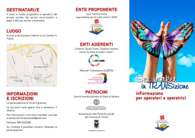 DESTINATARI/E ENTE PROPONENTE Il corso è rivolto a operatori e operatrici del privato sociale, dei servizi socio-sanitari e legali e alle sex worker interessate. LILA Trentino onlus Lega Italiana per la Lotta contro l’AIDS LUOGO Il corso si terrà presso Cinformi in via Zambra 11, Trento. ENTI ADERENTI Cinformi Tavolo Tratta “Sistema trentino contro la tratta di esseri umani” Rete per il benessere ELGBTQI INFORMAZIONI E ISCRIZIONI PATROCINI Centro Interdisciplinare di Studi di Genere La partecipazione al corso è gratuita. Le iscrizioni sono aperte fino a domenica 11 ottobre. Per informazioni e iscrizioni mandare una mail a [email protected] Cellulare 389 5653358 Su richiesta è possibile ricevere l’attestato di partecipazione. Assessorato alle Politiche sociali del Comune di Trento Sex worker in TRANSizione inFormazione per operatori e operatrici SINTESI DEL CONTENUTO Il lavoro sessuale è un fenomeno complesso e mutevole, incrocia molte tematiche quali la cittadinanza, i rapporti tra i generi, il lavoro, le migrazioni e le discriminazioni. In questa complessità l’unità mobile l’Aquilone della LILA Trentino onlus ha promosso un’indagine per cercare di comprendere i bisogni specifici delle persone in transizione che lavorano con il sesso. Si è deciso di organizzare un corso di formazione per comprendere maggiormente il fenomeno, trovare delle azioni possibili, attrezzando operatori/trici e organizzazioni al fine di migliorare l’accesso ai servizi e il soddisfacimento dei bisogni delle persone transessuali presenti sul territorio. Nello specifico il corso mira a: • conoscere/condividere i bisogni delle persone transessuali nella prostituzione e nella migrazione, sulla base di un approccio interdisciplinare; • formare operatori/rici alla multidisciplinarietà del tema; • valorizzare le esperienze territoriali ed extraterritoriali sui temi; • sensibilizzare le realtà pubbliche e private del territorio; • intensificare le relazioni tra servizi; •individuare azioni concrete da parte dei servizi per il miglioramento dell’accessibilità e l’offerta di risposte a bisogni specifici; • rendere possibili accessi ai servizi da parte delle persone. PROGRAMMA 16 OTTOBRE 2015 ore 14.00-18.00 Modulo 1 Genere, transessualità e transgender. • Saluti istituzionali - Laura Castegnaro, direttrice dell’ufficio sviluppo e innovazione politiche sociali della PAT •Sex worker trans nell’Unità di strada l’Aquilone - Alessandra Senettin, LILA onlus del Trentino • Di cosa parliamo quando parliamo di genere? Breve introduzione ai diversi approcci teorici e alle implicazioni operative - Giulia Selmi, Centro Studi Interdisciplinari di Genere • La persona transgender e transessuale: aspetti psicologici della condizione T* e dell’iter di transizione - Annalisa Zabonati, SAT Sportello Accoglienza Trans Verona. 30 OTTOBRE 2015 ore 14.00-18.00 Modulo 2 Il lavoro sessuale/sex work. • Immaginari, coordinate legislative sul lavoro sessuale - Roberta Pompili, Università di Perugia • Gestione della solitudine nel sex work. Tradurre il vissuto personale in visibilità politica e operativa, le esperienze di unità di strada trans - Porpora Marcasciano, MIT Movimento Identità Transessuale Bologna e Regina Satariano, Consultorio di Torre del Lago Viareggio. 13 NOVEMBRE 2015 ore 14.00-18.00 Modulo 3 Accesso alla salute: • Trattamento ormonale nella disforia di genere - Pierluigi Amadori, endocrinologo • Accesso ai servizi sanitari per le persone migranti - Elisabetta Cescatti, associazione GRIS Trento • Persone con varianza di genere tra salute, protocolli e percorsi. L’esperienza dello Sportello LGBTQI* del Trentino Alto Adige Arianna Miriam Fiumefreddo, Rete ELGBTQI* del Trentino Alto Adige • La situazione locale: l’accesso alla rete dei servizi - Simona Sforzin, Unità Operativa Cure Primarie APSS Trento. 27 NOVEMBRE 2015 ore 14.00-19.00 Modulo 4 Accesso alla cittadinanza. •Orientamento e accesso ai servizi sociali: area inclusione e consultorio famigliare - Michela Bailo, Area inclusione sociale, Comune di Trento • Discriminazioni di genere - Sara Ferrari, Pari Opportunità, Provincia Autonoma di Trento • La protezione internazionale per orientamento sessuale e identità di genere - Irene Serangeli, Centro Astalli - Cinformi Trento • Accesso al lavoro e “inclusività” per le sex worker transessuali – Flavio Bortoli, Con. Solida Trento. 11 DICEMBRE 2015 ore 14.00-18.00 • Valutazione e azioni possibili - a cura di LILA onlus del Trentino, Cinformi Tavolo Tratta “Sistema trentino contro la tratta di esseri umani” e Rete per il benessere ELGBTQI.