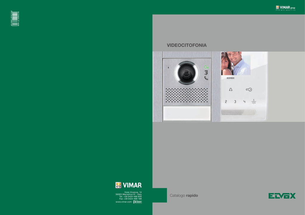 B.C16051 IT 1606 VIDEOCITOFONIA Viale Vicenza, 14 36063 Marostica VI - Italy Tel. +39 0424 488 600 Fax +39 0424 488 188 www.vimar.com Catalogo rapido Vimar si riserva di modificare in ogni momento e senza preavviso le caratteristiche dei prodotti riportati. Per motivi di impaginazione grafica, le foto e i disegni dei prodotti non sono rappresentati con proporzioni equivalenti. Videocitofonia e citofonia Elvox. La comunicazione a portata di mano. Parlare, guardarsi, capirsi anche a distanza. Comunicare bene è fondamentale, e oggi c’è bisogno di farlo con semplicità, efficacia e sicurezza. Lo studio rigoroso dei bisogni dell’utente, dei materiali e delle nuove tecnologie ci ha permesso di presentare al pubblico un’offerta varia ed esauriente. Le nostre soluzioni in termini di citofonia e videocitofonia coprono le esigenze di praticità come quelle di innovazione, sono facili da installare e garantite da certificazioni europee. 1 Valore aggiunto Elvox: la professionalità per darvi il meglio. Elvox si rivolge al privato così come alle grandi strutture: la ricerca continua di sistemi tecnicamente avanzati per ogni prodotto proposto, permette di seguire le evoluzioni del mercato e soddisfarne le richieste. Garantendo al contempo facilità d’uso, costante assistenza e massima efficienza. Made in Italy. Elvox progetta e produce in Italia secondo i più alti criteri di qualità e funzionalità: un mix unico dove ad un design originale e moderno sono sempre e comunque associati materiali scelti per capacità di resa e durata nel tempo. Elevata qualità e 3 anni di garanzia. Siamo convinti che la qualità dei nostri prodotti sia il miglior biglietto da visita e per questo testiamo ogni singolo prodotto prima che esca dalla fabbrica. Possiamo vantare le più importanti certificazioni di qualità UNI EN ISO 9001:2008; il nostro sistema di gestione ambientale è certificato secondo la norma UNI EN ISO14001:2004, senza dimenticarci della salute e sicurezza dell’ambiente di lavoro secondo le norme BS OHSAS 18001:2007. Per questo i nostri prodotti li garantiamo 3 anni. Assistenza e professionalità. L’offerta Elvox si distingue per l’eccellenza tecnologica dei prodotti, per la sicurezza delle garanzie ma anche per l’assistenza tecnica costante. Vi seguiamo passo passo nella scelta delle soluzioni più idonee a soddisfare i vostri clienti: personale altamente specializzato è a vostra disposizione per risolvere subito possibili problemi tecnici e affiancarvi, qualora ne aveste bisogno, nell’installazione dei prodotti. 2 Installazione semplice. Sistema sofisticato non è sempre sinonimo di installazione complicata, anzi: Elvox non trascura le esigenze di facilità per montaggio ed utilizzo, grazie a funzioni intuitive che rendono i prodotti fruibili ed agevoli ai fini dell’implementazioni. Efficienza. Tutti i prodotti e sistemi proposti sono costituiti interamente da componenti funzionali e performanti. Solo così possiamo offrire la massima efficacia operativa, garanzia di affidabilità e sicurezza costante. Offerta. Una continua attenzione contraddistingue la gamma proposta, sia nella ricerca di soluzioni innovative che nello sviluppo di prodotti continuamente aggiornati a livello tecnologico ed in linea con la richiesta di una sempre maggiore qualità nelle prestazioni offerte. 3 Due Fili Plus: la tecnologia che moltiplica gli spazi. Da 1 a 6400 collegamenti. E fino a 1200 metri tra posti esterni e posti interni. È la tecnologia che risolve, quella dei videocitofoni e dei citofoni Elvox. Risolve e semplifica, per realizzare con grande facilità tipi diversi di impianto, a seconda delle costruzioni, delle richieste specifiche, dell’ambito di applicazione e della tipologia di utenza, dalla singola villa residenziale al grande complesso edilizio. Con la tecnologia Due Fili Plus di Elvox lo spazio per la videocitofonia e per la citofonia si moltiplica. FINO A 6400 COLLEGAMENTI Con Due Fili Plus si possono realizzare impianti che gestiscono fino ad un massimo di 484 posti esterni e fino a 6400 postazioni interne. Con l’interfaccia di espansione 69RS il sistema può essere replicato fino a 32 blocchi. ... 4 INTERFACCIA DI ESPANSIONE INTERFACCIA DI ESPANSIONE INTERFACCIA DI ESPANSIONE 1 2 3 ... INTERFACCIA DI ESPANSIONE Max 32 FINO A 1200 METRI Con la tecnologia Due Fili Plus si possono realizzare impianti di dimensioni estese, con una distanza tra postazione interna ed esterna che raggiunge i 1200 metri, senza perdere la qualità audio e video del segnale. Il trasporto del segnale avviene con un unico cavo di diametro ridotto, costituito da una coppia di fili twistati. PROGRAMMAZIONE IMMEDIATA La tecnologia Due Fili Plus permette una programmazione davvero semplificata. Direttamente dalla postazione interna, l’installatore può eseguire la programmazione con la targa esterna. Il sistema è anche in grado di simulare, dopo la codifica del posto interno, una chiamata audio/video dalla targa esterna, per verificare immediatamente il buon esito dell’installazione. 5 La gamma per comunicare al meglio: le soluzioni di citofonia e videocitofonia. Con la possibilità di scegliere fra modelli classici e di ultima generazione, apparecchi da interno e da esterno, Elvox presenta un insieme di prodotti ampio e diversificato, contraddistinto da alta qualità strutturale, attenzione al design, facilità di applicazione e impiego. Nel segno del Made in Italy. TAB 4,3 TAB Free WIDE TOUCH 5700 7200 6600 Videocitofoni I modelli proposti presentano varianti in termini di dimensioni, design, funzionalità, tipologia di installazione e monitor. Dai più intuitivi, composti da monitor e microtelefono, passando per prodotti con servizi e funzioni ausiliarie, come autoaccensione, luce scale, regolazione volume, chiamate intercomunicanti, per arrivare alle novità, con linee ultra sottili e linee moderne, vivavoce integrato, display LCD da 3,5”, 4,3” o touch screen da 7”. 6 TAB jr. Citofoni PETR