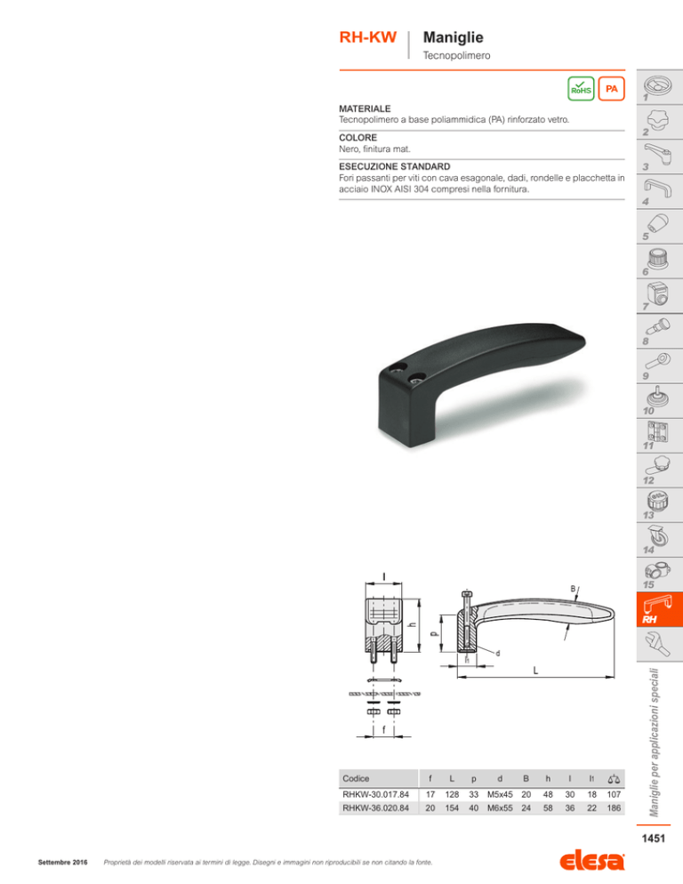 RH-KW Maniglie Tecnopolimero RoHS PA 1 MATERIALE Tecnopolimero a base poliammidica (PA) rinforzato vetro. 2 COLORE Nero, finitura mat. ESECUZIONE STANDARD Fori passanti per viti con cava esagonale, dadi, rondelle e placchetta in acciaio INOX AISI 304 compresi nella fornitura. 3 4 5 6 7 8 9 10 11 12 13 14 15 Codice f L B h l l1 RHKW-30.017.84 17 128 33 M5x45 20 p d 48 30 18 107 RHKW-36.020.84 20 154 40 M6x55 24 58 36 22 186 Maniglie per applicazioni speciali RH 1451 Settembre 2016 Proprietà dei modelli riservata ai termini di legge. Disegni e immagini non riproducibili se non citando la fonte.