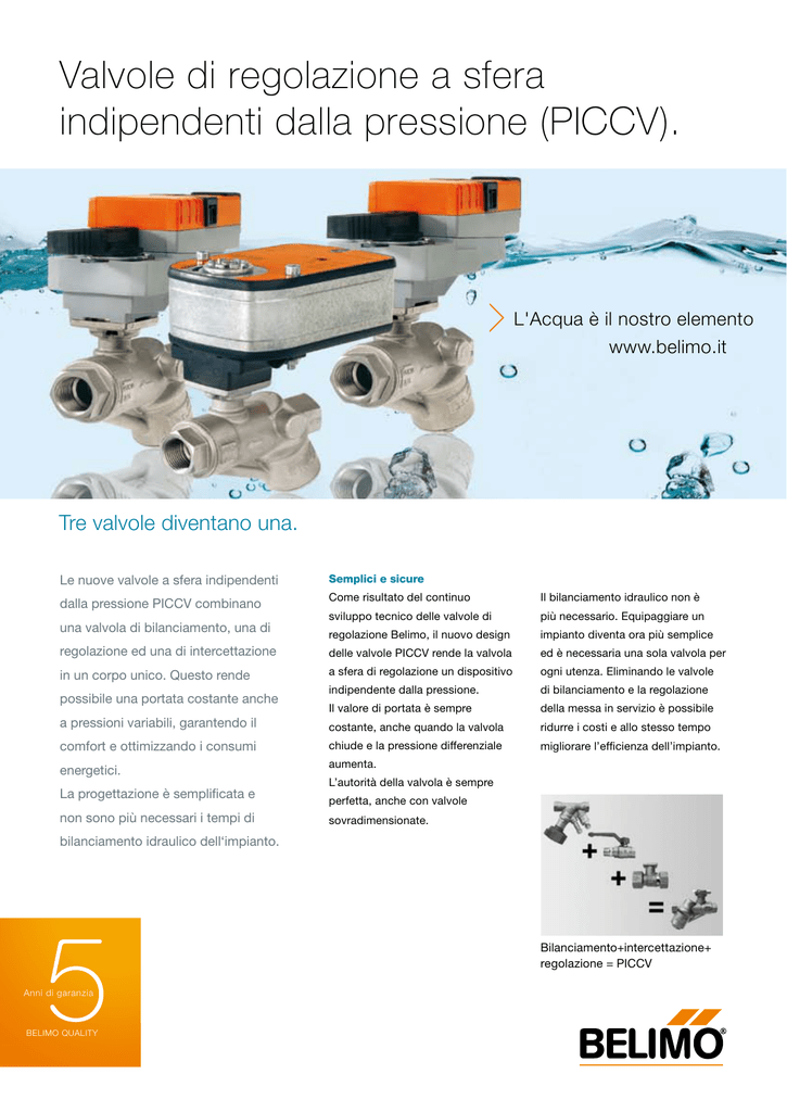 Valvole di regolazione a sfera indipendenti dalla pressione (PICCV). L'Acqua è il nostro elemento www.belimo.it Tre valvole diventano una. Le nuove valvole a sfera indipendenti Semplici e sicure dalla pressione PICCV combinano Come risultato del continuo Il bilanciamento idraulico non è sviluppo tecnico delle valvole di più necessario. Equipaggiare un regolazione Belimo, il nuovo design impianto diventa ora più semplice regolazione ed una di intercettazione delle valvole PICCV rende la valvola ed è necessaria una sola valvola per in un corpo unico. Questo rende a sfera di regolazione un dispositivo ogni utenza. Eliminando le valvole indipendente dalla pressione. di bilanciamento e la regolazione Il valore di portata è sempre della messa in servizio è possibile costante, anche quando la valvola ridurre i costi e allo stesso tempo comfort e ottimizzando i consumi chiude e la pressione differenziale migliorare l’efficienza dell’impianto. energetici. aumenta. una valvola di bilanciamento, una di possibile una portata costante anche a pressioni variabili, garantendo il La progettazione è semplificata e non sono più necessari i tempi di L’autorità della valvola è sempre perfetta, anche con valvole sovradimensionate. bilanciamento idraulico dell‘impianto. Bilanciamento+intercettazione+ regolazione = PICCV Anni di garanzia BELIMO QUALITY Le valvole di regolazione a sfera indipendenti dalla pressione (PICCV)* determinano i nuovi standards. La sfida renziale tra tubazione di mandata e ritorno è molto più elevata di quanto non sia alla fine della linea (# n). Con la portata nominale la capacità di fornire ogni utenza Δp da parte della pompa dipende dalla rete idraulica scelta (DN, tipo e lunghezza tubi) e dalla pressione differenziale minima all’ultima utenza (perdita di carico utenza e valvola). Il risparmio di energia a parità di comfort e bassi costi di installazione sono le richieste principali nella realizzazione di nuovi edifici e nelle opere di ristrutturazione. La corretta scelta di valvole per tutto l’impianto e un bilanciamento idraulico professionale risultano molto costosi. Le valvole sono convenzionalmente p100 Diagramma pressione a pieno carico La pressione differenziale Δp#1consiste nella perdita di carico dell’utenza T #1, della valvola V #1 e di quella di bilanciamento D #1. La valvola V #1 in questo caso è aperta. Se questa valvola chiude, la pressione può Valve opening Autorità valvola Pv La soluzione Come risultato del continuo sviluppo tecnico delle valvole di regolazione Belimo, il nuovo design delle valvole PICCV rende la valvola a sfera di regolazione un dispositivo indipendente dalla pressione. Il valore di portata è sempre costante, anche quando la valvola chiude e la pressione differenziale aumenta. L’autorità della valvola è sempre perfetta, anche con valvole sovradimensionate. I vantaggi Esempio: Edificio di uffici a più piani scelte con un’autorità di 0.5 e installate prima di ogni utenza (es. batteria, radiatore ecc.). Le condizioni di pressione variano in funzione della posizione dell’utenza e del carico. Nel caso di utenze (# 1) vicine alla pompa principale, la pressione diffe- aumentare fino a Δp #1, l’autorità della valvola diminuisce notevolmente e la portata aumenta in modo non proporzionale. Il bilanciamento idraulico non è più necessario. Equipaggiare un impianto diventa ora più semplice ed è necessaria una sola valvola per ogni utenza. Eliminando le valvole di bilanciamento e la regolazione della messa in servizio è possibile ridurre i costi e allo stesso tempo migliorare l’efficienza dell’impianto. R2…P: il modo più semplice di controllare la portata Riduzione pressione Diagramma portata R220P Valvole di regolazione 100% 90% 80% 70% 60% 50% 40% Portata Pressione mandata 0 Una sola valvola per ogni utenza: Posizione apertura [l/s] 0,8 30 * Pressure Independent Characterized Control Valve pressionedifferenziale (pressione effettiva) TM 350 [kPa] prima adesso Principio di funzionamento Rappresentazione in sezione della valvola di regolazione R2...P Semplice montaggio dell’attuatore rotativo tramite una vite centrale Identica flangia di montaggio per tutte le dimensioni Disaccoppiamento termico tra attuatore e valvola di regolazione Disco di regolazione Belimo per caratteristica di portata equipercentuale Feritoia di ventilazione per eliminare accumulo di condensa Otturatore in ottone per riduzione pressione Gabbia di riduzione pressione realizzata in Delrin 500 Perno con 2 0-rings Attacchi filetto interno (BSP secondo ISO 7/1) Sfera cromata Corpo in ottone stampato, nichelato Sede in Teflon con O-ring per una tenuta completa e bassa coppia di azionamento Diaframma di regolazione pressione in poliestere rinforzato silicone Molla in acciaio (non visibile) che sostiene il diaframma di regolazione pressione [AB] [A] Misura della pressione differenziale esente da manutenzione Direzione flusso Le caratteristiche La gamma La motorizzazione La valvola di regolazione indipendente dalla pressione R2...P include due valvole: una di riduzione della pressione autoregolante [A] e una di regolazione [AB] con caratteristica equipercentuale. Quando la pressione differenziale aumenta, la valvola di riduzione pressione chiude e assicura una pressione costante sulla valvola di regolazione. Questo è necessario per il mantenimento di una portata costante ±5 % (ad una pressione differenziale da 30…350 kPa) con l’attuale posizione della valvola di regolazione. La gamma di valvole a sfera di regolazione indipendenti dalla pressione, comprende: L’ottima funzionalità delle valvole di regolazione indipendenti dalla pressione è assicurata dalla motorizzazione Belimo. In funzione dell’applicazione, la valvola di regolazione indipendenti dalla pressione viene fornita con diverse motorizzazioni nelle gamme di attuatori LR.. e NR... che a seconda del modello, possono essere controllate da sistemi con segnale 3-punti o m