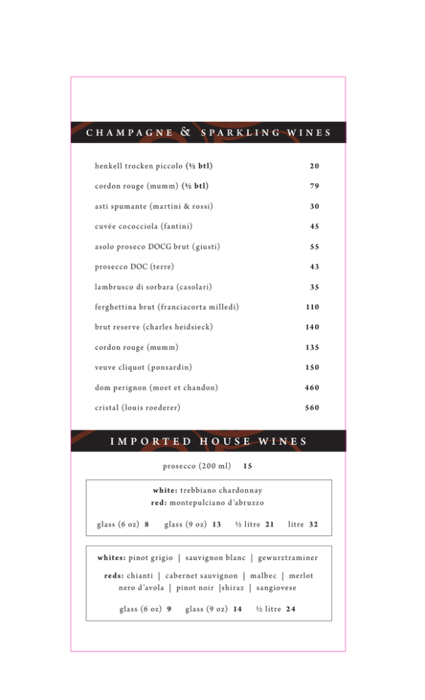 ch a mpagne & spar kling wines hen kel l t rocken piccolo (½ bt l) 20 cordon rouge (mu m m) (½ bt l) 79 a st i spu ma nte (ma r t i n i & rossi) 30 c uvée cococc iola (fa nt i n i) 45 a solo proseco docg br ut (g iu st i) 55 prosecco DOC (ter re) 43 la mbr u sco d i sorba ra (c a sola r i)35 ferg het t i na br ut (f ra nc iacor t a m i l led i) 110 br ut reser ve (cha rles heid sieck) 14 0 cordon rouge (mu m m) 135 veuve cl iquot (pon sa rd i n) 150 dom per ig non (moet et cha ndon) 4 6 0 56 0 c r i st a l (lou i s roederer) imported house wines 15 prosecco (2 0 0 m l) wh ite: t rebbia no cha rdon nay red: montepu lc ia no d ’abr u zzo g la ss (6 oz) 8 g la ss (9 oz) 13 ½ l it re 21 l it re 32 wh ites: pi not g r ig io | sauv ig non bla nc | gew u r zt ra m i ner reds: ch ia nt i | c aber net sauv ig non | ma lbec | merlot nero d ’avola | pi not noi r |sh i ra z | sa ng iovese g la ss (6 oz) 9 g la ss (9 oz) 14 ½ l it re 2 4 white wines cha rdon nay (mcla ren s on t he la ke –au st ra l ia) 34 cha rdon nay dei c a r n i (g iu st i–it a ly) 40 cha rdon nay (wente –u sa) 44 cha rdon nay reser ve vqa (m i ssion h i l l–bc) 48 cha rdon nay st a r mont (c a r neros–u sa) 77 cha rdon nay sonoma (la c rema–u sa) 70 cha rdon nay venez ia g iu l ia (jer ma n n–it a ly) 77 f ia no d i avel l i no (vesevo –it a ly) 34 gew u r zt ra m i ner vqa (bla sted chu rch–bc) 35 g reco d i t u fo (feud i sa n g regor io –it a ly) 62 luga na (z enato –it a ly) 85 monte del f rà (c à del mag ro –it a ly) 42 pi not g r i s vqa (geh r i nger–bc) 34 pi not g r ig io le r i me (ba n f i–it a ly) 34 pi not g r ig io v a l d ’ad ige (sa nt a ma rg her it a–it a ly) (½ bt l) 27 pi not g r ig io del le venez ie (g iu st i–it a ly) 4 0 pi not g r ig io v a l d ’ad ige (sa nt a ma rg her it a–it a ly) 42 pi not g r ig io venez ia g iu l ia (jer ma n n–it a ly) 76 pou i l ly–f u i sse (cha r t ron & t rebuchet–f ra nce) 85 r iesl i ng vqa (i n n i sk i l l i n–bc) 32 sauv ig non bla nc (er ra z u r i z– ch i le) 32 sauvignon blanc (kim crawford–new zealand) (½ btl) 28 sauv ig non bla nc (k i m c raw ford–new z ea la nd) 44 sem i l lon-sauv ig non bla nc– st . ha l let t (poacher’s–au st ra l ia) 35 t rebbia no (z acc ag n i n i–it a ly) 45 v i nt age t u n i na bia nco (jer ma n n–it a ly) 16 0 reds from around the world 46 a ma lay a v i no t i nto de a lt u ra (botega a ma lay a–a rgent i na) c aber net f ra nc (black sage –bc) 58 c aber net-merlot vqa (bla sted chu rch–bc) 60 22 c aber net sauv ig non yel low label (wol f bla ss–au st ra l ia) (½ bt l) c aber net sauv ig non (mona st rel l– spa i n) 32 c aber net sauv ig non (j. loh r–u sa) (½ bt l) 30 42 c aber net sauv ig non reser ve (er ra z u r it z ma x– ch i le) c aber net sauv ig non (hess selec t–u sa) 55 c aber net sauv ig non (sera f i no –au st ra l ia) 56 c aber net sauv ig non (rod ney st rong–u sa) 56 c aber net sauv ig non (bu r row i ng ow l–bc) 76 c aber net sauv ig non (f u se –u sa) c aber net sauv ig non (c a n nonba l l–u sa) c aber net sauv ig non (duck hor n–u sa) 80 65 16 6 c aber net/c a r menere orga n ic (cono su r– ch i le) 34 chateau neu f du pape (la foi le –f ra nce) 92 ma lbec (pa sc u a l toso l i m ited–a rgent i na) 40 ma r i ly n merlot (napa v a l ley–u sa) 85 merlot “yel low label ” (wol f bla ss–au st ra l ia) 38 merlot “t wo v i nes” (colu mbia c rest–u sa) 40 merlot vqa (bu r row i ng ow l–bc) 65 obsidea na blend (rock w a l l–u sa) 60 osoyoos la rose (le g ra nd v i n–bc) 99 pi not noi r (seven ter races–new z ea la nd) 45 pi not noi r vqa (i n n i sk i l l i n–bc) 44 pi not noi r (shea w i ne cel la rs– oregon u sa) sh i ra z “ black chook ” (woop woop –au st ra l ia) sh i ra z (sera f i no –au st ra l ia) 14 0 46 57 sh i ra z (t h i st ledow n–au st ra l ia) 75 sh i ra z-c ab-pet it verdot (w i r ra w i r ra–au st ra l ia) 43 tor re muga r ioja 19 98 (spa i n) 180 z i n fa ndel (rod ney st rong–u sa) 54 I ta l i a n r e d w i n e s a ma rone del la v a lpol icel la (cor te majol i) a ma rone del la v a lpol icel la (g iu st i) 110 225 a ma rone “cost a sera” (ma si) (½ bt l) a ma rone (bol la) 65 102 a ma rone “cost a sera” (ma si) 115 110 a ma rone del la v a lpol icel la (tom ma si) (½ bt l) 70 a ma rone (br u nel l i) a ma rone del la v a lpol icel la (tom ma si) a ma rone (sper i) 180 ba rba resco (bat a siolo) ba rba resco (produt tor i) 125 70 10 0 ba rolo (font a na f redd a– ser ra lu nga) ba rolo r i ser v a (bat a siolo) 10 0 ba rolo “ la ser ra” (ma rc a r i n i) ba rolo pred a sa r ma ssa (v i r na) 10 0 110 150 ba rolo (rocche del l ’ a n nu n z iat a) (½ bt l) br u nel lo d i mont a lc i no (scopone) br u nel lo d i mont a lc i no c a stelg iocondo (f rescoba ld i) 62 10 0 125 I ta l i a n r e d w i n e s br u nel lo d i mont a lc i no (c a stel lo ba n f i) 130 br u nel lo d i mont a lc i no (i l pog g ione) 170 br u nel lo d i mont a lc i no (verbena) 110 br u nel lo d i mont a lc i no “ luce” (f rescoba ld i) 230 c aber net sauv ig non (c a r pi neto) 80 c a mpo a i sa ssi rosso d i mont a lc i no (f rescoba ld i) 50 c a n nonau d i Sa rdeg na (a rg iola s costera) 50 ch ia nt i r u f i na r i ser v a “n ippozz a no” (f rescoba ld i) (½ bt l) 28 ch ia nt i r u f i na r i ser v a “n ippozz a no” (f rescoba ld i) 53 ch ia nt i cla ssico (brol io) 65 ch ia nt i cla ssico r i ser v a duc a le (r u f f i no) 64 ch ia nt i cla ssico r i ser v a duc a le “oro” (r u f f i no) 10 4 “c ig na le” tosc a na (c a stel lo d i querceto) 150 10 0 c resa sso cor v i na veronese (z enato) dolcet to d i dog l ia n i (lu ig i ei naud i) ed i z ione c i nque (fa r nese) foja nag he (ma si) 52 85 60 i l br uc iato (g u ado a l t a sso) 70 la ma ssa tosc a no (la ma ssa) 60 le ser re nuove (or nel la ia) 130 le volte (tenut a del l or nel la i