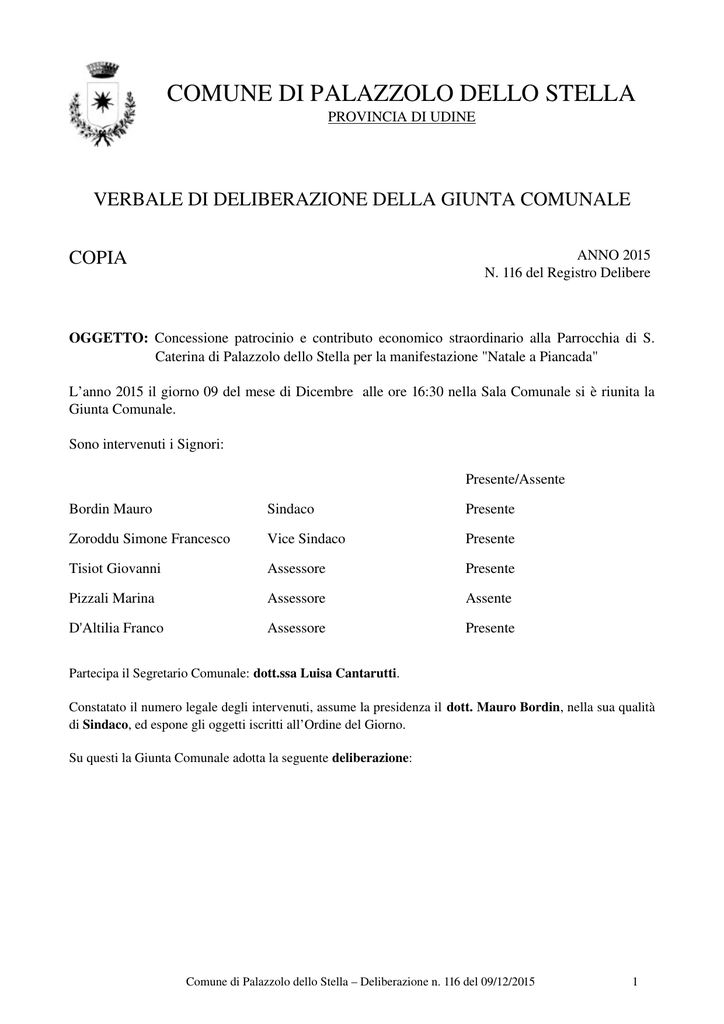 COMUNE DI PALAZZOLO DELLO STELLA PROVINCIA DI UDINE VERBALE DI DELIBERAZIONE DELLA GIUNTA COMUNALE ANNO 2015 N. 116 del Registro Delibere COPIA OGGETTO: Concessione patrocinio e contributo economico straordinario alla Parrocchia di S. Caterina di Palazzolo dello Stella per la manifestazione "Natale a Piancada" L’anno 2015 il giorno 09 del mese di Dicembre alle ore 16:30 nella Sala Comunale si è riunita la Giunta Comunale. Sono intervenuti i Signori: Presente/Assente Bordin Mauro Sindaco Presente Zoroddu Simone Francesco Vice Sindaco Presente Tisiot Giovanni Assessore Presente Pizzali Marina Assessore Assente D'Altilia Franco Assessore Presente Partecipa il Segretario Comunale: dott.ssa Luisa Cantarutti. Constatato il numero legale degli intervenuti, assume la presidenza il dott. Mauro Bordin, nella sua qualità di Sindaco, ed espone gli oggetti iscritti all’Ordine del Giorno. Su questi la Giunta Comunale adotta la seguente deliberazione: Comune di Palazzolo dello Stella – Deliberazione n. 116 del 09/12/2015 1 OGGETTO: Concessione patrocinio e contributo economico straordinario alla Parrocchia di S. Caterina di Palazzolo dello Stella per la manifestazione "Natale a Piancada" LA GIUNTA COMUNALE ASCOLTATO il relatore che espone la proposta di seguito riportata: VISTA la nota assunta al prot. n. 9814 del 26.11.2015 con la quale il parroco di Palazzolo dello Stella ha richiesto a questo Comune il patrocinio (uso del logo del Comune) per la manifestazione “Natale a Piancada” che si terrà a Piancada presso la Parrocchia di Santa Caterina il 13 dicembre p.v.; TENUTO CONTO che in tale nota si è richiesto un contributo straordinario di Euro 200,00=. Per il presepe luminoso che verrà posizionato nel cortile della ex canonica. DATO ATTO che secondo quanto sancito dallo Statuto Comunale, all’art. 13, 2°comma, il Comune assicura, tra l’altro, la valorizzazione, la tutela e la fruizione del patrimonio culturale favorendo la crescita di organismi di cultura a base istituzionale o associativa e all’art. 15, 1°comma, il Comune contribuisce, tra l’altro, alla diffusione delle attività del tempo libero a favore dei cittadini; RICHIAMATO il “Contratto di Concessione del Servizio di accertamento e riscossione dell’imposta comunale sulla pubblicità e del diritto sulle pubbliche affissioni” i benefici previsti dall’art. 26 – Riduzioni dell’imposta (art. 16 D.Lgs n. 507/93) del “Regolamento Comunale dell’imposta sulla pubblicità, diritto sulle pubbliche affissioni ed effettuazione del servizio” che consente, alle associazioni senza scopo di lucro, che hanno ottenuto il patrocinio o la partecipazione degli enti pubblici territoriali, la pubblicazione delle locandine con tariffa ridotta alla metà. RITENUTO pertanto di collaborare alla realizzazione dell’iniziativa sopraccitata concedendo il patrocinio richiesto consistente nell’uso del logo dell’Ente ed un contributo straordinario pari ad Euro 100,00=. VERIFICATO che: l’affissione delle locandine pubblicitarie ha tariffa ridotta alla metà ai sensi dell’art. 16 del suddetto Regolamento Comunale; verrà erogato un contributo economico straordinario pari ad Euro 100,00=; per cui ai sensi degli artt. 26 e 27, d.lgs. n. 33/2013 sulla base della Delibera CiVIT 15/07/2013, n. 59 – CiVIT, dal presente atto deriva la concessione di benefici economici pari ad Euro 100,00=; VISTO l’allegato parere tecnico espresso dal competente Responsabile di Servizio ai sensi dell’art. 49 del D.Lgs.vo 267/2000; VISTO l’allegato parere di regolarità contabile espresso dal competente Responsabile di Servizio ai sensi dell’art. 49 del D.Lgs.vo 267/2000; Con voto unanime e palese; DELIBERA di approvare, per le considerazioni esposte in premessa, quanto segue: DI APPROVARE i richiami, le premesse e l’intera narrativa quali parti integranti e sostanziali del dispositivo; DI CONCEDERE alla Parrocchia di S. Caterina di Palazzolo dello Stella il patrocinio consistente nell’uso del logo del Comune su tutto il materiale pubblicitario realizzato per la manifestazione “Natale a Piancada” che si terrà a Piancada il 13 dicembre p.v.; DI CONCEDERE, inoltre, un contributo economico straordinario pari ad Euro 100,00=. Per il presepe luminoso che verrà posizionato nel cortile della ex canonica.; DI CONSIDERARE la tariffa per l’esposizione delle locandine pubblicitarie ridotta alla metà, ai sensi del “Regolamento Comunale dell’imposta sulla pubblicità, diritto sulle pubbliche affissioni ed effettuazione del servizio” (art. 26); DI DARE ATTO che ai sensi degli artt. 26 e 27, d.lgs. n. 33/2013 sulla base della Delibera CiVIT 15/07/2013, n. 59 – CiVIT, dal presente atto deriva la concessione di benefici economici pari ad Euro 100,00=; DI DARE ATTO che l’Ufficio proponente provvederà a dare esecuzione a tutti i successivi adempimenti conseguenti al presente atto, compresa ogni comunicazione connessa o discendente dal presente; DI DARE ATTO che il PO responsabile del servizio, provvederà, a sua cura, all’adempimento di tutti gli eventuali obblighi di pubblicità, trasparenza discendenti dal presente atto previsti dal D.Lgs 33/2013 nonché dal Piano anticorruzione adottato dall’Ente con deliberazione di Giunta comunale n. 10 del 28.01.2015; DI DARE ATTO, ai sensi del combinato disposto dall’art.147bis del D.Lgs. n.267/2000 così come modificato dalla Legge n. 213/2012 e dall’art.6 comma 3 del Regolamento Comunale sui Controlli Interni, che il presente provvedimento rispetta i requisiti di regolarità e correttezza dell’azione amministrativa e che sussistono tutti i presupposti di regolarità tecnica; DI COMUNICARE l’esito al richiedente; LA GIUNTA COMUNALE Con votazione unanime e palese, DELIBERA di dichiarare, ai sensi della L.R. 21/2003, il presente atto immediatamente esecutivo, attesa l’urgenza di provvedere. Comune di Palazzolo dello Stella – Deliberazione n. 116 del 09/12/2015 3 COMUNE DI PALAZZOLO D