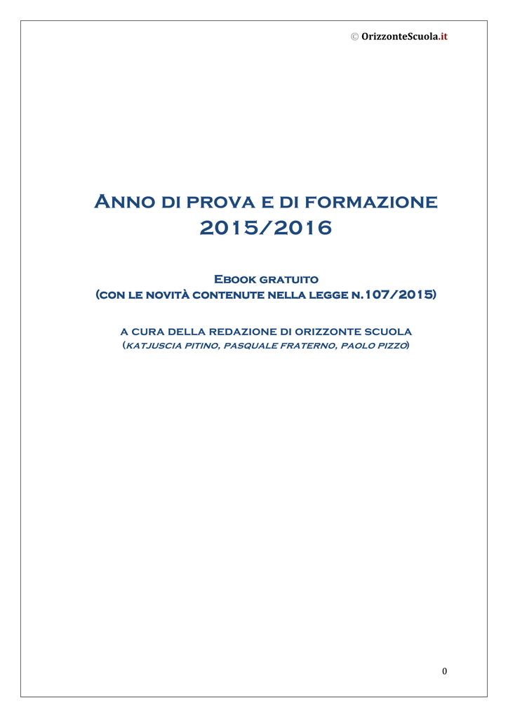 © OrizzonteScuola.it Anno di prova e di formazione 2015/2016 Ebook gratuito (con le novità novità contenute nella legge n.107/2015 n.107/2015) 107/2015) a cura della redazione di orizzonte scuola (katjuscia pitino, pasquale fraterno, paolo pizzo) 0 © OrizzonteScuola.it INDICE 1. Anno di prova e di formazione: tra novità e conferme (PAOLO PIZZO) ............................................................................................................. .2 2. Anno di prova e di formazione e documentazione di rito (PASQUALE FRATERNO) ........................................................................................... 4 3. Anno di prova: periodi di servizio utili a raggiungere i 180 giorni (PAOLO PIZZO) ...................................................................................... 6 4. Anno di prova: quante volte è possibile rimandarlo se non si raggiungono i 180 gg. di servizio (PAOLO PIZZO) ................................. 7 5. Anno di prova: quante volte è possibile rimandarlo in caso di valutazione negativa (PAOLO PIZZO).................................................... 9 6. Periodo di prova e di formazione per il docente che ottiene passaggio di cattedra o di ruolo (PAOLO PIZZO) ................................................... 9 7. Il comitato per la valutazione del servizio dei docenti (KATJUSCIA PITINO) ............................................................................................... 12 8. Membri comitato di valutazione e collaboratori del dirigente possono essere retribuiti (REDAZIONE) ............................................................ 17 9. Il nuovo percorso/modello sperimentale di formazione in ingresso (PAOLO PIZZO) .................................................................................... 18 1 © OrizzonteScuola.it ANNO DI PROVA E DI FORMAZIONE: TRA NOVITÀ E CONFERME (PAOLO PIZZO) Il personale docente e direttivo della scuola e delle istituzioni educative è nominato in prova. La nomina decorre dalla data di inizio dell’anno scolastico. Il personale docente così nominato, è ammesso a un anno di formazione, che è valido come periodo di prova (art. n. 437 del D.L.vo 16.04.1994 n. 297). Il personale docente, all’atto dell’assunzione in ruolo, che avviene con la stipula del contratto di lavoro a tempo indeterminato, deve sostenere il periodo di prova allo scopo di ottenere la conferma in ruolo. La prova è dunque il periodo durante il quale quale questo personale deve prestare servizio. Il periodo di prova è considerato servizio di ruolo in tutti i sensi e dispiega, pertanto, effetti per il regime delle assenze, per la progressione dell’anzianità ai fini della carriera ecc. Solo dopo il superamento superamento del periodo di prova, è possibile che il personale confermato in ruolo possa chiedere la ricostruzione di carriera, i cui effetti decorrono dal momento stesso della conferma (art. n. 490 del D.L.vo 16.04.1994 n. 297). Nell’anno scolastico in cui si è stati stati assunti a tempo indeterminato, la sede di servizio è provvisoria. Nel corso del medesimo anno, secondo la tempistica e le procedure dettate dal MIUR, il personale presenterà la domanda di trasferimento ed eventualmente, in un secondo momento, istanza di assegnazione/utilizzo (tali procedure, procedure, se confermate anche per il 2015/16, non sono vincolate al superamento dell’anno di prova). La legge 107/2015 all’art. 1 commi 116-119 ha disciplinato le procedure relative all’anno anno di prova dei docenti assunti a tempo indeterminato: indeterminato 2 © OrizzonteScuola.it “116. 116. Il superamento del periodo di formazione e di prova è subordinato allo svolgimento del servizio effettivamente prestato per almeno centottanta giorni, dei quali almeno centoventi per le attività didattiche. 117. Il personale docente ed educativo in periodo di formazione e di prova è sottoposto a valutazione da parte del dirigente scolastico, sentito il comitato per la valutazione istituito ai sensi dell'articolo 11 del testo unico di cui al decreto legislativo 16 aprile 1994, n. 297, come sostituito dal comma 129 del presente articolo, sulla base dell'istruttoria di un docente al quale sono affidate dal dirigente scolastico le funzioni di tutor. 118. Con decreto del Ministro dell'istruzione, dell'università e della ricerca sono individuati gli obiettivi, le modalità di valutazione del grado di raggiungimento degli stessi, le attività formative e i criteri per la valutazione del personale docente ed educativo in periodo di formazione e di prova. 119. In caso di valutazione negativa del periodo di formazione e di prova, il personale docente ed educativo è sottoposto ad un secondo periodo di formazione e di prova, non rinnovabile. 120. Continuano ad applicarsi, in quanto compatibili con i commi da 115 a 119 del presente articolo, gli articoli da 437 a 440 del testo unico di cui al decreto legislativo 16 aprile 1994, n. 297.” La novità introdotta è quella che richiede, nell’ambito dei 180 giorni validi per il compimento del periodo di prova, che almeno 120 siano stati prestati per le attività didattiche. didattiche Per il resto, nulla è innovato, pertanto rimangono in vigore, per quanto compatibili con le nuove norme, gli articoli da 437 a 440 del T.U. 297/94. 297/94 3 © OrizzonteScuola.it È altresì riconfermata la procedura di formazione, con il modello 20142015: 50 ore complessive, in presenza e a distanza, attività peer to peer e laboratori didattici coordinati dai tutor. Forse l'unica novità potrebbe essere rappresentata dalla volontà di far partire i corsi durante l'anno scolastico, e non alla fine. ANNO DI PROVA E DI FORMAZIONE E DOCUMENTAZIONE DI RITO (PASQUALE FRATERNO) Il Personale Docente all’atto della nomina in ruolo = dopo aver sottoscritto il contratto individuale di lavoro a tempo indeterminato = è tenuto ad espletare una serie di adempimenti e presentazione di documenti: OBBLIGATORI che dimostrano i requisiti per l