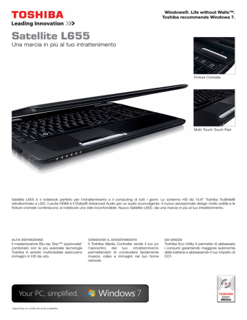 Windows®. Life without Walls™. Toshiba recommends Windows 7. Satellite L655 Una marcia in più al tuo intrattenimento Finiture Cromate Multi-Touch Touch Pad Satellite L655 è il notebook perfetto per l‘intrattenimento e il computing di tutti i giorni. Lo schermo HD da 15.6“ Toshiba TruBrite® retroilluminato a LED, l‘uscita HDMI e il Dolby® Advanced Audio per un audio sconvolgente. Il nuovo sensazionale design molto sottile e le finiture cromate conferiscono al notebook uno stile inconfondibile. Nuovo Satellite L655: dai una marcia in più al tuo intrattenimento. ALTA DEFINIZIONE CONDIVIDI IL DIVERTIMENTO GO GREEN Il masterizzatore Blu-ray Disc™ (opzionale)* combinato con le più avanzate tecnologie Toshiba in ambito multimediale assicurano immagini in HD da urlo. Il Toshiba Media Controller rende il tuo pc l‘epicentro del tuo intrattenimento permettendoti di condividere facilemente musica, video e immagini nel tuo home network. Toshiba Eco Utility ti permette di abbassare i consumi garantendo maggiore autonomia della batteria e abbassando il tuo impatto di CO². *depending on model and local availability Satellite L655-1JM PSK1JE-0HH00HIT 4026203882317 Intel® Core™ i5-480M Processor (2.66 / 2.93 Turbo GHz, 3 MB Cache di terzo livello, 1,066 MHz FSB) Processore / Tecnologia Sistema operativo Windows® 7 Home Premium Autentico 64-bit Colore del design Steel Grey Metallic with Dual Mesh pattern and silver chrome accents, black keyboard 39.6cm (15.6”) Toshiba TruBrite® HD TFT High Brightness display with 16 : 9 aspect ratio and LED backlighting, Risoluzione: 1,366 x 768 Schermo 500 GB (5,400 rpm) Serial ATA Disco rigido 4,096 (2,048 + 2,048) MB, Espandibile fino a: 8,192 MB, Tecnologia: DDR3 RAM (1,066 MHz) Memoria di sistema Dispositivo ottico DVD Super Multi (Double Layer) drive Adattatore grafico ATI Mobility Radeon™ HD 5470 supporting HyperMemory™ technology, 512 MB dedicated VRAM (total available graphics memory using HyperMemory™ technology can be up to 1,755 MB with a 32-bit operating system and 3 GB system memory or 3,571 MB with a 64-bit operating system and 8 GB system memory) Sistema di puntamento Touch Pad with Multi-Touch Control Comunicazione via cavo Fast Ethernet LAN Comunicazione wireless Bluetooth® 2.1 + EDR , Wireless LAN 802.11b/g/n built-in stereo speakers , Regolatore del volume: by hot key function, Toshiba Bass Enhanced Sound System with Dolby® Advanced Audio Sistema audio Interfacce 1 x HDMI supporting 1080p signal format , 1 x Video Camera integrata da 0.3 Megapixels con microfono , 1 x Microfono esterno , 1 (Left) x eSATA/USB 2.0 , 1 x DC-in , 1 x Multi-Card Reader (supports SD™ Cards up to 64 GB, Memory Stick® up to 256 MB, Memory Stick Pro™ up to 16 GB and MultiMedia Card™ up to 2 GB) , 1 x Monitor esterno , 1 x cuffie (stereo) , 1 x RJ-45 , 2 (Right 2) x USB 2.0 Espansioni slot di memoria (1 da configurare) Tecnologia: lithium-ion, currently no official battery benchmark result available Batteria Software in bundle Microsoft® Office Starter 2010, Windows Live Essentials, Skype, Nero BackItUp & Burn Autobackup Essentials, Nero 9 Essentials, Bing Toolbar and Bing Search, Amazon, eBay, Toshiba Recovery Media Creator, Toshiba Photo Service, WildTangent Games Console, McAfee® Internet Security (includes free Internet updates for 30 days), Toshiba Assist, ConfigFree™, Toshiba Value Added Package (Toshiba Power Saver, Toshiba Zooming Utility, Toshiba PC Diagnostic Tool, Toshiba Flash Cards, Toshiba Components Common Driver, Toshiba Accessibility, Toshiba Button Support), Toshiba Disc Creator, Chicony Camera Assistant Software, Connectivity Doctor, Utilities e drive Toshiba, Supervisor Password Utility, Toshiba Face Recognition, Manuale Utente Toshiba, Toshiba Bluetooth™ Monitor, Toshiba Bluetooth™ Stack Hardware in bundle Alimentatore Caratteristiche speciali Video Camera iintegrata da 0.3 Megapixels per Video over IP, SM BIOS compliant, Microfono integrato per Voice over IP, HD Audio supporting, Enhanced Intel® SpeedStep® Technology, ENERGY STAR qualified computer password di supervisor, Feritoia per cavo Kensington Lock, Password per HDD su richiesta, Password di utenza Funzioni di sicurezza 380.0 x 250.0 x 28.0 (front) / 37.9 (rear) mm, Peso: starting at 2.50 kg Dimensioni Garanzia 1 year EMEA Carry-in. Toshiba also offers a large range of services to upgrade your standard warranty, please have a look at our website www.toshiba-europe.com/services to find the right service for your product. HDMI-out, Dolby® Advanced Audio Intrattenimento immediato Multi-Card Reader, Toshiba Face Recognition, Built-in Web Camera & Microphone, Toshiba ConfigFree™, Bluetooth® 2.1 with EDR Connettività facilitata Facilità di utilizzo McAfee® Internet Security (includes free Internet updates for 30 days), Power-saving Eco Utility, Toshiba Media Controller, Toshiba LifeSpace, PC Health Monitor, Touch Pad with Multi-Touch Control, Nero Software, Toshiba TEMPRO Performance Tuning Service, Display with LED backlighting, Smart Display Support, Microsoft® Office Starter 2010 COMPATIBLE TOSHIBA ACCESSORIES ••Notebook Starter Kit 18.4inch, PX1441E-1NSK ••Mouse ottico wireless con tecnologia Bluetooth™ colore silver, PA3573E-1ETA ••Hard Disk 500 GB 2,5“ USB - StorE Art, PA4094E-1HF0 ••1 GB USB Flash Drive, PA3556E-1M1G ••Docking Station Universale USB (DVI) , PA3542E-2PRP Notebook Starter Kit Camileo H20 Wireless Optical Mouse R300 CPU performance may vary from specifications under certain conditions such as the use of battery instead of AC power, certain external peripherals, certain multimedia applications or network connections, complex modeling software and in areas with low air pressure at high altitude (1,000 metres above sea level) and/or certain temperatures. CPU performance may also vary from specifications due to design configuration. Under some conditions, your computer may automatically shut down as a normal