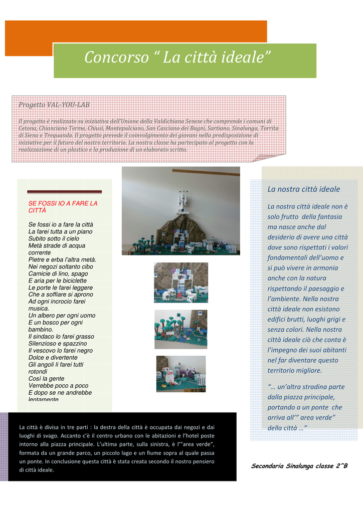 Concorso “ La città ideale” Progetto VAL-YOU-LAB Il progetto è realizzato su iniziativa dell’Unione della Valdichiana Senese che comprende i comuni di Cetona, Chianciano Terme, Chiusi, Montepulciano, San Casciano dei Bagni, Sartiano, Sinalunga, Torrita di Siena e Trequanda. Il progetto prevede il coinvolgimento dei giovani nella predisposizione di iniziative per il futuro del nostro territorio. La nostra classe ha partecipato al progetto con la realizzazione di un plastico e la produzione di un elaborato scritto. La nostra città ideale SE FOSSI IO A FARE LA CITTÀ Se fossi io a fare la città La farei tutta a un piano Subito sotto il cielo Metà strade di acqua corrente Pietre e erba l’altra metà. Nei negozi soltanto cibo Camicie di lino, spago E aria per le biciclette Le porte le farei leggere Che a soffiare si aprono Ad ogni incrocio farei musica. Un albero per ogni uomo E un bosco per ogni bambino. Il sindaco lo farei grasso Silenzioso e spazzino Il vescovo lo farei negro Dolce e divertente Gli angoli li farei tutti rotondi Così la gente Verrebbe poco a poco E dopo se ne andrebbe lentamente La città è divisa in tre parti : la destra della città è occupata dai negozi e dai luoghi di svago. Accanto c’è il centro urbano con le abitazioni e l’hotel poste intorno alla piazza principale. L’ultima parte, sulla sinistra, è l’”area verde”, formata da un grande parco, un piccolo lago e un fiume sopra al quale passa un ponte. In conclusione questa città è stata creata secondo il nostro pensiero di città ideale. La nostra città ideale non è solo frutto della fantasia ma nasce anche dal desiderio di avere una città dove sono rispettati i valori fondamentali dell’uomo e si può vivere in armonia anche con la natura rispettando il paesaggio e l’ambiente. Nella nostra città ideale non esistono edifici brutti, luoghi grigi e senza colori. Nella nostra città ideale ciò che conta è l’impegno dei suoi abitanti nel far diventare questo territorio migliore. “… un’altra stradina parte dalla piazza principale, portando a un ponte che arriva all’” area verde” della città …” Secondaria Sinalunga classe 2^B