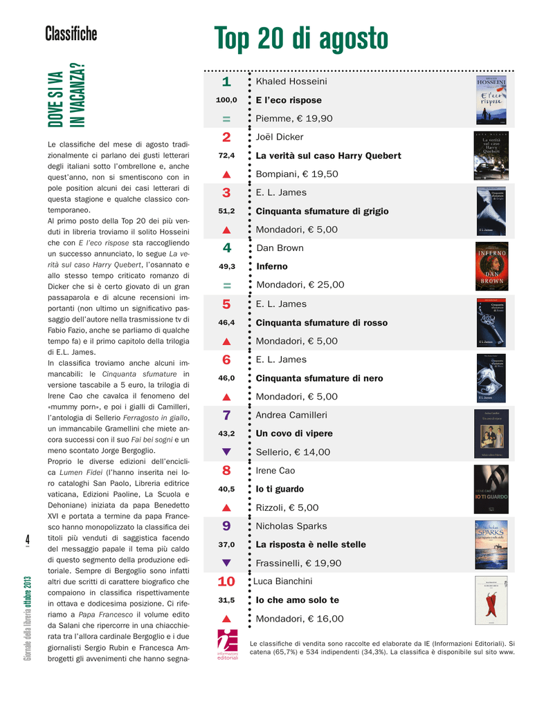 dove si va in vacanza? Classifiche Giornale della libreria ottobre 2013 4 Le classifiche del mese di agosto tradizionalmente ci parlano dei gusti letterari degli italiani sotto l’ombrellone e, anche quest’anno, non si smentiscono con in pole position alcuni dei casi letterari di questa stagione e qualche classico contemporaneo. Al primo posto della Top 20 dei più venduti in libreria troviamo il solito Hosseini che con E l’eco rispose sta raccogliendo un successo annunciato, lo segue La verità sul caso Harry Quebert, l’osannato e allo stesso tempo criticato romanzo di Dicker che si è certo giovato di un gran passaparola e di alcune recensioni importanti (non ultimo un significativo passaggio dell’autore nella trasmissione tv di Fabio Fazio, anche se parliamo di qualche tempo fa) e il primo capitolo della trilogia di E.L. James. In classifica troviamo anche alcuni immancabili: le Cinquanta sfumature in versione tascabile a 5 euro, la trilogia di Irene Cao che cavalca il fenomeno del «mummy porn», e poi i gialli di Camilleri, l’antologia di Sellerio Ferragosto in giallo, un immancabile Gramellini che miete ancora successi con il suo Fai bei sogni e un meno scontato Jorge Bergoglio. Proprio le diverse edizioni dell’enciclica Lumen Fidei (l’hanno inserita nei loro cataloghi San Paolo, Libreria editrice vaticana, Edizioni Paoline, La Scuola e Dehoniane) iniziata da papa Benedetto XVI e portata a termine da papa Francesco hanno monopolizzato la classifica dei titoli più venduti di saggistica facendo del messaggio papale il tema più caldo di questo segmento della produzione editoriale. Sempre di Bergoglio sono infatti altri due scritti di carattere biografico che compaiono in classifica rispettivamente in ottava e dodicesima posizione. Ci riferiamo a Papa Francesco il volume edito da Salani che ripercorre in una chiacchierata tra l’allora cardinale Bergoglio e i due giornalisti Sergio Rubin e Francesca Ambrogetti gli avvenimenti che hanno segna- Top 20 di agosto 1 100,0 Khaled Hosseini E l’eco rispose = Piemme, € 19,90 2 Joël Dicker 72,4 La verità sul caso Harry Quebert p Bompiani, € 19,50 3 E. L. James 51,2 Cinquanta sfumature di grigio p Mondadori, € 5,00 4 Dan Brown 49,3 Inferno = Mondadori, € 25,00 5 E. L. James 46,4 Cinquanta sfumature di rosso p Mondadori, € 5,00 6 E. L. James 46,0 Cinquanta sfumature di nero p Mondadori, € 5,00 7 Andrea Camilleri 43,2 Un covo di vipere q Sellerio, € 14,00 8 Irene Cao 40,5 Io ti guardo p Rizzoli, € 5,00 9 Nicholas Sparks 37,0 q 10 31,5 p La risposta è nelle stelle Frassinelli, € 19,90 Luca Bianchini Io che amo solo te Mondadori, € 16,00 Le classifiche di vendita sono raccolte ed elaborate da IE (Informazioni Editoriali). Si catena (65,7%) e 534 indipendenti (34,3%). La classifica è disponibile sul sito www. 11 Ferragosto in giallo Sellerio, € 14,00 30,0 q Walter Siti 12 Resistere non serve a niente 25,2 Rizzoli, € 17,00 p Jorge Mario Bergoglio 13 Lumen fidei. Enciclica sulla fede 24,7 San Paolo Edizioni, € 2,50 q Irene Cao 14 Io ti sento 23,0 Rizzoli, € 14,90 p Irene Cao 15 Io ti voglio 22,2 Rizzoli, € 14,90 p Roberto Saviano 16 ZeroZeroZero 20,8 Feltrinelli, € 18,00 p Arthur Schopenhauer 17 L’arte di ottenere ragione 19,7 Newton Compton, € 0,99 p Massimo Gramellini 18 Fai bei sogni 19,5 Longanesi, € 14,90 p Gotama Buddha 19 I quattro pilastri della saggezza. Ediz. integrale 19,0 Newton Compton, € 0,99 p Alessandro D’Avenia 20 Bianca come il latte, rossa come il sangue 18,6 Mondadori, € 13,00 riferiscono al periodo 1-31 agosto 2013 e raccolgono il dato di 1.555 librerie. 1.021 di giornaledellalibreria.it (sezione Numeri) = Classifiche to la vita del futuro successore di Pietro, e ad Aprite la mente al vostro cuore (Rizzoli) una raccolta di esercizi spirituali curata dal pontefice. Ma queste classifiche vacanziere non sono interessanti solo per la fotografia delle letture di svago che ci restituiscono. Osservando la Top 15 di varia possiamo infatti arrivare a ipotizzare la geografia delle ferie degli italiani: su 15 titoli in classifica ben 4 sono guide di viaggio, praticamente il 25%. In linea con i sondaggi pubblicati da siti di viaggi (si veda quello realizzato dal portale Expedia.it, per esempio) e ripresi dalla stampa nazionale, la meta più ambita per il popolo dei vacanzieri è stata Londra (il volume edito da Edt è in nona posizione) seguita dalla Croazia (sempre Edt, 10) e da New York (Edt 14). Unica meta italiana è la Sicilia (Edt 12) che si conferma la destinazione prediletta per la vacanza «made in Italy». Dall’egemonia delle guide Lonely Planet testé citate, possiamo avere conferma anche di alcuni macro fenomeni rilevati dalla ricerca di Confesercenti-Swg che ogni anno fotografa l’approccio degli italiani alla vacanze: se quasi la metà degli abitanti della Penisola ha rinunciato ad andare in vacanza e appena il 22% ha scelto e prenotato in anticipo la meta, l’acquisto della guida turistica si conferma come un vero e proprio last minute comprato pochi giorni prima di partire o addirittura quando si è già di stanza nella località turistica prescelta. Mete più vicine (Londra, la Croazia), vacanze più brevi (per quanti hanno potuto permetterselo, e secondo ConfesercentiSwg quest’anno sono stati «solamente» 25 milioni e 700 mila), meno weekend al mare (che continua ad essere la destinazione preferita), in montagna o al lago: la mappa delle ferie degli italiani è un campo di battaglia in cui il nemico principale ha un nome e cognome, si chiama crisi economica, e non ci vuole lo studio di Confesercenti per capire che è questa la causa principale della diserzione dalle vacanze di qualcosa come 14 milioni di persone. Che tutto ciò abbia una ripercussione sul settore è certo, anche se per capirne l’impatto in termini di produzione e fatturato dovremo attendere ancora qualche mese. (P. Sereni) 5 Giornale della libreria ottobre 2013 Top 20 di agosto Classi