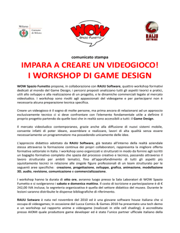 comunicato stampa IMPARA A CREARE UN VIDEOGIOCO! I WORKSHOP DI GAME DESIGN WOW Spazio Fumetto propone, in collaborazione con RAIJU Software, quattro workshop formativi dedicati al mondo del Game Design; i percorsi proposti analizzano tutti gli aspetti teorici e pratici, utili allo sviluppo e alla realizzazione di un progetto, e le dinamiche commerciali legate al mercato videoludico. I workshop sono rivolti agli appassionati del videogame e per parteciparvi non è necessaria alcuna preparazione tecnica specifica. Creare un videogioco è il sogno di molte persone, ma prima ancora di relazionarsi ad un approccio esclusivamente tecnico ci si deve confrontare con l’elemento fondamentale utile a definire il proprio progetto partendo da quelle basi che in realtà sono accessibili a tutti: il Game Design. Il mercato videoludico contemporaneo, grazie anche alla diffusione di nuovi sistemi mobile, consente infatti di poter ideare, assemblare e realizzare, lavori di alta qualità senza essere necessariamente un programmatore ma possedendo unicamente delle idee. L'approccio didattico adottato da RAIJU Software, già testato all'interno della realtà aziendale stessa attraverso la formazione continua dei propri collaboratori, rappresenta la migliore offerta formativa settoriale in Italia. I workshop sono organizzati e strutturati in modo da fornire agli iscritti un bagaglio formativo completo che spazia dal processo creativo e tecnico, passando attraverso il lavoro strutturato per ambiti tematici, fino all'approfondimento di tutti gli aspetti più squisitamente tecnici in relazione alle singole figure professionali di un team strutturato per le seguenti aree specifiche: creazione, progettazione, sviluppo, grafica, animazione, modellazione 3D, audio, revisione, comunicazione e commercializzazione. I workshop hanno la durata di otto ore, avranno luogo presso la Sala Laboratori di WOW Spazio Fumetto e si svolgeranno i sabato e domenica mattina. Il costo di iscrizione e partecipazione è di € 242,00 IVA inclusa; la segreteria organizzativa è quella del settore didattico del museo. Durante le lezioni saranno distribuite le dispense bibliografiche di riferimento. RAIJU Sotware è nata nel novembre del 2010 ed è una giovane software house italiana che si occupa di videogames; in occasione del Lucca Comics & Games 2010 ha presentato una tech demo e un workshop sul rapporto anime e videogame (realizzati in stile cell shading); è accreditata presso AIOMI quale produttore game developer ed è stato l'unico partner ufficiale italiano della manifestazione GameShow svoltasi nel 2010 al Mediolanum Forum di Assago. La società opera come sviluppatore e produttore per i principali canali digital delivery quali Intel AppUp, Apple Store, Android Market e Samsung Apps; è accreditata all’evento videoludico IVDC - Italian Videogame Developer Conference 2012 che si terrà a Rapallo come sviluppatore di software e publisher per progetti indipendenti. Roberto Ritondo è CEO di RAIJU Software e gode di una decennale esperienza nell’ambito videoludico come game designer; ha collaborato come Senior Editor per la testata giornalistica Spaziogames, per poi offrire contenuti tecnici in qualità di blogger tecnico competente in materia di game design e tecnologia per il portale Jacktech.it di Mondadori. Attualmente ricopre il ruolo di Publisher and Editorial Director della testata giornalistica UpperPad.com; è docente di game design e web marketing. I WORKSHOP SI TERRANNO PRESSO WOW SPAZIO FUMETTO – MUSEO DEL FUMETTO DI MILANO Viale Campania, 12 – 20133 Milano tel. 02 49524744/45 www.museowow.it Iscrizioni e informazioni [email protected] per pubblicazione immediata