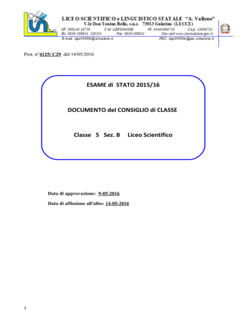 Prot. n°4125/ C29 del 14/05/2016 ESAME di STATO 2015/16 DOCUMENTO del CONSIGLIO di CLASSE Classe 5 Sez. B Liceo Scientifico Data di approvazione: 9-05-2016 Data di affissione all'albo: 14-05-2016 1 SOMMARIO 1. La scuola: informazioni generali 2. La storia della classe 3. Breve presentazione della classe 4. Alunni della classe 5. Composizione del Consiglio di Classe nel triennio 6. Situazione in ingresso della classe (6.1 Configurazione della classe; 6.2 Risultati dello scrutinio finale della classe negli aa.ss. 2013/14 e 2014/15; 6.3 Sospensioni di giudizio negli scrutini finali degli aa.ss. 2013/14 e 2014/15 ripartite per materia) 7. Risultati di apprendimento perseguiti dal Consiglio di classe in relazione al PECUP e al POF 8. Progettazioni didattiche disciplinari 9. Modulo formativo CLIL (Content and Language Integrated Learning) 10. Attività di recupero 2015/2016 11. Attività extracurricolari 12. Valutazione degli apprendimenti (12.1 Prospetto complessivo riguardante gli strumenti usati, 12.2 Numero di verifiche per tipologie; 12.3 Simulazioni di terza prova; 12.4 Simulazione/i nazionali di seconda prova). 13. 2 ALLEGATI - 13.1 Descrittori di profitto - 13.2 Descrittori di comportamento - 13.3 Criteri di assegnazione del credito scolastico e formativo - 13.4 Griglie di verifica - 13.5 Elaborati per l’avvio del colloquio d’esame 1. LA SCUOLA: INFORMAZIONI GENERALI Liceo Scientifico e Linguistico Statale “Antonio Vallone” Via Don Tonino Bello - 73013 GALATINA ( LE ) Tel./ Fax : 0836566833 Sito Web: www.liceovallone.gov.it E-Mail: [email protected] 2. PEC: [email protected] LA STORIA DELLA CLASSE La classe 5^ B è composta da n° 28 alunni (n° 14 studenti e n° 14 studentesse), provenienti da Galatina e dai paesi limitrofi di: Soleto, Galatone, Neviano, 3. BREVE PRESENTAZIONE DELLA CLASSE Classe N° alunni iscritti N° alunni frequentanti M F 5B 28 28 14 14 Comuni di proven ienza Galatina Soleto Neviano Dal 1° anno il gruppo classe era formato da 27 alunni all’inizio del quarto anno un alunna si è trasferita da altra sede. Complessivamente, nel biennio, il gruppo-classe non ha manifestato problemi di adattamento. Il lavoro costante dei docenti che, nella maggior parte delle discipline, sono rimasti gli stessi in tutto il quinquennio, e l’impegno dei ragazzi hanno prodotto esiti positivi ed un clima sereno. Nel triennio la continuità didattica è stata assicurata in tutte le discipline ad eccezione di Storia che nel terzo anno era affidato alla prof.ssa Romanello e dal quarto è stato assegnato alla prof.ssa Tommasi. La classe, non ha presentato mai problemi di carattere disciplinare, mentre dal punto di vista del profitto scolastico e dell’impegno, la classe può essere divisa in tre fasce: la prima, è costituita da un gruppo di alunni che si sono distinti per senso di responsabilità, applicazione, assiduità e motivazione, raggiungendo ottimi risultati; la seconda, più cospicua, da alunni dotati di buone potenzialità che hanno conseguito complessivamente risultati che si attestano tra il discreto e il buono; e la terza, costituita dagli alunni che hanno dimostrato volontà di recupero e sono riusciti a raggiungere un profitto globalmente sufficiente. Nel complesso, la classe ha partecipato al dialogo educativo e didattico ed ha raggiunto risultati positivi, sia pure con le necessarie differenziazioni individuali. Tutti gli alunni nel corso del triennio hanno raggiunto un buon metodo di studio e un impegno che ha permesso di acquisire adeguate conoscenze, capacità e competenze. A questo risultato finale hanno certamente contribuito gli interventi didattici integrativi predisposti nel triennio dal Liceo (box didattici, corsi IDEI ), sia per valorizzare i livelli di apprendimento, sia per il recupero e/o il consolidamento di conoscenze, capacità e competenze in alcune discipline. 3 A questi si è aggiunta l’attivazione e la frequenza extracurricolare di progetti POF e PON, nonché l’adesione ad iniziative proposte da Enti e Associazioni. Infatti un buon numero di studenti ha partecipato proficuamente alle diverse proposte progettuali extracurricolari collegate al P.O.F. (Olimpiadi di matematica, fisica e italiano,Scienze, Progetto Lauree Scientifiche, Progetto Riesci, ect.). All’inizio dell’anno scolastico, nelle riunioni dipartimentali e successivamente nel Consiglio di Classe, sono stati messi a punto, oltre a finalità ed obiettivi specifici di ogni area culturale, anche obiettivi trasversali, comuni a tutte le discipline, in particolare per affinare un corretto metodo di studio atto a favorire e consolidare l’acquisizione di una corretta esposizione scritta e orale, nonché un consolidamento delle capacità di sintesi, di astrazione e critica. Il Consiglio di Classe si è riunito per le normali convocazioni periodiche e i contatti con le famiglie sono avvenuti regolarmente nei modi e nelle scadenze previste dal piano annuale d’Istituto. Il rapporto docentigenitori, nella maggior parte dei casi, è stato costruttivo, volto a favorire la crescita culturale e sociale degli allievi e a far maturare il senso di responsabilità. 4. N. ALUNNI della CLASSE 1 Cognome - Nome Ancora Mariachiara 2 Bianco Giulio 3 Bianco Giuseppe 4 Botrugno Paola 5 Caputo Rebecca Maria 6 Chezzi Matteo 7 Cudazzo Isabella 8 Cuppone Elisa 9 Daniele Marina 1 0 De Donno Antonio 1 1 De Pascalis Antonio 1 2 Iasi Alberto 1 3 Jlassi Sara 1 4 Manco Giulia 1 5 Manna Luigi 1 Margiotta Laura 4 6 1 7 Minerba Paolo 1 8 Minisgallo Andrea 1 9 Monne Luca 2 0 Musca Mario Alessandro 2 1 Napoli Francesco 2 2 Nuzzaci Vanessa 2 3 Prete Mirea 2 4 Resta Roberta 2 5 Rizzo Matteo 2 6 Specchia Laura 2 7 Vergaro Gianpaolo 2 8 Vergaro Veronica 5. COMPOSIZIONE del CONSIGLIO di CLASSE nel TRIENNIO 2013-2015 MATERIE Docenti III anno Docenti IV anno a.s. 2013/2014 a.s. 2014/2015 Religione Gervasi Daniele Gervasi Daniele Italiano Bianco Luigi Bianco Luigi Latino Bianco Luigi Bianco Luigi Congedo Maria R. Conge