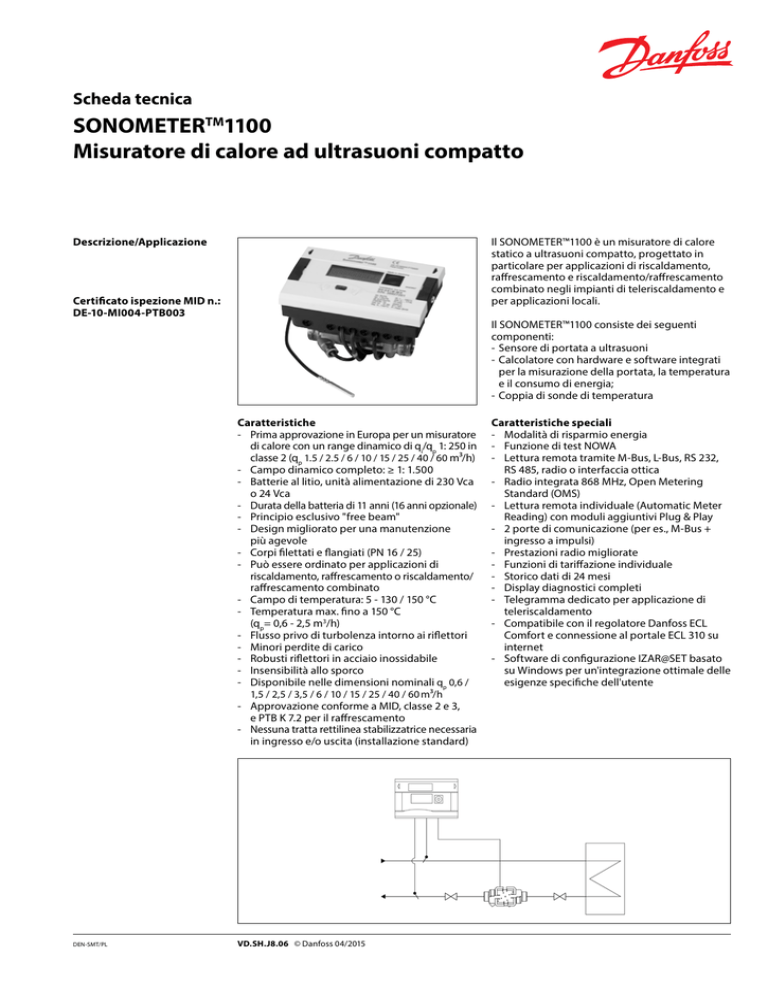 Scheda tecnica SONOMETERTM1100 Misuratore di calore ad ultrasuoni compatto Descrizione/Applicazione Il SONOMETER™1100 è un misuratore di calore statico a ultrasuoni compatto, progettato in particolare per applicazioni di riscaldamento, raffrescamento e riscaldamento/raffrescamento combinato negli impianti di teleriscaldamento e per applicazioni locali. Certificato ispezione MID n.: DE-10-MI004-PTB003 Il SONOMETER™1100 consiste dei seguenti componenti: - Sensore di portata a ultrasuoni - Calcolatore con hardware e software integrati per la misurazione della portata, la temperatura e il consumo di energia; - Coppia di sonde di temperatura Caratteristiche - Prima approvazione in Europa per un misuratore di calore con un range dinamico di qi/qp 1: 250 in classe 2 (qp 1.5 / 2.5 / 6 / 10 / 15 / 25 / 40 / 60 m³/h) - Campo dinamico completo: ≥ 1: 1.500 - Batterie al litio, unità alimentazione di 230 Vca o 24 Vca - Durata della batteria di 11 anni (16 anni opzionale) - Principio esclusivo "free beam" - Design migliorato per una manutenzione più agevole - Corpi filettati e flangiati (PN 16 / 25) - Può essere ordinato per applicazioni di riscaldamento, raffrescamento o riscaldamento/ raffrescamento combinato - Campo di temperatura: 5 - 130 / 150 °C - Temperatura max. fino a 150 °C (qp= 0,6 - 2,5 m3/h) - Flusso privo di turbolenza intorno ai riflettori - Minori perdite di carico - Robusti riflettori in acciaio inossidabile - Insensibilità allo sporco - Disponibile nelle dimensioni nominali qp 0,6 / 1,5 / 2,5 / 3,5 / 6 / 10 / 15 / 25 / 40 / 60 m³/h - Approvazione conforme a MID, classe 2 e 3, e PTB K 7.2 per il raffrescamento - Nessuna tratta rettilinea stabilizzatrice necessaria in ingresso e/o uscita (installazione standard) DEN-SMT/PL VD.SH.J8.06 © Danfoss 04/2015 Caratteristiche speciali - Modalità di risparmio energia - Funzione di test NOWA - Lettura remota tramite M-Bus, L-Bus, RS 232, RS 485, radio o interfaccia ottica - Radio integrata 868 MHz, Open Metering Standard (OMS) - Lettura remota individuale (Automatic Meter Reading) con moduli aggiuntivi Plug & Play - 2 porte di comunicazione (per es., M-Bus + ingresso a impulsi) - Prestazioni radio migliorate - Funzioni di tariffazione individuale - Storico dati di 24 mesi - Display diagnostici completi - Telegramma dedicato per applicazione di teleriscaldamento - Compatibile con il regolatore Danfoss ECL Comfort e connessione al portale ECL 310 su internet - Software di configurazione IZAR@SET basato su Windows per un'integrazione ottimale delle esigenze specifiche dell'utente Scheda tecnica SONOMETERTM1100 – misuratore di calore a ultrasuoni Descrizione/Applicazioni continua Il SONOMETER™1100 è in grado di gestire 3 tipi di applicazione (con tubo di misura in uscita): Misuratore di calore TH TC Heat Impianto di teleriscaldamento/a caldaia Misuratore di calore con tariffa di raffrescamento Cooling Heat Impianto di riscaldamento/raffrescamento combinato Misuratore di raffrescamento TC TH Cooling Applicazione con acqua di chiller VD.SH.J8.06 © Danfoss 04/2015 DEN-SMT/PL Scheda tecnica SONOMETERTM1100 – misuratore di calore a ultrasuoni Ordinazione: Utilizzare i codici standard per l'ordinazione. Codici standard misuratore di calore 1⁾: Pressione Lunghezza nominale cavo 2⁾ Lunghezza cavo 3⁾ Codice Sensore portata 087G1040 qp 0,6 m³/h / filettatura di 110 mm / DN 15 / G¾B PN16 1,5 m M-Bus kWh (senza cifre dopo virgola) 1,9 m 087G1041 qp 1,5 m³/h / filettatura di 110 mm / DN 15 / G¾B PN16 1,5 m M-Bus kWh (senza cifre dopo virgola) 1,9 m 087G1042 qp 1,5 m³/h / filettatura di 130 mm / DN 20 / G1B PN16 1,5 m M-Bus kWh (senza cifre dopo virgola) 1,9 m 087G1043 qp 2,5 m³/h / filettatura di 130 mm / DN 20 / G1B PN16 1,5 m M-Bus kWh (senza cifre dopo virgola) 1,9 m 187F1120 qp 3,5 m³/h / filettatura di 260 mm / DN 25 / G1¼B PN16 1,5 m kWh (senza cifre dopo virgola) 1,9 m 187F1121 qp 6 m³/h / filettatura di 260 mm / DN 25 / G1¼B PN16 1,5 m kWh (senza cifre dopo virgola) 1,9 m 187F1122 qp 6 m³/h / flangia di 260 mm / DN 32 PN25 1,5 m kWh (senza cifre dopo virgola) 1,9 m 187F1123 qp 10 m³/h / filettatura di 300 mm / DN 40 / G2B PN16 1,5 m MWh (con 3 cifre dopo virgola) 1,9 m 187F1124 qp 10 m³/h / flangia di 300 mm / DN 40 PN25 1,5 m MWh (con 3 cifre dopo virgola) 1,9 m 187F1125 qp 15 m³/h / flangia di 270 mm / DN 50 PN25 3m MWh (con 3 cifre dopo virgola) 2,9 m 187F1126 qp 25 m³/h / flangia di 300 mm / DN 65 PN25 3m MWh (con 3 cifre dopo virgola) 2,9 m 187F1127 qp 40 m³/h / flangia di 300 mm / DN 80 PN25 3m MWh (con 2 cifre dopo virgola) 2,9 m 187F1128 qp 60 m³/h / flangia di 360 mm / DN 100 PN25 3m MWh (con 2 cifre dopo virgola) 2,9 m 087G1118 qp 0,6 m³/h / filettatura di 110 mm / DN 15 / G¾B PN16 1,5 m Radio OMS kWh (senza cifre dopo virgola) 1,9 m 087G1224 qp 1,5 m³/h / filettatura di 110 mm / DN 15 / G¾B PN16 1,5 m Radio OMS kWh (senza cifre dopo virgola) 1,9 m 087G1120 qp 1,5 m³/h / filettatura di 130 mm / DN 20 / G1B PN16 1,5 m Radio OMS kWh (senza cifre dopo virgola) 1,9 m 087G1121 qp 2,5 m³/h / filettatura di 130 mm / DN 20 / G1B PN16 1,5 m Radio OMS kWh (senza cifre dopo virgola) 1,9 m 187F1129 qp 3,5 m³/h / filettatura di 260 mm / DN 25 / G1¼B PN16 1,5 m Radio OMS kWh (senza cifre dopo virgola) 1,9 m 187F1130 qp 6 m³/h / filettatura di 260 mm / DN 25 / G1¼B PN16 1,5 m Radio OMS kWh (senza cifre dopo virgola) 1,9 m 187F1131 qp 6 m³/h / flangia di 260 mm / DN 32 PN25 1,5 m Radio OMS kWh (senza cifre dopo virgola) 1,9 m 187F1132 qp 10 m³/h / filettatura di 300 mm / DN 40 / G2B PN16 1,5 m Radio OMS MWh (con 3 cifre dopo virgola) 1,9 m 187F1133 qp 10 m³/h / flangia di 300 mm / DN 40 PN25 1,5 m Radio OMS MWh (con 3 cifre dopo virgola) 1,9 m 187F1134 qp 15 m³/h / flangia di 270 mm / DN 50 PN25 3m Radio OMS MWh (con 3 cifre dopo virgola) 2,9 m 187F1135 qp 25 m³/h / flangia di 300 mm / DN 65 PN25 3m Radio OMS MWh (con 3 cifre dopo virgola) 2,9 m 187F1136 qp 40 m³/h / flangia di 300 mm / DN 80 PN25