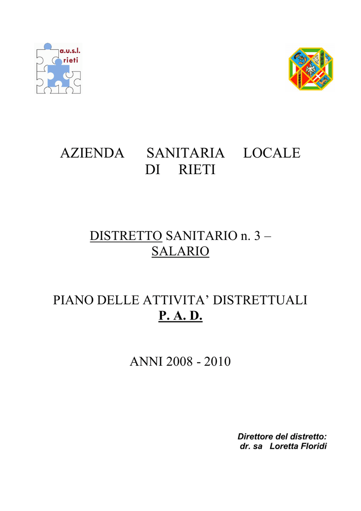 AZIENDA SANITARIA DI RIETI LOCALE DISTRETTO SANITARIO n. 3 – SALARIO PIANO DELLE ATTIVITA’ DISTRETTUALI P. A. D. ANNI 2008 - 2010 Direttore del distretto: dr. sa Loretta Floridi Indice Introduzione pag. 3 Il Distretto Sanitario Salario 5 Indicatori demografici 6 Organizzazione ed attività distrettuale 11 Programmazione sociosanitaria triennale 2008-2010 23 Programmazione Ulteriore Attivita’ Distrettuale 2008/2010 27 Rilevazione Annuale Delle Attivita’ Del Distretto Salario 28 Distretto salario: PAD Pagina 2 di 34 INTRODUZIONE Il Programma delle Attività Distrettuali è la base programmatica per organizzare ed articolare l’assistenza sanitaria primaria e l’integrazione sociosanitaria nel distretto. In quanto tale il PAD è chiamato ad evidenziare i centri di offerta e di responsabilità, a mettere in relazione l’analisi dei bisogni con la mappa dell’offerta, a selezionare le priorità di salute, a identificare le risorse necessarie per conseguire i risultati adeguati in termine di efficacia ed efficienza e di miglioramento del sistema di offerta. L’elaborazione del programma delle attività territoriali del distretto è costruita in collaborazione con gli altri soggetti istituzionali e sociali interessati. Interlocutori privilegiati sono: • Enti Locali • Altri soggetti pubblici che operano per la promozione della salute • Soggetti privati che erogano servizi sul territorio • Terzo settore • Organizzazioni degli utenti Tutti in elenco , oltre a collaborare per la costruzione del P.A.D. , sono anche chiamati a sottoscrivere il patto di solidarietà distrettuale per la salute. All’art. 3 quater del D. lgs. n. 229/99 è precisata la funzione strategica del Piano Territoriale con riferimento alla localizzazione dei servizi e presidi e alla determinazione delle risorse per l’integrazione sociosanitaria. Il Programma delle Attività Distrettuali, basato sul principio della intersettorialità degli interventi, cui concorrono le diverse strutture operative, prevede la localizzazione dei servizi; determina le risorse per l’integrazione sociosanitaria rispettivamente a carico dell’unità sanitaria locale e dei comuni, nonché la localizzazione dei presidi per il territorio di competenza. Distretto salario: PAD Pagina 3 di 34 Il PAD è proposto, sulla base delle risorse assegnate e previo parere del Comitato dei Sindaci di Distretto, dal Direttore di Distretto ed è approvato dal Direttore Generale, d’intesa con il Comitato medesimo , tenuto conto delle priorità stabilite a livello regionale. Per le ragioni sopra esposte il PAD. rappresenta il principale strumento di programmazione e di governo del livello di assistenza distrettuale, nelle diverse modalità di erogazione, in quanto coordinato nel territorio e nelle forme più idonee per garantire continuità assistenziale e appropriatezza degli interventi domiciliari, diurni, ambulatoriali e residenziali extraospedalieri. La Programmazione delle Attività Distrettuali rappresenta per il Distretto il presupposto necessario alla fase di attuazione pratica sia degli indirizzi della pianificazione strategica aziendale, sia degli obiettivi del Piano Sanitario Nazionale e di quello Regionale; dunque è uno strumento fondamentale per la realizzazione della integrazione della sanità con il territorio di riferimento. Il Piano Sanitario Nazionale ha come obiettivi : - Garantire i Livelli Essenziali ed Appropriati di Assistenza - Creare una rete integrata di servizi sanitari e sociali per l’assistenza ai malati cronici - Garantire la qualità dell’assistenza - Potenziare i fattori di sviluppo della sanità - Realizzare formazione permanente di alto livello - Ridisegnare la rete ospedaliera - Potenziare i servizi di Emergenza ed urgenza - Promuovere la ricerca - Promuovere gli stili di vita e la prevenzione - Promuovere un corretto uso dei Farmaci Il Distretto Sanitario costituisce la sede naturale dell’incontro tra domanda ed offerta ,il luogo delle funzioni di governo a livello locale che si esprime attraverso committenza e valutazione ; è strumento di coordinamento tra tutti i sistemi di offerta nonché strumento di coordinamento per il sistema delle cure primarie. Garantisce accessibilità, tempestività e continuità alle cure in modo da costruire una rete integrata di servizi che ponga al centro le necessità dei singoli utenti, favorendo l’integrazione e la collaborazione di tutti gli operatori intra ed extraaziendali: • all’interno dell’Azienda tra le Unità Operative Distrettuali e le strutture che assicurano i livelli di Assistenza Ospedaliera , della Prevenzione, della Salute Mentale • con i soggetti convenzionati che operano all’interno della struttura: Specialisti convenzionati e specialisti dipendenti • con i Medici convenzionati operanti nel territorio : Medici di Medicina Generale, Pediatri di Libera Scelta, Medici di Continuità Assistenziale e ARES 118 • con gli Uffici di Piano e le associazioni degli EE.LL. • con i privati accreditati ed i Farmacisti del territorio • con le Associazioni del Volontariato, il Terzo Settore , le Rappresentanze Sindacali. Distretto salario: PAD Pagina 4 di 34 IL DISTRETTO SANITARIO SALARIO TERRITORIO E POPOLAZIONE Il Distretto Sanitario Salario conta una popolazione residente pari a 25.820 abitanti, dati istat dell’ 1/01/2007 e comprende 12 Comuni : CASAPROTA CASTELNUOVO DI FARFA FARA SABINA FRASSO MONTELEONE SABINO ORVINIO POGGIO MOIANO POGGIO NATIVO POGGIO S. LORENZO POZZAGLIA SABINA SCANDRIGLIA TOFFIA 11 comuni ,raggruppati in due Unioni , U. Valle dell’olio e U. Alta sabina , ed il comune di Poggio Nativo hanno individuato il comune capofila in Fara in Sabina : sono distribuiti su un vasto territorio ben collegato da un asse viario principale, la ss Salaria e da una strada statale secondaria che serve le aree più periferiche. Il Distretto Salario garantisce alla popolazione residente i Livelli Essenziali di Assistenza distribuendo i serv