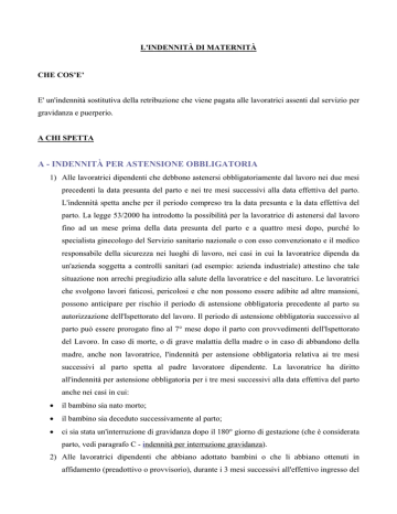 L'INDENNITÀ DI MATERNITÀ CHE COS’E’ E' un'indennità sostitutiva della retribuzione che viene pagata alle lavoratrici assenti dal servizio per gravidanza e puerperio. A CHI SPETTA A - INDENNITÀ PER ASTENSIONE OBBLIGATORIA 1) Alle lavoratrici dipendenti che debbono astenersi obbligatoriamente dal lavoro nei due mesi precedenti la data presunta del parto e nei tre mesi successivi alla data effettiva del parto. L'indennità spetta anche per il periodo compreso tra la data presunta e la data effettiva del parto. La legge 53/2000 ha introdotto la possibilità per la lavoratrice di astenersi dal lavoro fino ad un mese prima della data presunta del parto e a quattro mesi dopo, purché lo specialista ginecologo del Servizio sanitario nazionale o con esso convenzionato e il medico responsabile della sicurezza nei luoghi di lavoro, nei casi in cui la lavoratrice dipenda da un'azienda soggetta a controlli sanitari (ad esempio: azienda industriale) attestino che tale situazione non arrechi pregiudizio alla salute della lavoratrice e del nascituro. Le lavoratrici che svolgono lavori faticosi, pericolosi e che non possono essere adibite ad altre mansioni, possono anticipare per rischio il periodo di astensione obbligatoria precedente al parto su autorizzazione dell'Ispettorato del lavoro. Il periodo di astensione obbligatoria successivo al parto può essere prorogato fino al 7° mese dopo il parto con provvedimenti dell'Ispettorato del Lavoro. In caso di morte, o di grave malattia della madre o in caso di abbandono della madre, anche non lavoratrice, l'indennità per astensione obbligatoria relativa ai tre mesi successivi al parto spetta al padre lavoratore dipendente. La lavoratrice ha diritto all'indennità per astensione obbligatoria per i tre mesi successivi alla data effettiva del parto anche nei casi in cui: • il bambino sia nato morto; • il bambino sia deceduto successivamente al parto; • ci sia stata un'interruzione di gravidanza dopo il 180° giorno di gestazione (che è considerata parto, vedi paragrafo C - indennità per interruzione gravidanza). 2) Alle lavoratrici dipendenti che abbiano adottato bambini o che li abbiano ottenuti in affidamento (preadottivo o provvisorio), durante i 3 mesi successivi all'effettivo ingresso del bambino nella famiglia adottiva o affidataria, sempre che il bambino non abbia superato, al momento dell'adozione o dell'affidamento, i 6 anni di età e il minore straniero non abbia superato, al momento del suo ingresso in famiglia i 18 anni di età. Spetta anche al padre lavoratore dipendente, in alternativa alla madre lavoratrice dipendente. Spetta anche alle lavoratrici autonome adottive o affidatarie (affidamento preadottivo) ma non al lavoratore autonomo. 3) Alle lavoratrici autonome (coltivatrici dirette, mezzadre e colone, artigiane e commercianti) spetta l'astensione obbligatoria dal lavoro a partire dal 27 aprile 2001 (entrata in vigore del Testo unico sulla maternità) per i due mesi prima e i tre mesi dopo il parto. Spetta per 5 mesi sia in caso di parto prematuro sia in caso di parto successivo alla data presunta. Per le lavoratrici parasubordinate iscritte alla gestione separata dei lavoratori autonomi, che versano il contributo del 14% (collaboratrici coordinate e continuative, venditrici porta a porta, libere professioniste) vedi scheda "L'indennitá' Di Maternitá Dei Lavoratori Parasubordinati". Requisiti Per ottenere l'indennità di maternità le lavoratrici dipendenti devono avere un rapporto di lavoro in essere con diritto a retribuzione. Fanno eccezione: • le lavoratrici domestiche devono aver versato almeno un anno di contributi nei due anni precedenti il periodo di assenza obbligatoria o almeno sei mesi di contributi nell'anno precedente • le lavoratrici agricole devono aver effettuato minimo 51 giornate di lavoro nell'anno precedente il periodo di assenza obbligatoria; • le lavoratrici autonome devono risultare iscritte negli elenchi degli artigiani, o dei commercianti, o dei coltivatori diretti, mezzadri e coloni prima del periodo indennizzabile per maternità e aver pagato i contributi relativi; • le lavoratrici parasubordinate devono avere un minimo di tre contributi mensili nei 12 mesi precedenti i 2 mesi anteriori al parto B - INDENNITÀ PARENTALE) PER ASTENSIONE FACOLTATIVA (CONGEDO • Nei primi otto anni di vita del bambino ciascun genitore ha diritto ad astenersi dal lavoro; le astensioni non possono superare un periodo complessivo tra i genitori di dieci mesi, aumentabili a 11. Di seguito vengono elencate le modifiche dettate dalla nuova legge. • Le madri lavoratrici dipendenti (escluse quelle disoccupate o sospese, quelle addette ai servizi domestici e familiari e quelle a domicilio) possono astenersi per un periodo continuativo o frazionato non superiore a sei mesi, fino al compimento di otto anni di età del bambino • i padri lavoratori dipendenti possono astenersi per un periodo continuativo o frazionato non superiore a sei mesi elevabile a sette. Infatti nel caso in cui il padre lavoratore si astiene dal lavoro per un periodo non inferiore a tre mesi, il limite per lo stesso è elevato a sette mesi e il limite complessivo delle astensioni dal lavoro dei genitori diventa di undici mesi • nel caso di un solo genitore, per un periodo continuativo o frazionato non superiore a dieci mesi • i lavoratori dipendenti (esclusi quelli disoccupati o sospesi, le lavoratrici domestiche e a domicilio), genitori adottivi o affidatari hanno diritto ad astenersi come i genitori naturali, ma fino al dodicesimo anno di età del bambino, nei primi tre anni dall'ingresso in famiglia e per un periodo massimo di 6 mesi (7 per il padre) se chiesta da un genitore o di 10 mesi (11) se cumulata tra i due. Se il bambino fa il suo ingresso in famiglia a 12 anni l'astensione può essere esercitata sempre nei tre anni successivi, alle stesse modalità, fino al 15° compleanno • le lavoratrici autonome (coltivatrici dirette, mezz
