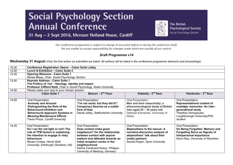 Our conference programme is subject to change at any point before or during the conference itself. We are unable to accept responsibility for changes made which are outside of our control. Draft Programme v14 Wednesday 31 August (Only the first author as submitted are listed. All authors will be listed in the conference programme abstracts and proceedings) 10.30 12.00 12.45 13.00 14.00 Conference Registration Opens – Calon Suite Lobby Lunch & Exhibition – Calon Suite 2 Opening Welcome - Calon Suite 1 Renee Bleau, Chair, Social Psychology Section Keynote Address - Calon Suite 1 The Politics of ‘riot’ - Ideology, identity and impact Professor Clifford Stott, Chair in Social Psychology, Keele University Please make your way to your chosen session nd Calon Suite 1 Brecon – 2 Floor Kidwelly - 2 nd floor rd Pembroke – 3 floor 14.05 Oral Presentation Anomaly and Arousal: Distinguishing the Role of the Behavioural Inhibition and Behavioural Approach Systems in Meaning Maintenance Effects Travis Proulx, Cardiff University Oral Presentation “I’m not racist, but they did it!”: Conspiracy theories as a subtle form of bias Daniel Jolley, Staffordshire University Oral Presentation Men and their masculinity; a phenomenological study of British men aged 25 – 35 years old. Deborah Earnshaw, University of Derby Oral Presentation Representational content of nostalgic memories: An intergenerational study Theofilos Gkinopoulos, Loughborough University/PhD student 14.25 Oral Presentation Do I run the red light or not? The role of TPB factors in explaining the intention to engage in risky behaviours Mioara Cristea, Heriot Watt University, Edinburgh (Scotland, UK) Oral Presentation Does contact make good neighbours? On the relationship between contact with asylum seekers and attitudes towards an initial reception centre in the neighbourhood Patrick Ferdinand Kotzur, PhilippsUniversity of Marburg, Germany Oral Presentation Stepmothers to the rescue: A narrative-discursive analysis of stepmothers’ talk about their (male) partners Sandra Roper, Open University Oral Presentation On Being Forgotten: Memory and Forgetting Serve as Signals of Interpersonal Importance Devin Ray, University of Aberdeen 14.45 Oral Presentation You See But You Do Not Observe: A Review of Bystander Intervention and Sexual Assault on University Campuses Danielle Labhardt, Coventry University 15.05 Refreshments & Exhibition - Calon Suite 2 15.25 Symposium Social Psychology at the Margins: Interdisciplinary dialogues Abigail Locke, University of Bradford 15.45 16.05 Paper 1: Experiencing the role of ‘informal carer’: Insights from two projects Jane Montague, University of Derby Paper 2: Gendering toys: A social psychological analysis Leanne Etheridge, Cardiff Metropolitan University Paper 3: The application of conversation analysis to investigative interviewing Carrie Childs, University of Derby 16.25 16.45 Paper 4: Navigating infant feeding debates: A view from critical social psychology Abigail Locke, University of Bradford Symposium When the online and offline worlds collide: Exploring how digital technology and social identity interact to affect collective action Laura Smith, University of Bath Paper 1: Withdrawn Paper 2: Mobilisation potential in online environments, the role of presentational flexibility Denise Wilkins, University of Exeter Paper 3: The emergence of solidarity with Syrian refugees over time on Twitter Laura Smith, University of Bath Paper 4: The use of digital media as resistance within existing collective action movements Aisling O'Donnell, University of Limerick Oral Presentation ‘Search for the (Viking) hero inside yourself’: Masculinity, place and applied genetic history Marc Scully, Loughborough University Oral Presentation The Social Impact of Being Forgotten in Daily Life Andrei Pintea, University of Aberdeen Oral Presentation Political correctness: Red light or red rag to prejudice? Toon Kuppens, University of Groningen Symposium The Experience of Stigma from a Minority Perspective: Quantitative and Qualitative Approaches Katy Greenland, Cardiff School of Social Sciences, Cardiff University Oral Presentation The Development of a Separatist Ideology and the Support for Separatism: Insights from the SIRDE Model of Social Change Peter R Grant, University of Saskatchewan Oral Presentation Jamaica, three years later: Changes in Jamaican anti-gay prejudice following 3 years of activism Keon West, Goldsmiths, University of London Oral Presentation Are Heterosexuals' Attitudes Towards Gay Men Becoming Ambivalent? Ashley Brooks, Anglia Ruskin University Please make your way to Calon Suite 1 for the Distinguished Career Award Lecture Paper 1: The Impacts of Cyberhate: The results of an experimental study Harriet Fearn, University of Sussex Paper 2; Unified (“Black”) experiences of racism across gender and ethnicity: A quantitative analysis of the University and College Union survey of FE and HE staff Joseph Sweetman, Exeter University Paper 3: Gay men’s identity work and the social construction of discrimination Katy Greenland, Cardiff School of Social Sciences, Cardiff University Paper 4: Cosmopolitanism as a strategy against stigma: An analysis of discourses of young Romanians in Britain Eleni Andreouli, Open University 16.50 Distinguished Career Award Lecture - Calon Suite 1 Understanding the indirect effects of hate crime Professor Rupert Brown - Professor of Social Psychology, Sussex University 17.50 – 18.50 Welcome Wine Reception - Calon Suite Lobby Thursday 1 September 08.15 Conference Registration Opens – Calon Suite Lobby Calon Suite 1 09.00 9.20 Symposium Towards a social psychology of contemporary citizenship Stephanie Taylor, The Open University Paper 1: Mead and the sense of citizenship Paul Stenner, The Open University Paper 2: Citizenship and everyday politics Eleni Andreouli, The Open University Paper 3: A contemporary worker subject and worker citizen Eleni Andreoul