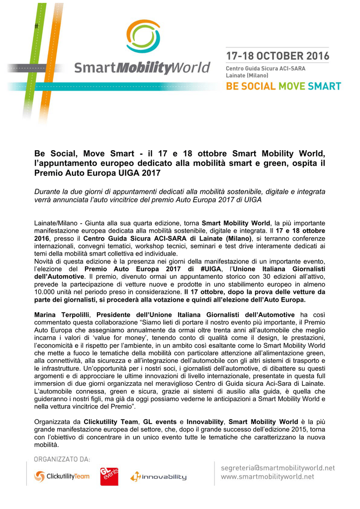 Be Social, Move Smart - il 17 e 18 ottobre Smart Mobility World, l’appuntamento europeo dedicato alla mobilità smart e green, ospita il Premio Auto Europa UIGA 2017 Durante la due giorni di appuntamenti dedicati alla mobilità sostenibile, digitale e integrata verrà annunciata l’auto vincitrice del premio Auto Europa 2017 di UIGA Lainate/Milano - Giunta alla sua quarta edizione, torna Smart Mobility World, la più importante manifestazione europea dedicata alla mobilità sostenibile, digitale e integrata. Il 17 e 18 ottobre 2016, presso il Centro Guida Sicura ACI-SARA di Lainate (Milano), si terranno conferenze internazionali, convegni tematici, workshop tecnici, seminari e test drive interamente dedicati ai temi della mobilità smart collettiva ed individuale. Novità di questa edizione è la presenza nei giorni della manifestazione di un importante evento, l’elezione del Premio Auto Europa 2017 di #UIGA, l’Unione Italiana Giornalisti dell’Automotive. Il premio, divenuto ormai un appuntamento storico con 30 edizioni all’attivo, prevede la partecipazione di vetture nuove e prodotte in uno stabilimento europeo in almeno 10.000 unità nel periodo preso in considerazione. Il 17 ottobre, dopo la prova delle vetture da parte dei giornalisti, si procederà alla votazione e quindi all’elezione dell’Auto Europa. Marina Terpolilli, Presidente dell’Unione Italiana Giornalisti dell’Automotive ha così commentato questa collaborazione “Siamo lieti di portare il nostro evento più importante, il Premio Auto Europa che assegniamo annualmente da ormai oltre trenta anni all’automobile che meglio incarna i valori di ‘value for money’, tenendo conto di qualità come il design, le prestazioni, l’economicità e il rispetto per l’ambiente, in un ambito così esaltante come lo Smart Mobility World che mette a fuoco le tematiche della mobilità con particolare attenzione all’alimentazione green, alla connettività, alla sicurezza e all’integrazione dell’automobile con gli altri sistemi di trasporto e le infrastrutture. Un’opportunità per i nostri soci, i giornalisti dell’automotive, di dibattere su questi argomenti e di approcciare le ultime innovazioni di livello internazionale, presentate in questa full immersion di due giorni organizzata nel meraviglioso Centro di Guida sicura Aci-Sara di Lainate. L’automobile connessa, green e sicura, grazie ai sistemi di ausilio alla guida, è quella che guideranno i nostri figli, ma già da oggi possiamo vederne le anticipazioni a Smart Mobility World e nella vettura vincitrice del Premio”. Organizzata da Clickutility Team, GL events e Innovability, Smart Mobility World è la più grande manifestazione europea del settore, che, dopo il grande successo dell’edizione 2015, torna con l’obiettivo di concentrare in un unico evento tutte le tematiche che caratterizzano la nuova mobilità. Simona Sandrini, Direttore Eventi Automotive di GL events ha così commentato l’importante presenza del Premio Auto Europa “Il Premio Auto Europa è sicuramente una grande opportunità per Smart Mobility World e rappresenta un evento nell’evento. GL events ringrazia UIGA per la collaborazione dimostrata nel corso degli anni, in occasione di tutte le manifestazioni automotive organizzate dalla nostra società: riteniamo importante, da un punto di vista strategico, la scelta di consegnare questo premio in un contesto che, per il settore, rivolge lo sguardo verso il futuro dell’automobile e, più in generale, della mobilità pubblica e privata. L’auto che verrà, gli automobilisti che saranno, le strade del futuro.” Anche Carlo Silva, Presidente Clickutilitym, ha dichiarato: “Partendo da una storia più che decennale di eventi sulla smart mobility, che ci hanno portato a 3000 visitatori e oltre 150 aziende e partner sostenitori raggiunti nell’ultima edizione realizzata all’Autodromo di Monza, la manifestazione è diventata il punto di riferimento in Italia per tutte le tematiche che ruotano intorno alla mobilità collettiva e individuale, urbana e a medio e lungo raggio, privata, pubblica e in sharing. Smart Mobility World ospiterà infatti convegni e appuntamenti dedicati ai nuovi veicoli connessi, alla sicurezza attiva e passiva dei veicoli e delle infrastrutture, alle nuove motorizzazioni e ai carburanti alternativi, con particolare attenzione all’elettrico, al gas naturale e al biometano, fino alla nuova frontiera dell’idrogeno. Si parlerà poi di sistemi di infotaiment a bordo, di sicurezza dei veicoli e delle infrastrutture di fronte ad attacchi informatici, di parcheggi smart e di sistemi di gestione del traffico, fino ad uno speciale focus sui pagamenti in mobilità e per la mobilità, che porteranno a costruire la cashless city, componente fondamentale della smart city”. Gianluigi Ferri, CEO Innovability ha affermato “Da sempre Smart Mobility World ha una attenzione speciale per il mondo delle startup, degli acceleratori e incubatori offrendo programmi speciali di partecipazione con momenti di incontro con investitori italiani ed esteri. Per questo motivo è ormai diventato l’evento italiano di riferimento per grandi aziende e PMI che utilizzano l’open innovation nel mondo dell’automotive e della mobilità per creare, in particolare, servizi innovativi, e sviluppare opportunità di business, soprattutto con l’arrivo delle nuove auto connesse e dei veicoli a guida autonoma.” Caratterizzata da due macro aree operative entrambe le giornate, Smart Mobility World sarà così organizzata: un’area Conference & Expo, cuore della manifestazione, pensata come un salotto della mobility in cui incontrare partner per lo sviluppo del proprio business e dove si affronteranno i temi caldi della mobilità smart con oltre 30 appuntamenti tra conferenze, convegni, workshop, seminari di approfondimento e talk show con esperti e giornalisti di settore, e un’area Drive, la pista di guida sicura dell’ACI di Lainate,