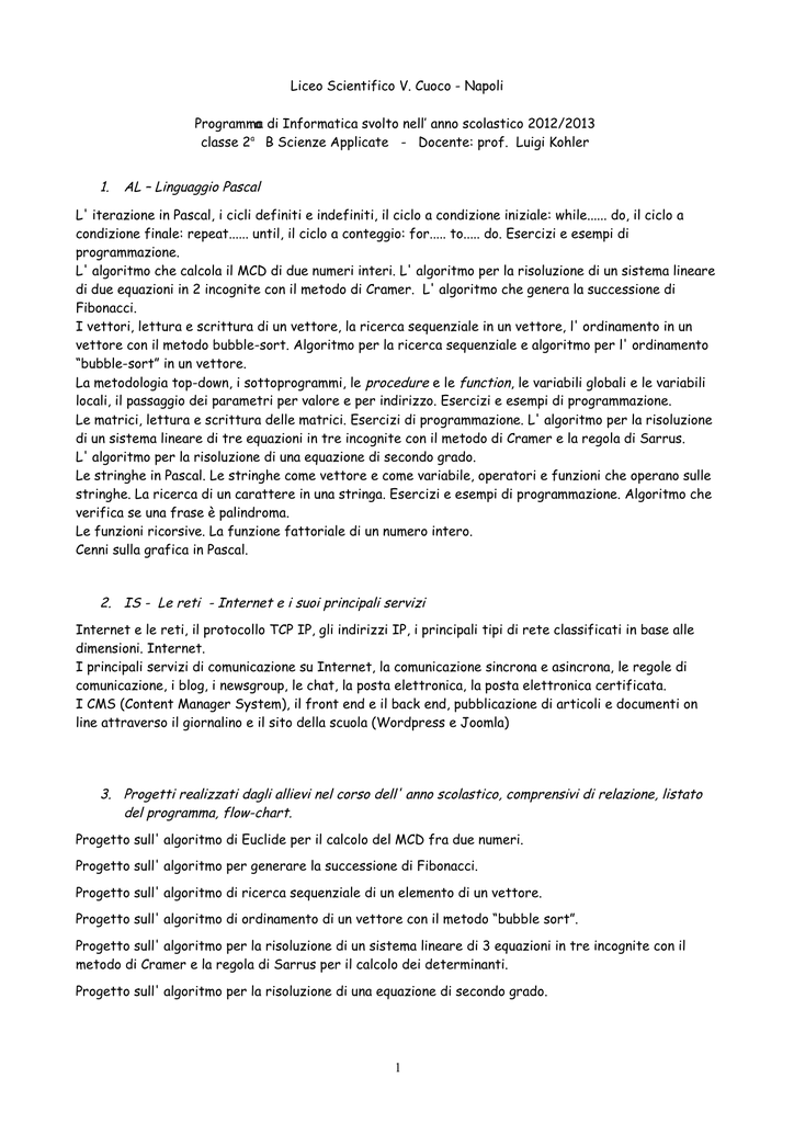 Liceo Scientifico V. Cuoco - Napoli Programma a di Informatica svolto nell’ anno scolastico 2012/2013 classe 2a B Scienze Applicate - Docente: prof. Luigi Kohler 1. AL – Linguaggio Pascal L' iterazione in Pascal, i cicli definiti e indefiniti, il ciclo a condizione iniziale: while...... do, il ciclo a condizione finale: repeat...... until, il ciclo a conteggio: for..... to..... do. Esercizi e esempi di programmazione. L' algoritmo che calcola il MCD di due numeri interi. L' algoritmo per la risoluzione di un sistema lineare di due equazioni in 2 incognite con il metodo di Cramer. L' algoritmo che genera la successione di Fibonacci. I vettori, lettura e scrittura di un vettore, la ricerca sequenziale in un vettore, l' ordinamento in un vettore con il metodo bubble-sort. Algoritmo per la ricerca sequenziale e algoritmo per l' ordinamento “bubble-sort” in un vettore. La metodologia top-down, i sottoprogrammi, le procedure e le function, le variabili globali e le variabili locali, il passaggio dei parametri per valore e per indirizzo. Esercizi e esempi di programmazione. Le matrici, lettura e scrittura delle matrici. Esercizi di programmazione. L' algoritmo per la risoluzione di un sistema lineare di tre equazioni in tre incognite con il metodo di Cramer e la regola di Sarrus. L' algoritmo per la risoluzione di una equazione di secondo grado. Le stringhe in Pascal. Le stringhe come vettore e come variabile, operatori e funzioni che operano sulle stringhe. La ricerca di un carattere in una stringa. Esercizi e esempi di programmazione. Algoritmo che verifica se una frase è palindroma. Le funzioni ricorsive. La funzione fattoriale di un numero intero. Cenni sulla grafica in Pascal. 2. IS - Le reti - Internet e i suoi principali servizi Internet e le reti, il protocollo TCP IP, gli indirizzi IP, i principali tipi di rete classificati in base alle dimensioni. Internet. I principali servizi di comunicazione su Internet, la comunicazione sincrona e asincrona, le regole di comunicazione, i blog, i newsgroup, le chat, la posta elettronica, la posta elettronica certificata. I CMS (Content Manager System), il front end e il back end, pubblicazione di articoli e documenti on line attraverso il giornalino e il sito della scuola (Wordpress e Joomla) 3. Progetti realizzati dagli allievi nel corso dell' anno scolastico, comprensivi di relazione, listato del programma, flow-chart. Progetto sull' algoritmo di Euclide per il calcolo del MCD fra due numeri. Progetto sull' algoritmo per generare la successione di Fibonacci. Progetto sull' algoritmo di ricerca sequenziale di un elemento di un vettore. Progetto sull' algoritmo di ordinamento di un vettore con il metodo “bubble sort”. Progetto sull' algoritmo per la risoluzione di un sistema lineare di 3 equazioni in tre incognite con il metodo di Cramer e la regola di Sarrus per il calcolo dei determinanti. Progetto sull' algoritmo per la risoluzione di una equazione di secondo grado. 1 Bibliografia o Paolo Camagni – Riccardo Nikolassy – Corso di Informatica per il liceo scientifico scienze applicate – volume 1, ISBN 978-88-203-4664-5 e volume 2, ISBN 978-88-203-4748-2 Hoepli (testo adottato e in uso) o Appunti dalle lezioni o Guida al linguaggio Pascal, appunti in rete nella sezione Informatica del sito del liceo o Visualizzare dati in Pascal, appunti in rete nella sezione Informatica del sito del liceo Napoli, 31 maggio 2013 Letto alla classe e pubblicato sul sito della scuola Alunni il docente prof. Luigi Kohler 2