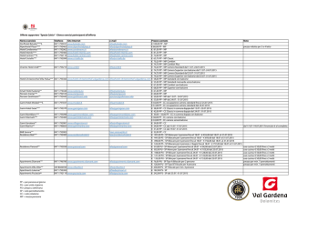 Offerte supporters "Spezia Calcio" - Elenco esercizi partecipanti all'offerta Nome esercizio Dorfhotel Beludei****S Alpenhotel Plaza**** Hotel Cendevaves**** Hotel Interski**** Hotel Carmen***S Hotel Cristallo*** Prezzo scontato € 100,00 PP - MP € 80,00 PP - MP € 81,00 PP - MP € 81,50 PP - MP € 72,00 PP - MP € 65,70 PP - MP Classic € 70,20 PP - MP Comfort € 74,70 PP - MP Comfort Plus Charme Hotel Uridl*** 0471 793215 www.uridl.it [email protected] € 70,20 PP - MP Camera Standard dal 11.07.-24.07.2015 € 74,70 PP - MP Camera Superior con balcone dal 11.07.-24.07.2015 € 74,70 PP - MP Camera Standard dal 25.07.-31.07.2015 € 79,20 PP - MP Camera Superior con balcone dal 25.07.-31.07.2015 Hotel Christeinerhof Villa Pallua*** 0471 793366 www.hotel-christeinerhof-valgardena.com [email protected] € 58,00 PP - MP Standard con balcone € 55,00 PP - MP Standard mansarda senza balcone € 61,00 PP - MP Comfort con balcone € 68,00 PP - MP Superior con balcone Smart Hotel Saslong** 0471 774444 www.saslong.eu [email protected] € 61,00 PP - MP Pension Ciamp*** 0471 792103 www.ciamp.com [email protected] € 60,00 PP - MP Pension Grohmann** 0471 793443 www.grohmann.info [email protected] € 50,00 PP - MP dal 13.07.- 24.07.2015 € 53,00 PP - MP dal 24.07.- 31.07.2015 Garni-Hotel Mirabel***S 0471 797037 www.mirabel.it [email protected] € 44,00 PP - CC occupazione camera standard fino al 24.07.2015 € 51,00 PP - CC occupazione camera standard dal 25.07.2015 Garni-Hotel Geier*** 0471 793370 www.garnigeier.com [email protected] € 38,00 PP - CC Classic in camera doppia dal 13.07.-23.07.2015 € 42,00 PP - CC Classic in camera doppia dal 24.07.-31.07.2015 Garni Montblanc*** 0471 793098 www.garnimontblanc.com [email protected] € 30,00 - 35,00 PP - CC in camera doppia con balcone Garni Telemark*** 0471 793400 www.garnitelemark.com [email protected] € 38,00 PP - CC camera con balcone € 33,00 PP - CC camera senza balcone Garni Genziana** 0471 792081 www.villagenziana.it [email protected] € 34,00 PP - CC Garni Marina** 0471 796603 www.garnimarina.com [email protected] € 29,00 PP - CC dal 13.07.-17.07.2015 € 31,00 PP - CC dal 19.07.-31.07.2015 B&B Serena°°° 0471 793002 [email protected] € 32,00 PP - CC Residence Boè*** 0471 795400 www.residencehotel.it [email protected] € 301,00 PS - SP Mono per 3 persone fino al 18.07 - € 455,00 dal 18.07. al 31.07.2015 € 441,00 PS - SP Bilocare per 5 persone fino al 18.07 - € 693,00 dal 18.07 al 31.07.2015 € 490,00 PS - SP Bilocare per 6 persone fino al 18.07 - € 756,00 dal 18.07. al 31.07.2015 € 532,00 PS - SP Bilocare per 6 persone, 2 bagni fino al 18.07 - € 791,00 dal 18.07 al 31.07.2015 Residence Panaval** 0471 793058 www.panaval.com [email protected] € 81,00 PU - SP Mono per 2 persone fino al 24.07 - € 90,00 dal 25.07.2015 € 85,50 PU - SP Mono per 3 persone fino al 24.07 - € 103,50 dal 25.07.2015 € 108,00 PU - SP Bilo per 3 persone fino al 24.07 - € 128,00 dal 25.07.2015 € 121,50 PU - SP Bilo per 4 persone fino al 24.07 - € 135,00 dal 25.07.2015 € 135,00 PU - SP Bilo per 5 persone fino al 24.07 - € 153,00 dal 25.07.2015 Apartments Diamant°°° 0471 796780 www.apartments-diamant.com [email protected] € 76,00 PU - SP Tipo A Bilocale per 2 persone € 128,00 PU - SP Tipo B Trilocale per 4 persone Apartments Villa Otto°°° 339 8026594 www.villaotto.it [email protected] € 240,00 PS - SP Trilocale per min. 4 persone Apartments Latemar°° 0471 793383 [email protected] € 182,00 PS - SP Apartments Puciaciaᶱᶱ 0471 792119 www.puciacia.com [email protected] € 242,00 PS - SP dal 25.07.-31.07.2015 PP = per persona al giorno PU = per unità al giorno PS= prezzo a settimana SP = solo pernottamento CC = solo colazione MP = mezza pensione Telefono 0471 793031 0471 793463 0471 792062 0471 793460 0471 792110 0471 792099 Sito Internet www.beludei.com www.alpenhotelplaza.it www.cendevaves.it www.hotel-interski.com www.hotel-carmen.com www.cristallo.bz e-mail [email protected] [email protected] [email protected] [email protected] [email protected] [email protected] Note prezzo ridotto per 3 e 4 letto dal 17.07.-19.07.2015 l'esercizio è al completo. uso cucina: € 50,00 fino a 3 notti uso cucina: € 50,00 fino a 3 notti uso cucina: € 50,00 fino a 3 notti uso cucina: € 50,00 fino a 3 notti uso cucina: € 50,00 fino a 3 notti prezzo per min. 7 pernottamenti prezzo per min. 7 pernottamenti