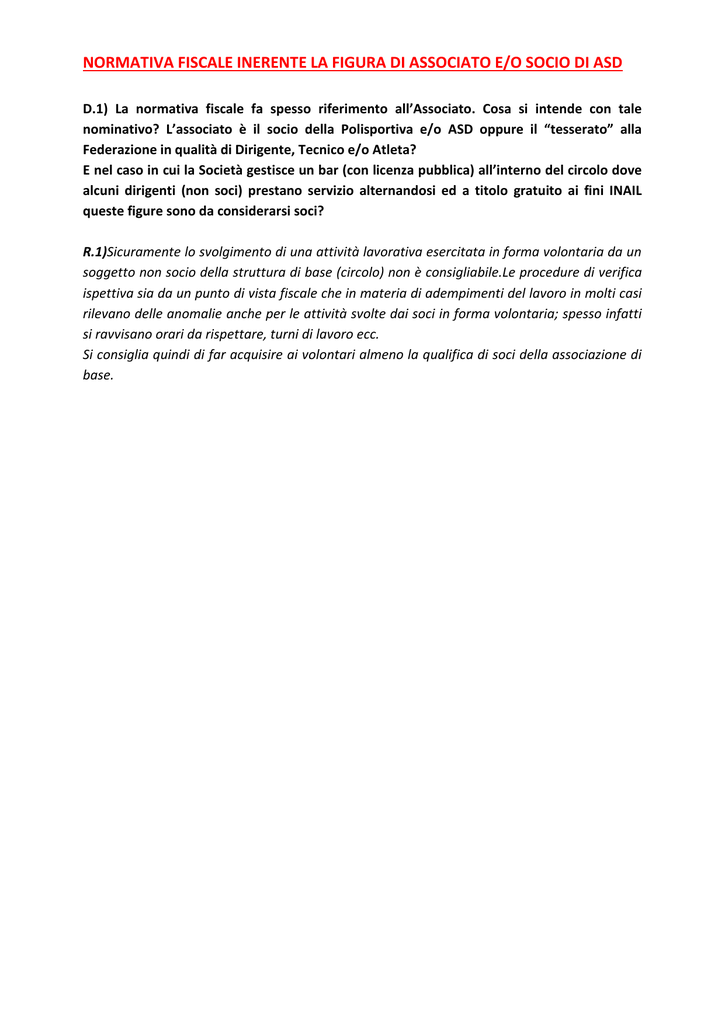 NORMATIVA FISCALE INERENTE LA FIGURA DI ASSOCIATO E/O SOCIO DI ASD D.1) La normativa fiscale fa spesso riferimento all’Associato. Cosa si intende con tale nominativo? L’associato è il socio della Polisportiva e/o ASD oppure il “tesserato” alla Federazione in qualità di Dirigente, Tecnico e/o Atleta? E nel caso in cui la Società gestisce un bar (con licenza pubblica) all’interno del circolo dove alcuni dirigenti (non soci) prestano servizio alternandosi ed a titolo gratuito ai fini INAIL queste figure sono da considerarsi soci? R.1)Sicuramente lo svolgimento di una attività lavorativa esercitata in forma volontaria da un soggetto non socio della struttura di base (circolo) non è consigliabile.Le procedure di verifica ispettiva sia da un punto di vista fiscale che in materia di adempimenti del lavoro in molti casi rilevano delle anomalie anche per le attività svolte dai soci in forma volontaria; spesso infatti si ravvisano orari da rispettare, turni di lavoro ecc. Si consiglia quindi di far acquisire ai volontari almeno la qualifica di soci della associazione di base.
