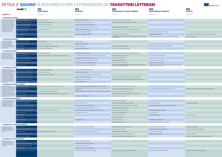 Quadro di riferimento per la formazione dei traduttori letterari Livelli (5) Competenze (8) LT1 LT2 LT3 LT4 LT5 Descrittori Descrittori Descrittori Descrittori Descrittori principiante avanzato professionALE a inizio carriera professionALE avanzato esperto 1. Competenza traduttiva La competenza traduttiva consiste nel possedere la conoscenza, le abilità e le attitudini necessarie per tradurre testi nella lingua principale a un livello richiesto. Include la capacità di riconoscere i problemi di comprensione e produzione di testi e la capacità di risolvere questi problemi in maniera adeguata e di giustificarne il risultato finale. comprensione dei testi di partenza sa capire i testi di partenza sa capire i testi letterari di partenza sa capire i testi letterari di partenza nel dettaglio individuazione dei problemi di traduzione sa individuare i problemi di traduzione sa individuare i problemi di traduzione letteraria sa trovare diverse soluzioni a problemi di traduzione letteraria conoscenza delle strategie traduttive conosce diverse strategie traduttive sa valutare le implicazioni delle strategie traduttive applicazione delle strategie traduttive produzione dei testi di arrivo sa produrre un testo di arrivo sa applicare le strategie traduttive in maniera appropriata sa applicare le strategie traduttive mirate sa produrre un testo letterario di arrivo sa produrre un testo letterario d’arrivo conforme agli standard editoriali giustificazione delle traduzioni sa giustificare scelte e decisioni individuali approccio traduttivo sa riconoscere i diversi approcci traduttivi creatività letteraria sa giustificare complessivamente le proprie traduzioni sa delineare il proprio approccio traduttivo sa adottare un approccio traduttivo sa produrre riflessioni sul proprio approccio sotto forma di prefazioni o commenti sta sviluppando la capacità di trovare soluzioni e fare scelte che vanno oltre le procedure e i metodi appresi sa trovare soluzioni e fare scelte che vanno oltre le procedure e i metodi appresi capacità creativa ottimale padroneggia diversi tipi di stili letterari in maniera appropriata 2. Competenza linguistica La competenza linguistica si riferisce alla padronanza grammaticale, stlistica e pragmatica della lingua di partenza e della lingua di arrivo, in particolare nei domini della lettura e scrittura. competenza della lingua di partenza CEF B2 per la lettura CEF C1 per la lettura competenza della lingua di arrivo CEF C1 per la lettura e la scrittura CEF C2 per la lettura e la scrittura linguaggio letterario sa riconoscere il linguaggio letterario (le specificità) sa applicare gli stili letterari sa adottare uno stile letterario appropriato varietà linguistiche sa riconoscere le varietà linguistiche sa applicare le varietà linguistiche sa adottare una varietà linguistica appropriata capacità di analizzare i testi sa analizzare i testi di partenza sa analizzare i testi letterari di partenza sa produrre un’analisi che è rilevante per la traduzione dei testi letterari conoscenza dei generi letterari conosce i generi che appartengono alla tradizione della letteratura di arrivo conosce i generi che appartengono alla tradizione della letteratura di partenza sa trattare specifici generi e tipi testuali ricoscimento dei tratti stilistici del testo di partenza sa riconoscere i tratti stilistici del testo di partenza sa distinguere tratti stilistici diversi applicazione delle tecniche letterarie sa rispondere a specifiche sfide testuali in maniera creativa sa applicare le tecniche letterarie sa applicare tecniche letterarie complesse produzione di testi di arrivo che hanno dei tratti stilistici sa produrre un testo di arrivo in un determinato stile sa trovare soluzioni e fare scelte creative sa produrre testi di arrivo in stili diversi competenze redazionali sa fare editing dei testi secondo gli standard editoriali sa applicare le proprie competenze analitico-critiche alla revisione di traduzioni altrui, in conformità con gli standard editoriali sa applicare le proprie competenze analitico-critiche alla revisione delle proprie traduzioni, in conformità con gli standard editoriali 3. Competenza testuale La competenza testuale si riferisce alla conoscenza dei generi e stili letterari e alla capacità di applicare queste conoscenze all’analisi dei testi di partenza e alla produzione dei testi di arrivo. si specializza in almeno un genere letterario 4. Competenza euristica La competenza euristica è la capacità di unire in modo efficace le conoscenze linguistiche e tematiche necessarie per la traduzione. Include la capacità di sviluppare delle strategie che permettano di sfruttare le fonti di informazione in modo ottimale e comprende anche la capacità di applicare la critica testuale e di distinguere le differenze tra le diverse edizioni di uno stesso testo. capacità di ricercare materiale bibliografico sa reperire il materiale bibliografico sa repererire il materiale bibliografico specifico capacità di svolgere ricerche su internet conosce gli strumenti digitali sa utilizzare gli strumenti digitali capacità di utilizzare materiale bibliografico sa ricorrere a strategie di ricerca digitale sa ricorrere a strategie di ricerca digitale rilevanti per la traduzione capacità di documentare i testi di partenza sa utilizzare il materiale bibliografico sa utilizzare il materiale bibliografico in modo rilevante per la traduzione capacità di distinguere le edizioni testuali sa distinguere diverse edizioni di un testo sa utilizzare le diverse edizioni di un testo in maniera rilevante per la traduzione applicazione dell’apparato critico sa utilizzare l’apparato critico 5. Competenza letteraria e culturale La competenza letteraria e culturale è la capacità di applicare le conoscenze relative alla cultura e alla letteratura di partenza e di arrivo nel processo di traduzione letteraria; include anche la capacità di percepire e di trattare le differenze culturali e la capacità di 