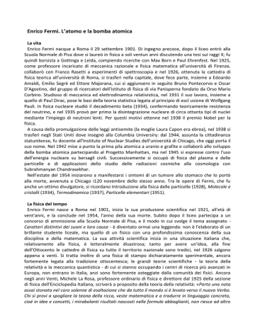 Enrico Fermi. L’atomo e la bomba atomica La vita Enrico Fermi nacque a Roma il 29 settembre 1901. Di ingegno precoce, dopo il liceo entrò alla Scuola Normale di Pisa dove si laureò in fisica a soli ventun anni discutendo una tesi sui raggi X; fu quindi borsista a Gottinga e Leida, compiendo ricerche con Max Born e Paul Ehrenfest. Nel 1925, come professore incaricato di meccanica razionale e fisica matematica all'università di Firenze, collaborò con Franco Rasetti a esperimenti di spettroscopia e nel 1926, ottenuta la cattedra di fisica teorica all'università di Roma, si trasferì nella capitale, dove fece parte, insieme a Edoardo Amaldi, Emilio Segrè ed Ettore Majorana, cui si aggiunsero in seguito Bruno Pontecorvo e Oscar D'Agostino, del gruppo di ricercatori dell'istituto di fisica di via Panisperna fondato da Orso Mario Corbino. Studioso di meccanica ed elettrodinamica relativistica, nel 1931 il suo lavoro, insieme a quello di Paul Dirac, pose le basi della teoria statistica legata al principio di escl usione di Wolfgang Pauli. In fisica nucleare studiò il decadimento beta (1934), confermando teoricamente resistenza del neutrino, e nel 1935 provò per primo la disintegrazione nucleare di circa ottanta tipi di nuclei mediante l'impiego di neutroni lenti. Per questi motivi ottenne nel 1938 il premio Nobel per la fisica. A causa della promulgazione delle leggi antisemite (la moglie Laura Capon era ebrea), nel 1938 si trasferì negli Stati Uniti dove insegnò alla Columbia Universiry: dal 1944, assunta la cittadinanza statunitense, fu docente all'Institute of Nuclear Studies dell'università di Chicago, che oggi porta il suo nome. Nel 1942 mise a punto la prima pila atomica a uranio e grafite e collaborò allo sviluppo della bomba atomica partecipando al Progetto Manhattan, ma nel 1945 si espresse contro l'uso dell'energia nucleare su bersagli civili. Successivamente si occupò di fisica del plasma e delle particelle e di applicazioni dello studio delle radiazioni cosmiche alla cosmologia con Subrahmanyan Chandrasekhar. Nell'estate del 1954 iniziarono a manifestarsi i sintomi di un tumore allo stomaco che lo portò alla morte, avvenuta a Chicago i120 novembre dello stesso anno. Tra le opere di Fermi, che fu anche un ottimo divulgatore, si ricordano Introduzione alla fisica delle particelle (1928), Molecole e cristalli (1934), Termodinamica (1937), Particelle elementari (1951). La fisica del tempo Enrico Fermi nasce a Roma nel 1901, inizia la sua produzione scientifica nel 1921, all'età di vent'anni, e la conclude nel 1954, l'anno della sua morte. Subito dopo il liceo partecipa a un concorso di ammissione alla Scuola Normale di Pisa, e il modo in cui svolge il tema assegnato Caratteri distintivi dei suoni e loro cause - è diventato ormai una leggenda: non è l'elaborato di un brillante studente liceale, ma quello di un fisico con una profondissima conoscenza della sua disciplina e della matematica. La sua attività scientifica inizia in una situazione italiana che, relativamente alla fisica, è letteralmente disastrosa; tanto per avere un'idea, alla fine dell'Ottocento le cattedre di fisica su tutto il territorio nazionale sono tredici, nel 1926 salgono appena a venti. Si tratta inoltre di una fisica di stampo dichiaratamente sperimentale, ancora fortemente legata alla tradizione ottocentesca; le grandi teorie scientifiche - la teoria della relatività e la meccanica quantistica - di cui si stanno occupando i centri di ricerca più avanzati in Europa, non entrano in Italia, anzi sono fortemente osteggiate dalla comunità dei fisici. Ancora negli anni Venti, Michele La Rosa, professore ordinario di fisica e direttore dal 1925 della sezione di fisica dell'Enciclopedia Italiana, scriverà a proposito della teoria della relatività: «Porto una nota assai stonata nel coro solenne di esaltazione che da tutto il mondo si è levato verso il nuovo Verbo. Chi si provi a spogliare la teona della ricca, veste matematica e a tradurre in linguaggio concreto, cioé in idee e concetti, i mirabolanti risultati nascosti nelle formule abbaglianti, non riesce ad altro che a provar le vertigini; e più che per le spaventevoli demolizioni che la teoria ha largamente seminato nel campo dei concetti più generali, di quei concetti che erano la base stessa della nostra conoscenza, per il vuoto affannoso e orribile che essa lascia al suo posto». L'atteggiamento di La Rosa non è isolato ma trova ampia condivisione. Il merito di Enrico Fermi fu proprio quello di rompere questa tradizione portando nel giro di pochi decenni la scuola di fisica italiana sulla scena della ricerca internazionale. Enrico Fermi appartiene all'ultima generazione di fisici capaci di coniugare straordinarie abilità sperimentali con eccezionali doti teoriche. Oggi l'alta matematica utilizzata nella ricerca teorica e la strumentazione sempre più sofisticata della ncerca sperimentale richiedono competenze specifiche altissime, che non si possono riassumere in un'unica figura di ricercatore. In questo contributo ripercorreremo gli itinerari di ricerca di Enrico Fermi soffermandoci sulle molte luci, ma anche su alcune ombre, che hanno segnato la carriera di questo straordinario scienziato. La scuola romana: i ragazzi di via Panisperna Una figura che ebbe un'influenza determinante sulla carriera scientifica di Enrico Fermi è quella di Orso Mario Corbino, professore di fisica, direttore dell'istituto di fisica di Roma e senatore. Orso Mario Corbino si accorge subito delle straordinarie potenzialità di Fermi e vede la possibilità di realizzare, grazie a lui, il progetto di dar vita a una scuola di fisica italiana di statura internazionale e al passo con i tempi; aiuta perciò Fermi a ottenere due borse di studio per l'estero. La prima porta Fermi a Gottinga, dove incontra Max Born e altri padri fondatori della meccanica quantistica. A dire il vero, questa esperienza non è molto produttiva; va meglio con il soggiorno a Leida, presso