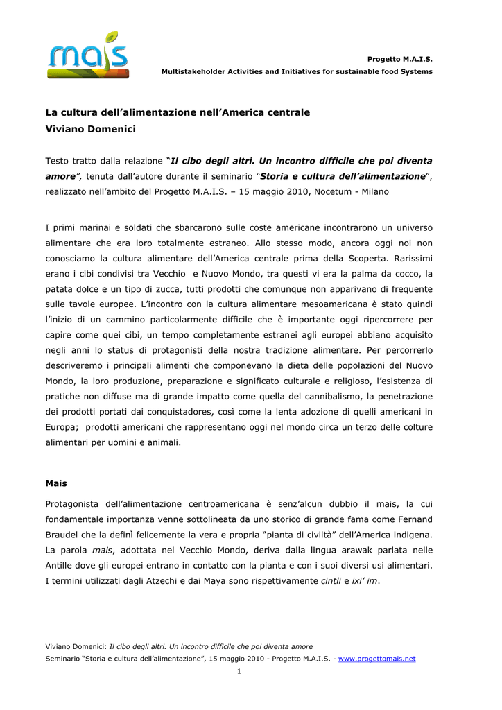 Progetto M.A.I.S. Multistakeholder Activities and Initiatives for sustainable food Systems La cultura dell’alimentazione nell’America centrale Viviano Domenici Testo tratto dalla relazione “Il cibo degli altri. Un incontro difficile che poi diventa amore”, tenuta dall’autore durante il seminario “Storia e cultura dell’alimentazione”, realizzato nell’ambito del Progetto M.A.I.S. – 15 maggio 2010, Nocetum - Milano I primi marinai e soldati che sbarcarono sulle coste americane incontrarono un universo alimentare che era loro totalmente estraneo. Allo stesso modo, ancora oggi noi non conosciamo la cultura alimentare dell’America centrale prima della Scoperta. Rarissimi erano i cibi condivisi tra Vecchio e Nuovo Mondo, tra questi vi era la palma da cocco, la patata dolce e un tipo di zucca, tutti prodotti che comunque non apparivano di frequente sulle tavole europee. L’incontro con la cultura alimentare mesoamericana è stato quindi l’inizio di un cammino particolarmente difficile che è importante oggi ripercorrere per capire come quei cibi, un tempo completamente estranei agli europei abbiano acquisito negli anni lo status di protagonisti della nostra tradizione alimentare. Per percorrerlo descriveremo i principali alimenti che componevano la dieta delle popolazioni del Nuovo Mondo, la loro produzione, preparazione e significato culturale e religioso, l’esistenza di pratiche non diffuse ma di grande impatto come quella del cannibalismo, la penetrazione dei prodotti portati dai conquistadores, così come la lenta adozione di quelli americani in Europa; prodotti americani che rappresentano oggi nel mondo circa un terzo delle colture alimentari per uomini e animali. Mais Protagonista dell’alimentazione centroamericana è senz’alcun dubbio il mais, la cui fondamentale importanza venne sottolineata da uno storico di grande fama come Fernand Braudel che la definì felicemente la vera e propria “pianta di civiltà” dell’America indigena. La parola mais, adottata nel Vecchio Mondo, deriva dalla lingua arawak parlata nelle Antille dove gli europei entrano in contatto con la pianta e con i suoi diversi usi alimentari. I termini utilizzati dagli Atzechi e dai Maya sono rispettivamente cintli e ixi’ im. Viviano Domenici: Il cibo degli altri. Un incontro difficile che poi diventa amore Seminario “Storia e cultura dell’alimentazione”, 15 maggio 2010 - Progetto M.A.I.S. - www.progettomais.net 1 Progetto M.A.I.S. Multistakeholder Activities and Initiatives for sustainable food Systems Il mais viene coltivato a partire dal 5000 a.C. e si impone gradualmente come alimento fondamentale, il suo valore tuttavia non è solo alimentare ma anche culturale, tanto da costituire l’essenza stessa dell’umanità. Narra infatti la mitologia Maya che gli dei trovarono nella montagna sacra, magazzino universale della fertilità, il mais bianco e il mais giallo, che macinato nove volte e reso finissimo e mescolato con l’acqua diede origine alla carne dei primi quattro uomini. Anche l’impiego alimentare del mais ha un’origine divina, narrata dal mito atzeco di Quetzalcóatl, il Serpente Piumato che incaricò le divinità della pioggia e della fertilità di aprire una breccia nella Montagna del Sostentamento per estrarne quegli alimenti che da allora le suddette divinità garantiscono agli uomini. Alimento di base per numerosi piatti e bevande, il mais viene trasformato in modi numerosi e molto vari. Fondamentale è nixtamalizzazione, ovvero la bollitura dei grani con la calce per ammorbidirne la cuticulta esterna e favorire l’assimilazione delle vitamine che altrimenti andrebbero perdute, come accade successivamente in Europa, causando gravi malattie quali la pellagra. Così trattato il mais viene macinato per produrre un impasto umido, la masa, base di molti piatti, tra i quali il tamalli, una sorta di piccola pagnotta avvolta in una foglia di mais e cotta al vapore in una pentola con poca acqua sul fondo e diversi tipi di tortilla, cotta a secco su un disco di ceramica posto sul fuoco e utilizzata come pane. Sciolte in acqua fredda o calda, le farine di mais sono ingredienti base anche di molte bevande. Zucca Unico alimento già presente nella cultura europea fin dall’antichità con la varietà Lagenaria siceraria, la zucca, termine con cui si fa riferimento a frutti molto diversi tra loro, è largamente presente nella cucina mesoamericana. Fagioli I fagioli, definiti etl nella lingua Azteca, vengono domesticati nelle diverse specie del genere Phaseolus e utilizzati nella gastronomia azteca dove, bolliti, entravano spesso a far parte di zuppe, tamales e tortillas. Viviano Domenici: Il cibo degli altri. Un incontro difficile che poi diventa amore Seminario “Storia e cultura dell’alimentazione”, 15 maggio 2010 - Progetto M.A.I.S. - www.progettomais.net 2 Progetto M.A.I.S. Multistakeholder Activities and Initiatives for sustainable food Systems Peperoncino Il peperoncino, chilli per gli Aztechi, è il condimento più comune della cucina mesoamericana e decine di specie diverse sono usate virtualmente in ogni preparazione. Amaranto Numerosi sono gli altri alimenti, tra questi l’amaranto, la chía (un tipo di salvia), il fico d’India, il pomodoro, l’avocado, l’arachide, la manioca, molti tipi di erbe, funghi, fiori e frutti, oltre a dolcificanti o aromatizzanti come il miele e la vaniglia. Il più importante tra questi è l’amaranto, detto huautli, i cui semi altamente proteici erano utilizzati nella preparazione di tamales, tortillas e bevande; il pomodoro, detto tómatl, era spesso usato insieme al peperoncino per produrre salse, dette molli, molto comuni: così il chilmolli, salsa di peperoncino e l’ahuacamolli, salsa di avocado, progenitore del ben noto guacamole della cucina messicana odierna. Fico d’India Originale è l’impiego del fico d’india, nopalli: i frutti vengono consumati come è consueto in Europa, ma la parte più pregiata della
