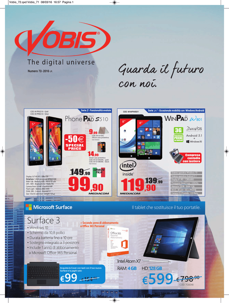 Vobis_72.qxd:Vobis_71 08/03/16 16:57 Pagina 1 Numero 72- 2016 I.P. Serie S - Funzionalità evolute COD. M-PPAS510 - Gold COD. M-PPBS510 - Silver Serie W - Eccezionale mobilità con Windows/Android COD. M-WPW801 WINPAD W801 8.0 Phone PAD S510 DUO 5” 5” -50€ SPECIAL PRICE 8” 8” 3G DualOS 9,99 Change your world with a click Funzione COD. M-S510SC Silicon case protettiva PHONE non inclusa su Android 14,99 Android 5.1 + Compresa custodia con tastiera Smart case protettiva COD. M-S510ASMC - gold COD. M-S510BSMC - black non inclusa 149,90 99,90 119,90 Display 5.0” HD IPS 1280x720 OctaCore 1.4GHz processor MTK6592M RAM 1GB - Memory 8GB - micro SD slot GPS - WiFi - Bluetooth 4.0 - Radio FM Camera front 5.0 MP + back 8.0 MP Flash Light - Battery 2000 mAh DUAL SIM - 2 micro - Android 5.1 Size 143x70.1x6.9 mm - Weight 120 gr. 139,90 Sistema operativo Windows 10 Sistema operativo Android 5.1 Display 8” IPS - 1280x800 Processore Quad Core 1.83GHz Memoria 32GB - RAM 1GB Wi-Fi - BT 4.0 - 3G + PHONE Camera 0.3 Frontale - 2.0 Retro Il tablet che sostituisce il tuo portatile. Surface 3 + Secondo anno di abbonamento • Windows 10 • Schermo da 10,8 pollici • Sostegno integrato a 3 posizioni • Include 1 anno di abbonamento Intel Atom X7 Acquista la Cover con tasti con il tuo nuovo Surface e la paghi solo: €99 € 154,90 COD. A7Z-00038 RAM: 4 GB HD: 128 GB €599 € 798,90 COD. 7G6048 Vobis_72.qxd:Vobis_71 08/03/16 16:58 Pagina 2 2 Vobis_72.qxd:Vobis_71 08/03/16 16:58 Pagina 3 COD. LgK4BK - BLACK COD. LgK4WH - WHItE COD. LgBELLOIIt - tItAN COD. LgBELLOIIW - WHItE 3 129,90 SAgAJ5B - BLACK SAgAJ5g - gOLD SAgAJ5W - WHItE 99,90 129,90 199,90 Microsoft Lumia 950 Microsoft À Lumia 650 NOVIT DISPONIBILE VERSIONE XL € 699 SAA3LtEB - BLACK SAA3LtEW - WHItE COMPRESA LA NUOVA UNIVERSAL FOLDABLE KEYBOARD COD. gU5-00010 IN ARRIVO A MEtà MARzO • Versione software: Windows 10 • Dimensione display: 5” • Risoluzione display: HD 1280x720 pixel 239,90 599 • Memoria interna: 16 GB • RAM: 1 GB • Nome CPU: Qualcomm® Snapdragon™ 212 329,90 • Fotocamera principale: 8 MP • Fotocamera anteriore: Grandangolo Full HD da 5 MP NKLUM650B - BLACK / NKLUM650W - WHItE SAgAS7BK32 - BLACK NOVITÀ SAgAS7E3BK - BLACK NOVITÀ NKLUM950B - BLACK / NKLUM950W - WHItE Backbeat Go 2/R Cuffie con microfono COD. 8860005 - NERO 91,49 59,99 729 • 4G/LTE Cat9 450/50 Mbps / HSPA+ 42Mbps • Display 5.1” Quad HD SuperAMOLED • Processore Octa Core (Quad Core 2.3GHz + Quad Core 1.6GHz) • Fotocamera posteriore 12 MP Dual Pixel • Fotocamera anteriore 5 MP • Memoria interna 32 GB (Espandibile con microSD fino a 200 GB) • RAM 4 GB • Wi-Fi 802.11 a/b/g/n/ac, Download Booster • Bluetooth 4.2 / ANT+ • Ba eria 3000 mAh • Cer!ficazione IP68 • Sistema opera!vo Android 6.0 Marshmallow 829 • 4G/LTE Cat9 450/50 Mbps / HSPA+ 42Mbps • Display 5.5” Dual Edge Quad HD SuperAMOLED • Processore Octa Core (Quad Core 2.3GHz + Quad Core 1.6GHz) • Fotocamera posteriore 12 MP Dual Pixel • Fotocamera anteriore 5 MP • Memoria interna 32 GB (Espandibile con microSD fino a 200 GB) • RAM 4 GB • Wi-Fi 802.11 a/b/g/n/ac, Download Booster • Bluetooth 4.2 / ANT+ • Ba eria 3600 mAh • Cer!ficazione IP68 • Sistema opera!vo Android 6.0 Marshmallow gli auricolari wireless Plantronics BackBeat gO 2 offrono un audio coinvolgente per una vita senza soste; liberatevi dei cavi, fate spazio alla musica e rispondete alle vostre chiamate. Plantronics Voyager Edge Cuffie con microfono COD. 20101005 L’auricolare ti permette di non perdere nessuna telefonata: risponde automaticamente appena lo metti sull’orecchio o ti annuncia chi sta chiamando, così eviti di guardare sul telefono per scegliere se rispondere o ignorare la chiamata. Progettato per le persone con molti impegni, permette il controllo tramite comandi vocali, mentre gli avvisi sonori ti tengono informato e le app mobili di Plantronics ti aiutano a sfruttare al meglio tutte le funzioni del tuo auricolare. 132,16 99,99 Vobis_72.qxd:Vobis_71 08/03/16 16:58 Pagina 4 4 Key Disk OTG COD. M-UD32Otg 32GB - COD. M-UD16Otg 22,99 16GB - COD. M-UD8Otg 8GB - 7,90 11,90 IDEALE PER TABLET E SMARTPHONE 2 in 1 SD/microSD COD. M-MDSD8000 8GB - Class10 4,99 COD. M-MDSD16U 16GB - UHS-I COD. M-MDSD32U 32GB - UHS-I Adattatore (microSD ➝ SD) per utilizzo universale. NOVITÀ 8,99 20,99 COD. M-MDSD64U 64GB - UHS-I 38,99 Vobis_72.qxd:Vobis_71 08/03/16 17:06 Pagina 5 Apple iPad Pro with Retina Display 12.9 IPS ICONIA ONE 8 B1-810 11YU Tablet 8" IPS LED Multi Touch cod. 7mL0F2TYA - GRIGIo SIdERALE cod. 7mL0G2TYA - ARGENTo 5 cod. B1810 cod. 7mL0H2TYA - oRo 12.9” RETINA DISPLAY IPS RAM 1 GB 32 GB STORAGE 919,99 8” LED TOUCH SCREEN RAM 1 GB chip A9X con architettura a 64 bit - Apple ioS 9oggi iPad Pro, con la tecnologia multi Touch perfezionata, il suo grande display Retina da 12,9" e prestazioni della cPU quasi raddoppiate rispetto a iPad Air 2, è pronto ad allargare ancora una volta i tuoi orizzonti. Non è solo più grande. È un iPad che ti permetterà di lavorare e creare in una dimensione tutta nuova, come non hai mai fatto prima. SOS Power Bank 7800 Smartphone & Tablet charger HDD 16 GB Processore Intel Atom Z3735G; display IPS 8” 1280x800 multi touch; macchina fotografica 5 mpx posteriore + 0,3 mpx anteriore; Android 4.4 (KitKat); Wi-Fi 802.11b/g/n; Bluetooth 4.0; GPS; Zero Gap Technology; Anti-fingerprint; Nero; Universal Mobile ANDROID Bluetooth Keyboard WINDOWS cod. m-ZcK21BBT - NERA cod. m-ZcK21SBT - BIANcA cod. m-PBS78c - capacità 7800mAh. 29,90 IOS mouse bianco in abbinamento a tastiera bianca mouse nero in abbinamento a tastiera nera SOS Power Bank 10400 34,90 39,90 Questo prodotto è indispensabile per chi è sempre in movimento. Serve a ricaricare Smartphone, Tablet, mP3 ed altri dispositivi in qualsiasi luogo grazie alla sua connessione USB, incorpora una piccola torcia LEd di emergenza. Elegante tastiera Bluetooth dotata di due supporti a scomparsa s