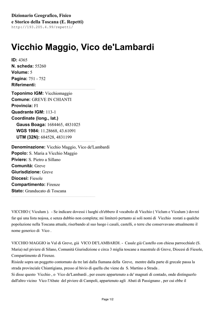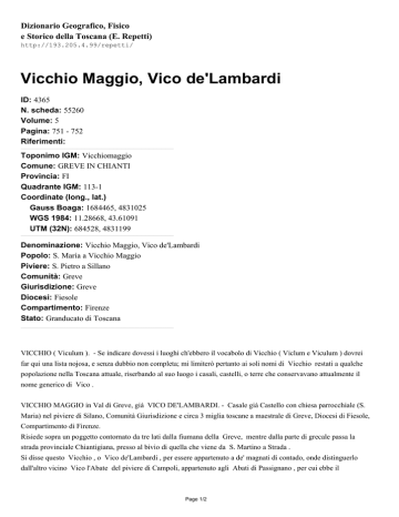 Dizionario Geografico, Fisico e Storico della Toscana (E. Repetti) http://193.205.4.99/repetti/ Vicchio Maggio, Vico de'Lambardi ID: 4365 N. scheda: 55260 Volume: 5 Pagina: 751 - 752 Riferimenti: ______________________________________ Toponimo IGM: Vicchiomaggio Comune: GREVE IN CHIANTI Provincia: FI Quadrante IGM: 113-1 Coordinate (long., lat.) Gauss Boaga: 1684465, 4831025 WGS 1984: 11.28668, 43.61091 UTM (32N): 684528, 4831199 ______________________________________ Denominazione: Vicchio Maggio, Vico de'Lambardi Popolo: S. Maria a Vicchio Maggio Piviere: S. Pietro a Sillano Comunità: Greve Giurisdizione: Greve Diocesi: Fiesole Compartimento: Firenze Stato: Granducato di Toscana ______________________________________ VICCHIO ( Viculum ). - Se indicare dovessi i luoghi ch'ebbero il vocabolo di Vicchio ( Viclum e Viculum ) dovrei far qui una lista nojosa, e senza dubbio non completa; mi limiterò pertanto ai soli nomi di Vicchio restati a qualche popolazione nella Toscana attuale, riserbando al suo luogo i casali, castelli, o terre che conservavano attualmente il nome generico di Vico . VICCHIO MAGGIO in Val di Greve, già VICO DE'LAMBARDI. - Casale già Castello con chiesa parrocchiale (S. Maria) nel piviere di Silano, Comunità Giurisdizione e circa 3 miglia toscane a maestrale di Greve, Diocesi di Fiesole, Compartimento di Firenze. Risiede sopra un poggetto contornato da tre lati dalla fiumana della Greve, mentre dalla parte di grecale passa la strada provinciale Chiantigiana, presso al bivio di quella che viene da S. Martino a Strada . Si disse questo Vicchio , o Vico de'Lambardi , per essere appartenuto a de' magnati di contado, onde distinguerlo dall'altro vicino Vico l'Abate del piviere di Campoli, appartenuto agli Abati di Passignano , per cui ebbe il Page 1/2 Dizionario Geografico, Fisico e Storico della Toscana (E. Repetti) http://193.205.4.99/repetti/ nomignolo che tuttora conserva di Vico l'Abate . - Vedere VICO L'ABATE. Al Vicchio Maggio , ossia de' Lambardi sembra che debbano riferire diverse pergamene della Badia di Passignano nell'ARCH. DIPL. FIOR. scritte intorno al mille in Vicchio , una delle quali in settembre 957. E'un contratto di affitto di beni posti nel piviere di Silano che il nobile Littifredo figlio del fu Adolardo concedeva a terza persona per l'annua responsione di denari 20 di argento da recarsi nel suo castello di Vicchio . - Anche due altre membrane dell'anno 993, due giugno, e 994, 30 del mese di agosto, furono rogate nel castello medesimo di Vicchio . - (loc.cit.) Con la prima di esse i due fratelli Ubaldo e Guido figliuoli di Walfredo vendettero per il prezzo di soldi 80 di argento a Teuzzo del fu Bernardo la loro porzione di beni pervenutigli da due altri fratelli, Eriberto e Winildo, le quali sostanze, state acquistate dal nobile Littifredo loro zio, consistevano in due sorti con case poste in luogo Valle (S. Martino a) nel piviere di Silano. L'altro istrumento del 30 agosto 994 rammenta un Littifredo figlio di altro Littifredo seniore di sopra nominato. Arroge che un terzo contratto del novembre 999 si scuopre qualmente Littifredo del fu Littifredo aveva per moglie donna Imilda, di consenso alla quale egli con quell'atto vendé per soldi 30 a diversi fratelli figli di Wilfredo alcuni beni posti nel poggio di Valle presso la chiesa di S. Martino. (loc.cit.) - Vedere VALLE (S. MARTINO A) e VERRAZZANO in Val di Greve, dove citai un altro istrumento del 12 marzo 1150 scritto in Vicchio de'Lambardi . La parrocchia di S. Maria a Vicchio Maggio nel 1833 noverava 153 individui. Page 2/2