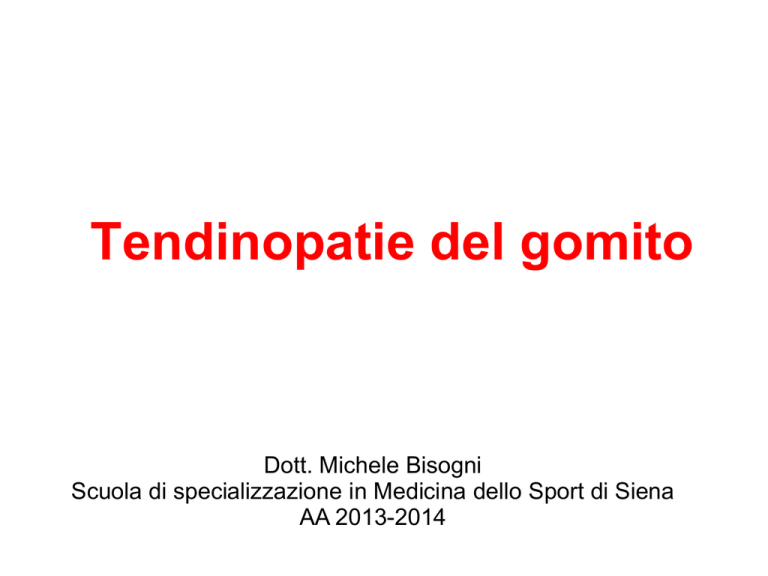 Tendinopatie del gomito Dott. Michele Bisogni Scuola di specializzazione in Medicina dello Sport di Siena AA 2013-2014 Epicondilite laterale (tennis elbow) Affezione dei muscoli estensori del polso alla loro origine sull’epicondilo laterale. La sede principale delle alterazioni patologiche è l’origine aponeurotica dell’estensore radiale breve del carpo (ERBC). Epicondilite laterale (tennis elbow) Anatomia dei mm estensori: I 4 muscoli estensori creano un movimento di estensione principalmente in corrispondenza del polso e delle dita. Sono situati lungo la superficie laterale e posteriore dell’avambraccio. Origine prossimale: • L’origine dell’estensore radiale breve del carpo (ERCB) e la parte superficiale del supinatore sono fuse insieme ed inseparabili. Entrambe originano dall’epicondilo laterale, dalla capsula e dal legamento anulare. • L’ estensore radiale lungo del carpo (ERCL) origina dall’epicondilo laterale. • L’estensore comune delle dita origina in parte anch’esso dall’epicondilo. Epicondilite laterale (tennis elbow) Colpisce prevalentemente soggetti nella IV-VI decade di vita. L’epicondilo laterale è 7 volte più colpito rispetto a quello laterale. Fattori rischio: - Fattori biomeccanici - Gesti sportivi scorretti - Flesso-estensioni del gomito ripetitive o iperattività in pronosupinazione e sovraccarico Epicondilite laterale (tennis elbow) Patogenesi: La lesione essenziale è di tipo degenerativo, è situata a livello dell’ origine (o vicino) degli estensori. La lesione più comune che determina dolore a livello dell’epicondilo laterale è a livello del tendine dell’ ERCB, con un possibile coinvolgimento del EDC. Patologia microscopica: la lesione patologica descritta è un’ iperplasia angiofibroblastica (ovvero una processo necroticodegenerativo). Diversi recenti studi infatti hanno dimostrato la completa assenza di componenti infiammatorie. Tendinosi >>> Tendinite Epicondilite laterale (tennis elbow) EO: - Dolorabilità puntale sull’origine dell’ERBC all’epicondilo laterale (è il segno più frequente) - Dolore esacerbato dall’ estensione del polso quando il gomito è completamente steso. - Dolore esacerbato dall’ estensione del polso controR ad avambraccio pronato - “Chair test”: chiedere al pz di sollevare una sedia con la mano pronata - “Coffeee cup test”: dolore localizzato allìepicondilo laterale quando si solleva una tazza grande da caffè (è patognomonico). Epicondilite laterale (tennis elbow) Test di Mills: dolore sull’epicondilo laterale quando polso e dita sono flessi completamente. Test di Maudsley: dolore all’estensione controR del medio alla MCF a gomito completamente esteso. Imaging: quasi mai necessario. La diagnosi è clinica. Epicondilite laterale (tennis elbow) DD: - sdr canale radiale: ricercare parestesie sensitive nella distribuzione del n. radiale. spesso coesiste con l’epicondilite. Il dolore in questo caso è localizzato sul punto di compressione del nervo che solitamente è 4-5cm sotto all’epicondilo. - radicolopatia cervicale: esaminare le radici cervicali - patologie intraarticolari - instabilità articolare: storia di pregresse lussazioni o importanti stress in varo Epicondilite mediale (golfer’s elbow) Affezione che coinvolge i muscoli flessori del polso (pronatore rotondo e flessore radiale del carpo) sull’epicondilo mediale. Molto meno frequente dell’epicondilite laterale. Patogenesi: Sovraccarico o carichi ripetuti Fibrosi e microrotture. Il processo degenerativo è una tendinosi (anziché tendinite). Fattori rischio: - Fattori biomeccanici - Gesti sportivi scorretti - Sollecitazioni in valgo e trazioni ripetitive. Epicondilite mediale EO: - Dolore e dolorabilità alla palpazione localizzata all’epicondilo mediale, con la flessione del polso e pronazione controR - Dolore riprodotto stringendo il pugno - Riduzione della forza di presa DD: - rottura del LCU: il test in valgo stressa apre l’articolazione esame - Neuropatia dell’ulnare Epicondilite - Trattamento Storia naturale: la semplice educazione del pz e l’evitare attività aggravanti porta a risoluzione spontanea dei sintomi in 6-12 mesi. Modificazione attività da sola porta a successo nel 78% dei casi a 6 mesi. Fisioterapia (ultrasuoni pulsati + esercizi di stretching e rinforzo) determina migliori risultati rispetto alla semplice modificazione dell’attività. Infiltrazioni cortisone, agopuntura, onde urto-extracorporee (ESWT) non sembrano portare grossi benefici [Smidt et al] Epicondilite - Trattamento L’iniezione locale di corticosteroidi determina migliori risultati a 6 settimane rispetto agli altri trattamenti. Tuttavia gli effetti benefici si perdono a 3 mesi, ed anzi i pazienti risultano peggiori rispetto a chi ha fatto fisoterapia o nulla a 6 e 12 mesi. L’iniezione di cortisone quindi determina miglioramenti solo a breve termine. Epicondilite - Trattamento Raccomandazioni sull’iniezioni di cortisone: Non iniettare più frequentemente di una volta ogni 3 mesi e non più di 3 iniezioni l’anno per evitare una possibile rottura tendinea. Tecnica: 2ml lidocaina, ago 2,5 cm con calibro 25 centrato sul punto di massima dolorabilità all’origine dell’ERBC (senza penetrare nel tendine). Poi cambiare siringa ed iniettare 0,5 ml di betametasone Epicondilite - Trattamento Similmente, l’agopuntura ha mostrato migliori risposte a 2 settimane, ma già a 1-2 mesi non ci sono differenze significative rispetto a placebo [Fink et al; Molsberger et Hille; Davidson et al] Anche l’impego di ESWT non determina miglioramenti statisticamente significativi rispetto a placebo. [Buchbinder et al] Studi sull’utilizzo di farmaci anti-infiammatori non steroidei (NSAIDs) mostrano evidenze contrastanti. L’utilizzo di NSAIDs topici tuttavia sembra essere > placebo nel breve termine e senza gli effetti collaterali dei NSAIDs sistemici. [Green et al] L’utilizzo di iniezioni di Botox non sembra portare a signif