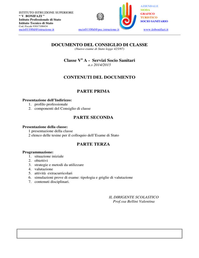 AZIENDALE MODA GRAFICO TURISTICO SOCIO SANITARIO ISTITUTO ISTRUZIONE SUPERIORE “ V. BONIFAZI ” Istituto Professionale di Stato Istituto Tecnico di Stato Cod. Fiscale 93017100434 [email protected] [email protected] www.iisbonifazi.it DOCUMENTO DEL CONSIGLIO DI CLASSE (Nuovo esame di Stato legge 425/97) Classe Va A - Servizi Socio Sanitari a.s 2014/2015 CONTENUTI DEL DOCUMENTO PARTE PRIMA Presentazione dell’Indirizzo: 1. profilo professionale 2. componenti del Consiglio di classe PARTE SECONDA Presentazione della classe: 1 presentazione della classe 2 elenco delle tesine per il colloquio dell’Esame di Stato PARTE TERZA Programmazione: 1. situazione iniziale 2. obiettivi 3. strategie e metodi da utilizzare 4. valutazione 5. attività extracurricolari 6. simulazioni prove di esame: tipologia e griglie di valutazione 7. contenuti disciplinari. IL DIRIGENTE SCOLASTICO Prof.ssa Bellini Valentina PRESENTAZIONE DELL’INDIRIZZO PROFILO PROFESSIONALE L’Operatore Socio Sanitario concorre a : • • • • organizzare e stimolare attività culturali, ricreative ed espressive in tutte le istituzioni che si occupano del minore, degli anziani, dei disabili che trovano difficoltà nell’inserimento delle strutture ospitanti; collaborare con gli utenti per l’utilizzo dei servizi socio-sanitari esistenti nel territorio; facilitare l’espletamento delle diverse pratiche burocratiche; individuare i bisogni problematici degli “svantaggiati”, per favorire l’integrazione e l’inserimento degli stessi nella cultura di arrivo. Dal punto di vista formativo il l’OSS deve pervenire al raggiungimento di competenze e di abilità atte a: • • • • • • leggere ed interpretare la complessa realtà del territorio; individuare e analizzare le particolari situazioni di determinate categorie di persone, al fine di ricercare gli strumenti capaci di migliorare la qualità della loro vita; contribuire al massimo dello sviluppo di autonomia e di autosufficienza di ogni soggetto, soprattutto attraverso il coordinamento e l’integrazione con gli altri operatori dei servizi sociali; utilizzare adeguate tecniche di osservazione e di ricerca; porsi in relazione con l’utenza, utilizzando diverse tecniche comunicative; svolgere il lavoro di èquipe, confrontandosi con altre figure professionali. COMPONENTI DEL CONSIGLIO DI CLASSE Italiano – Storia Prof.ssa Guzzini Chiara Matematica Prof.ssa Patriarca Daniela Lingua Inglese Prof.ssa Pezzola Tiziana Lingua Francese Prof.ssa Maggini Lugana Diritto ed Economia Prof. Micozzi Paolo Cultura Medico- Sanitaria Prof.ssa Cerasani Laura Psicologia Generale Prof.ssa Bernabei Antonio Tecnica Amministrativa Prof. Marchei Francesco Educazione Fisica Prof. Staffolani Barbara Religione Prof. Garofolo Marcella Sostegno Prof.ssa Canestrari Gianluca Coordinatore di Classe Prof.ssa Guzzini Chiara PRESENTAZIONE DELLA CLASSE V SEZ. A S.S.S. La classe è composta da 16 studenti( 3 studenti e 13 studentesse) provenienti da Recanati e zone limitrofe; una studentessa è di nazionalità straniera. La classe ha assunto l’attuale configurazione a seguito di uscite derivanti da bocciature o inserimenti successivi di alunni provenienti da altri Istituti. Sotto il profilo della socializzazione la classe è sufficientemente unita e affiatata; il comportamento tenuto è generalmente corretto; c’è interesse e partecipazione. Prevale, in generale una accettabile motivazione allo studio anche se focalizzata soprattutto alle circostanze istituzionali di verifiche scritte e orali. Si distinguono alcuni studenti che hanno acquisito conoscenze approfondite nella maggior parte dei contesti disciplinari. Altri studenti hanno evidenziato buone capacità di applicazione ed hanno conseguito conoscenze più che sufficienti, in qualche caso discrete, dei contenuti disciplinari riuscendo talvolta, a rielaborarli in modo personale. Altri ancora hanno mostrato un adeguato livello di impegno raggiungendo risultati complessivamente o completamente sufficienti anche se differenziati tra le varie discipline. I rimanenti studenti, infine, hanno talvolta mostrato difficoltà in quest’ultimo anno di corso, in alcune circostanze, a causa di uno studio e/ o di frequenza non sempre adeguati. Gli stessi hanno conseguito una preparazione superficiale, acquisendo gli elementi essenziali in non tutti i contesti disciplinari. Del gruppo classe fa parte una alunna con programmazione semplificata ed un’alunna con programmazione differenziata; per entrambe si fa riferimento alle relazioni del docente specializzato. Tali relazioni vengono allegate al presente documento di classe. Del gruppo classe fa parte anche uno studente con disturbi specifici dell’apprendimento (DSA). Si ricorda la necessità eventuale di leggergli i testi delle prove d’esame e comunque le certificazioni e il PDP relativi sono agli atti dell’Istituto e a disposizione della commissione esaminatrice. Da porre in chiara evidenza che molti studenti della classe stanno frequentando e ultimando il percorso aggiuntivo per il conseguimento della qualifica professionale di operatore socio sanitario. Tutti gli studenti hanno frequentato stage presso aziende/enti di settore per un totale di 100 ore, a cui si aggiungono 320 ore di tirocinio, Negli anni di corso terzo e quarto, inoltre, gli alunni hanno fatto esperienza di alternanza scuola-lavoro, per un totale di 240 ore. Infine gli alunni hanno svolto un corso di clownterapia presso il nostro Istituto, con relativo tirocinio presso un reparto pediatrico. Alcuni studenti hanno aderito ad un corso E4U con fondo sociale europeo, conclusosi con un viaggio soggiorno-studio di tre settimane in Irlanda. TESINE PER IL COLLOQUIO DELL’ESAME DI STATO NOME TITOLO BARBONI GABRIELLA Il tuo meraviglioso silenzio BARTOLINI MARCO La parte dell’occhio BOCCANERA NATASCIA L’IRCER e la mia esperienza nel sociale BRIZI RITA Angeli: custodi dell’anima CARNEVALI AURORA Epilessia CAVALIERI LUDOVICA La perd