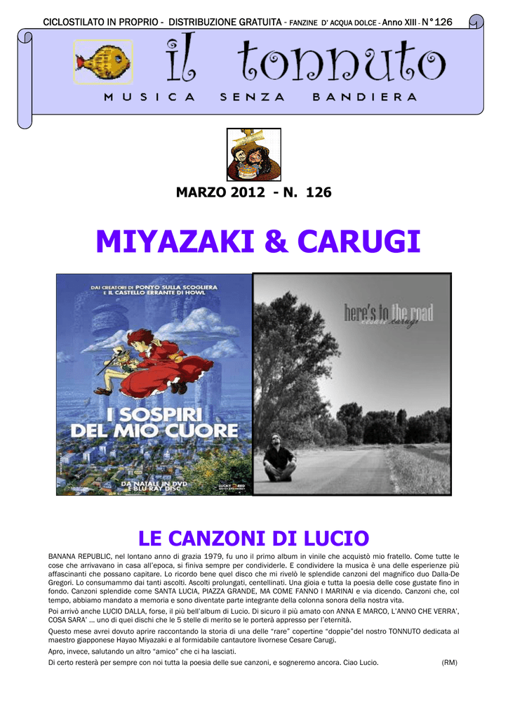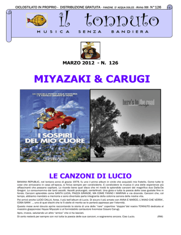 CICLOSTILATO IN PROPRIO - DISTRIBUZIONE GRATUITA - FANZINE D’ ACQUA DOLCE - Anno XIII - N°126 MARZO 2012 - N. 126 MIYAZAKI & CARUGI LE CANZONI DI LUCIO BANANA REPUBLIC, nel lontano anno di grazia 1979, fu uno il primo album in vinile che acquistò mio fratello. Come tutte le cose che arrivavano in casa all’epoca, si finiva sempre per condividerle. E condividere la musica è una delle esperienze più affascinanti che possano capitare. Lo ricordo bene quel disco che mi rivelò le splendide canzoni del magnifico duo Dalla-De Gregori. Lo consumammo dai tanti ascolti. Ascolti prolungati, centellinati. Una gioia e tutta la poesia delle cose gustate fino in fondo. Canzoni splendide come SANTA LUCIA, PIAZZA GRANDE, MA COME FANNO I MARINAI e via dicendo. Canzoni che, col tempo, abbiamo mandato a memoria e sono diventate parte integrante della colonna sonora della nostra vita. Poi arrivò anche LUCIO DALLA, forse, il più bell’album di Lucio. Di sicuro il più amato con ANNA E MARCO, L’ANNO CHE VERRA’, COSA SARA’ … uno di quei dischi che le 5 stelle di merito se le porterà appresso per l’eternità. Questo mese avrei dovuto aprire raccontando la storia di una delle “rare” copertine “doppie”del nostro TONNUTO dedicata al maestro giapponese Hayao Miyazaki e al formidabile cantautore livornese Cesare Carugi. Apro, invece, salutando un altro “amico” che ci ha lasciati. Di certo resterà per sempre con noi tutta la poesia delle sue canzoni, e sogneremo ancora. Ciao Lucio. (RM) DISCHI DEL MESE CESARE CARUGI “HERE’S TO THE ROAD” di Rho Mauro Da qualche parte sul suo corpo Cesare Carugi deve avere impresso a fuoco il marchio “MADE IN U.S.A.”. Classe 1978 originario di Marina di Cecina in provincia di Livorno Carugi ha confezionato uno di quei dischi che meritano senza ombra di dubbio le 5 stellette che consacrano le “grandi opere”. HERE’S TO THE ROAD è il suo debutto discografico ed è un debutto coi fiocchi. Musica 100% AMERICANA, suonata in maniera impeccabile e cantata da Cesare in un idioma perfetto. Un capolavoro che ha trovato un riscontro di critiche positive a 360 gradi. Tutte le maggiori riviste di settore hanno incensato HERE’S TO THE ROAD e ricoperto di complimenti Carugi. Anche oltreoceano il lavoro di Carugi ha avuto critiche più che positive. Ci accodiamo, umilmente, a quanto già letto-visto-sentito. Chi potrebbe avere il coraggio di trovare un solo difetto a questo disco? Solo un (musicalmente parlando) miope recensore potrebbe parlarne male. Undici canzoni, come un dream team. Undici canzoni come undici campioni. Si parte con TOO LATE TO LEAVE MONTGOMERY ballata di forte impatto e degna partenza di un disco che ci porta sulla strade d’America. Chitarre in bell’evidenza e l’armonica di Carugi che detta il passo. Deliziosa è LONDON RAIN altra ballata di notevole spessore con una sessione ritmica che fa scintille e la voce di Carugi che regala forti emozioni. BLUE DRESS è una ballata cinematografica … un po’ “alla Quentin Tarantino”. Canzone dove c’è la notte, la pioggia blu neon e non manca certo il sangue. Grande canzone. GOODBYE GRACELAND è una bella ballata che ci conduce dritta a CAROLINE che è, senza dubbio, una delle gemme dell’album. Una ballata dai tenui colori pastello impreziosita dal violino del fenomenale Fulvio A.T. Renzi e dalle doti vocali della “nostra” cantautrice fiorentina preferita: Giulia Millanta. Ascoltata e riascoltata questa canzone regala fortissime emozioni. Senza poi togliere meriti a nessun altro, va sottolineato come il violino di A.T. Renzi sia prezioso nel ricamare le melodie scritte da Carugi. Fuoriclasse. Quindi è la volta della canzone “perfetta”. Quella che uno sogna di scrivere ogni notte. E Carugi l’ha scritta, cantata e stampata su cd. DAKOTA LIGHTS & THE MAN WHO SHOT JOHN LENNON è già candidata ad essere la nostra canzone dell’anno 2012. Una piano – ballad intensa come mai e con il contributo vocale del cantautore americano Michael McDermott. Un capolavoro assoluto. Una canzone che sembra uscire direttamente dal songbook del Bruce Springsteen più ispirato. THERE AIN’T NOTHIN’ WRONG WITH GOIN’ NOWHERE è una traccia decisamente rock, con la partecipazione straordinaria di Mike Ballini (già chitarrista de l’Orchestra Del Rumore Ordinato) a dettare le coordinate di viaggio. DEATH AND TAXES, già dal titolo è tutto un programma. Le sacrosante riflessioni di Carugi sono accompagnate in maniera impeccabile dalle sapienti note delle tastiere di Gianfilippo Boni (già con Max Larocca) e dalle chitarre di Leonardo Ceccanti. 32 SPRINGS vede Carugi duettare con l’amico e compagno di tour Riccardo Maffoni. I due, insieme, sono decisamente un bel sentire. EVERY RAIN COMES TO WASH IT ALL CLEAN parte con le “taglienti lame” delle chitarre suonate dal già citato Mike Ballini e da un altro illustre ospite: Daniele Tenca. E su questi riff chitarristici si dipana quest’altra splendida rock-ballad. CUMBERLAND chiude il disco e lo chiude in maniera perfetta. Si tratta di una stupenda e riflessiva ballata che viene impreziosita dalla possente voce del nostro Max Larocca. Indubbio valore aggiunto anche la lap-steel suonata da Paolo Loppi che abbiamo ammirato dal vivo lo scorso anno in compagnia di Giulia Millanta. Di HERE’S TO THE ROAD, come detto in precedenza, ho letto diverse recensioni, tra quelle sulla carta stampata e quelle delle riviste e blog online. Tutte ne hanno esaltato la bellezza genuina, spontanea. Il debutto di Cesare Carugi è stato a tutti gli effetti un debutto col botto. Sospeso tra le melodie senza tempo e la poesia di gente come John Denver, Jim Croce e il rock a volte “picchiato” e a volte “sussurrato” di uno come Bruce Springsteen Cesare Carugi si issa in vetta alle nostre preferenze 2012. HERE’S TO THE ROAD è un grandissimo disco. (Cesare Carugi – foto tratta da Reverbnation) Sito ufficiale: www.cesarecarugi.com GIORGIO CONTE 