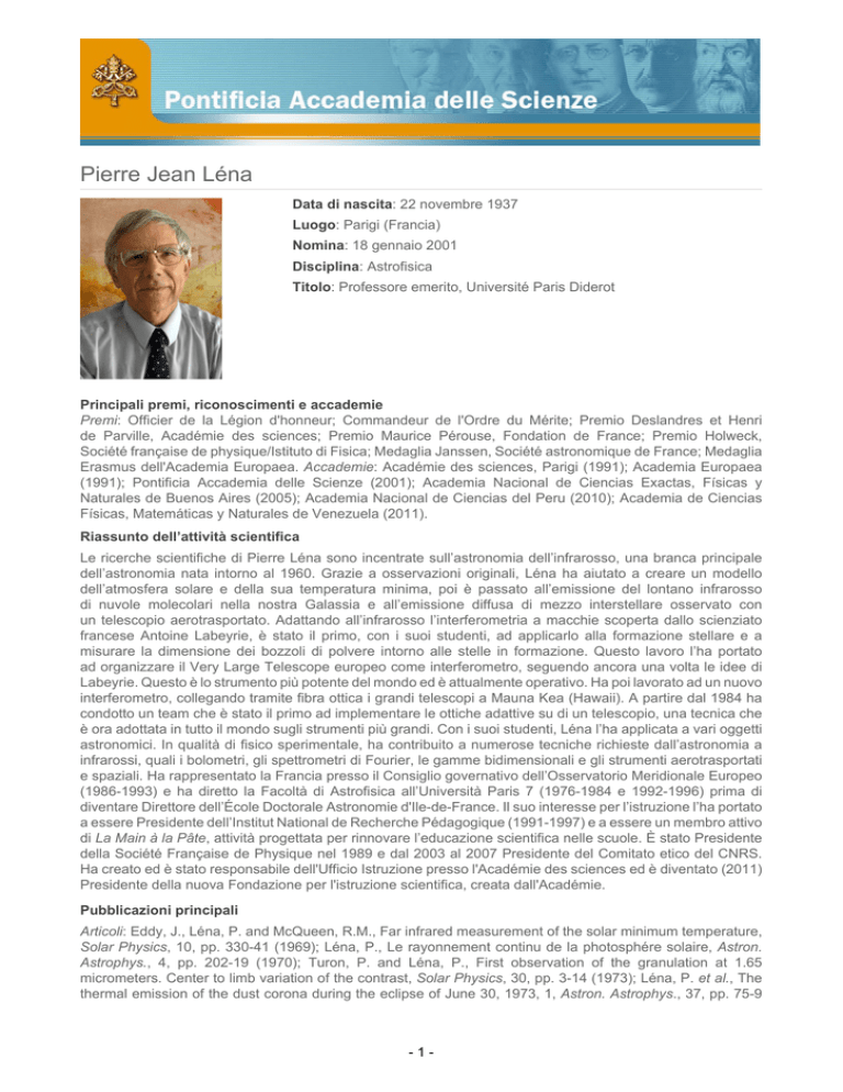 Pierre Jean Léna Data di nascita: 22 novembre 1937 Luogo: Parigi (Francia) Nomina: 18 gennaio 2001 Disciplina: Astrofisica Titolo: Professore emerito, Université Paris Diderot Principali premi, riconoscimenti e accademie Premi: Officier de la Légion d'honneur; Commandeur de l'Ordre du Mérite; Premio Deslandres et Henri de Parville, Académie des sciences; Premio Maurice Pérouse, Fondation de France; Premio Holweck, Société française de physique/Istituto di Fisica; Medaglia Janssen, Société astronomique de France; Medaglia Erasmus dell'Academia Europaea. Accademie: Académie des sciences, Parigi (1991); Academia Europaea (1991); Pontificia Accademia delle Scienze (2001); Academia Nacional de Ciencias Exactas, Físicas y Naturales de Buenos Aires (2005); Academia Nacional de Ciencias del Peru (2010); Academia de Ciencias Físicas, Matemáticas y Naturales de Venezuela (2011). Riassunto dell’attività scientifica Le ricerche scientifiche di Pierre Léna sono incentrate sull’astronomia dell’infrarosso, una branca principale dell’astronomia nata intorno al 1960. Grazie a osservazioni originali, Léna ha aiutato a creare un modello dell’atmosfera solare e della sua temperatura minima, poi è passato all’emissione del lontano infrarosso di nuvole molecolari nella nostra Galassia e all’emissione diffusa di mezzo interstellare osservato con un telescopio aerotrasportato. Adattando all’infrarosso l’interferometria a macchie scoperta dallo scienziato francese Antoine Labeyrie, è stato il primo, con i suoi studenti, ad applicarlo alla formazione stellare e a misurare la dimensione dei bozzoli di polvere intorno alle stelle in formazione. Questo lavoro l’ha portato ad organizzare il Very Large Telescope europeo come interferometro, seguendo ancora una volta le idee di Labeyrie. Questo è lo strumento più potente del mondo ed è attualmente operativo. Ha poi lavorato ad un nuovo interferometro, collegando tramite fibra ottica i grandi telescopi a Mauna Kea (Hawaii). A partire dal 1984 ha condotto un team che è stato il primo ad implementare le ottiche adattive su di un telescopio, una tecnica che è ora adottata in tutto il mondo sugli strumenti più grandi. Con i suoi studenti, Léna l’ha applicata a vari oggetti astronomici. In qualità di fisico sperimentale, ha contribuito a numerose tecniche richieste dall’astronomia a infrarossi, quali i bolometri, gli spettrometri di Fourier, le gamme bidimensionali e gli strumenti aerotrasportati e spaziali. Ha rappresentato la Francia presso il Consiglio governativo dell’Osservatorio Meridionale Europeo (1986-1993) e ha diretto la Facoltà di Astrofisica all’Università Paris 7 (1976-1984 e 1992-1996) prima di diventare Direttore dell’École Doctorale Astronomie d'Ile-de-France. Il suo interesse per l’istruzione l’ha portato a essere Presidente dell’Institut National de Recherche Pédagogique (1991-1997) e a essere un membro attivo di La Main à la Pâte, attività progettata per rinnovare l’educazione scientifica nelle scuole. È stato Presidente della Société Française de Physique nel 1989 e dal 2003 al 2007 Presidente del Comitato etico del CNRS. Ha creato ed è stato responsabile dell'Ufficio Istruzione presso l'Académie des sciences ed è diventato (2011) Presidente della nuova Fondazione per l'istruzione scientifica, creata dall'Académie. Pubblicazioni principali Articoli: Eddy, J., Léna, P. and McQueen, R.M., Far infrared measurement of the solar minimum temperature, Solar Physics, 10, pp. 330-41 (1969); Léna, P., Le rayonnement continu de la photosphére solaire, Astron. Astrophys., 4, pp. 202-19 (1970); Turon, P. and Léna, P., First observation of the granulation at 1.65 micrometers. Center to limb variation of the contrast, Solar Physics, 30, pp. 3-14 (1973); Léna, P. et al., The thermal emission of the dust corona during the eclipse of June 30, 1973, 1, Astron. Astrophys., 37, pp. 75-9 -1- (1974); Rouan, D., Léna, P., Puget, J.L., de Boer, K. and Wijnbergen, J., Far infrared observations of the galactic plane and molecular cloud S 140, Ap. J., 213, L35-39 (1977); Chelli, A., Léna, P. and Sibille, F., Angular dimensions of accreting young stars, Nature, 278, pp. 143-6 (1979); Sibille, F., Chelli, A. and Léna P., Infrared speckle interferometry, Astron. Astrophys., pp. 315-28 (1979); Chelli, A., Perrier, C. and Léna, P., The sub-arcsecond structure of I Rc at 5 µm, Astrophys. J., 280, p. 163 (1984); Jiang Dong-rong, Perrier, C. and Léna, P., NGC2024 IRS2, Infrared speckle interferometry and nature of the source, Astron. Astrophys., 135, pp. 249-54 (1984); Roddier, F. and Léna, P., Long baseline Michelson interferometry with large ground based telescopes at optical wavelengths, I & II, Journ. Optics, 15, pp. 171-82 & pp. 363-74 (1984); Léna, P. and Merkle, F., The interferometric mode of the European Very Large Telescope, Astroph. Sp. Sc., 160, pp. 363-8 (1989); Rousset, G., Fontanella, J.C., Kern, P., Gigan, P., Rigaut, F., Léna, P. et al., First diffraction-limited astronomical images with adaptive optics, Astron. Astrophys., 230, L29-32 (1990); Gendron, E. and Léna, P., Astronomical adaptive optics. I. Modal control optimization, Astron. Astrophys., 291, pp. 337-47 (1994); Mariotti, J.-M., Coudé du Foresto, V., Perrin, G., Zhao, P. and Léna, P., Interferometric connection of large ground based telescopes, Astron. Astrophys. Suppl. Series, 116, pp. 381-93 (1996); Clénet, Y., Rouan, D., Gendron, E., Montri, J., Rigaut, F., Léna, P. and Lacombe, F., Adaptive optic L-band observations of the Galactic Center region, Astron. Astrophys., 376, p. 124 (2001); Glanc, M., Gendron, E., Lacombe, F., Lafaille, D., Le Gargasson, J.F. and Léna, P., Towards wide field retinal imaging with adaptive optics, Opt. Comm., 230, pp. 225-38 (2004). Libri: Lumières. Une introduction aux phénomènes optiques, avec A. Blanchard, InterEditions, 1990; Astrophysique: méthodes physiques de l'observation