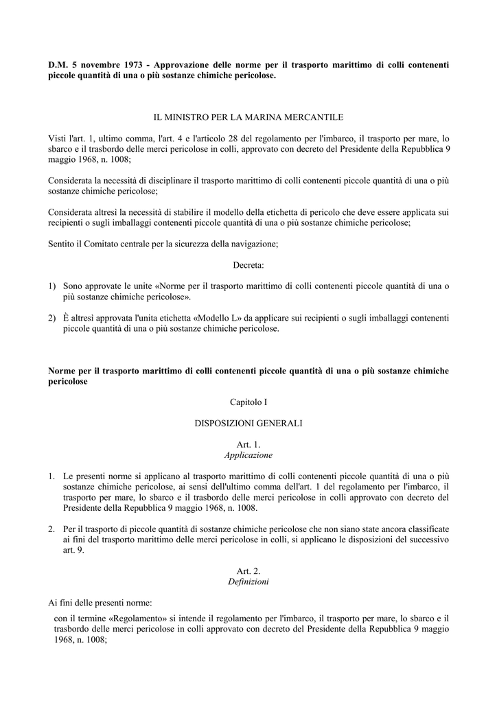 D.M. 5 novembre 1973 - Approvazione delle norme per il trasporto marittimo di colli contenenti piccole quantità di una o più sostanze chimiche pericolose. IL MINISTRO PER LA MARINA MERCANTILE Visti l'art. 1, ultimo comma, l'art. 4 e l'articolo 28 del regolamento per l'imbarco, il trasporto per mare, lo sbarco e il trasbordo delle merci pericolose in colli, approvato con decreto del Presidente della Repubblica 9 maggio 1968, n. 1008; Considerata la necessità di disciplinare il trasporto marittimo di colli contenenti piccole quantità di una o più sostanze chimiche pericolose; Considerata altresì la necessità di stabilire il modello della etichetta di pericolo che deve essere applicata sui recipienti o sugli imballaggi contenenti piccole quantità di una o più sostanze chimiche pericolose; Sentito il Comitato centrale per la sicurezza della navigazione; Decreta: 1) Sono approvate le unite «Norme per il trasporto marittimo di colli contenenti piccole quantità di una o più sostanze chimiche pericolose». 2) È altresì approvata l'unita etichetta «Modello L» da applicare sui recipienti o sugli imballaggi contenenti piccole quantità di una o più sostanze chimiche pericolose. Norme per il trasporto marittimo di colli contenenti piccole quantità di una o più sostanze chimiche pericolose Capitolo I DISPOSIZIONI GENERALI Art. 1. Applicazione 1. Le presenti norme si applicano al trasporto marittimo di colli contenenti piccole quantità di una o più sostanze chimiche pericolose, ai sensi dell'ultimo comma dell'art. 1 del regolamento per l'imbarco, il trasporto per mare, lo sbarco e il trasbordo delle merci pericolose in colli approvato con decreto del Presidente della Repubblica 9 maggio 1968, n. 1008. 2. Per il trasporto di piccole quantità di sostanze chimiche pericolose che non siano state ancora classificate ai fini del trasporto marittimo delle merci pericolose in colli, si applicano le disposizioni del successivo art. 9. Art. 2. Definizioni Ai fini delle presenti norme: con il termine «Regolamento» si intende il regolamento per l'imbarco, il trasporto per mare, lo sbarco e il trasbordo delle merci pericolose in colli approvato con decreto del Presidente della Repubblica 9 maggio 1968, n. 1008; con il termine «Ministero» si intende il Ministero della marina mercantile - Direzione generale della navigazione e del traffico marittimo. Art. 3. Dichiarazione Ogni carico di sostanze chimiche pericolose, spedito ai sensi delle presenti norme, dev'essere corredato da una dichiarazione rilasciata da un laboratorio di una amministrazione pubblica o da un chimico abilitato all'esercizio della professione attestante che i colli sono conformi alle disposizioni contenute nelle presenti norme. Art. 4. Imballaggio 1. I recipienti interni a contatto con le sostanze chimiche pericolose trasportate ai sensi delle presenti norme non devono essere di un tipo non autorizzato per le stesse sostanze trasportate in base alle norme particolari delle classi da 1 a 9 del regolamento, salvo specifica approvazione da parte del Ministero. 2. I recipienti interni devono essere immobilizzati negli imballaggi esterni in modo da impedire il loro spostamento anche quando il collo venga capovolto. 3. Gli imballaggi esterni devono essere a pareti piene e tali da resistere alle manipolazioni normalmente necessarie per lo stivaggio ed il trasporto. 4. Come imballaggi esterni possono essere impiegati: a) casse o scatole di legno (legno segato, compensato o ricostituito); b) recipienti rigidi di materia plastica o metallo adatti; c) robusti fusti di fibra o di materia plastica; d) fusti di metallo. 5. I recipienti di cartone possono essere utilizzati come imballaggio esterno soltanto per colli da stivare sotto il ponte, a condizione che: − − − − − il peso netto complessivo delle sostanze contenute non oltrepassi i kg 15. Qualora il recipiente sia di robusta costruzione e consentito dal Ministero, il peso netto massimo delle sostanze può essere anche di kg 30; il contenuto netto di ogni recipiente interno non ecceda litri 1 per i liquidi e kg 2 per i solidi. Qualora il recipiente sia di robusta costruzione e consentito dal Ministero, il contenuto netto di ogni recipiente interno può essere anche di litri 2,5 per i liquidi e kg 5 per i solidi; i liquidi siano contenuti in recipienti non fragili, salvo il caso in cui essi siano racchiusi in confezioni consentite dal Ministero; i colli pronti per la spedizione non presentino segni di schiacciamento dopo una prova di pressione statica di kg 75; le sostanze contenute nei recipienti di cartone non siano suscettibili di reagire pericolosamente tra di loro. 6. I recipienti di materia plastica espansa, consentiti dal Ministero, possono essere impiegati come imballaggio esterno a condizione che: − le sostanze da trasportare non attacchino la materia plastica; − ogni recipiente interno abbia una capacità non superiore a litri 2,5; − ogni recipiente abbia una capacità non superiore a litri 15 di sostanza. 7. I recipienti fragili non sono considerati tali quando siano racchiusi, anche in più di uno, entro un recipiente non fragile costruito in modo tale che, in caso di rottura o colamento del recipiente fragile, il contenuto non ne possa fuoriuscire. Art. 5. Limiti di quantità 1. Salvo quanto diversamente stabilito dalle successive disposizioni particolare, le quantità massime ammesse per ogni recipiente non debbono essere superiori a: − kg 6 per le sostanze solide; − litri 3 per le sostanze liquide contenute in recipienti fragili; − litri 5 per le sostanze liquide contenute in recipienti non fragili. 2. Il peso lordo dei colli non deve superare: − kg 150 se il collo è composto di recipienti interni non fragili; − kg 75 se il collo è composto di recipienti interni fragili. 3. Qualora le sostanze siano sotto forma di pastiglie oppure sistemate in recipienti sigillati (ampolle, capsule, ecc.) il cui contenuto non superi grammi 15 netti, la quan