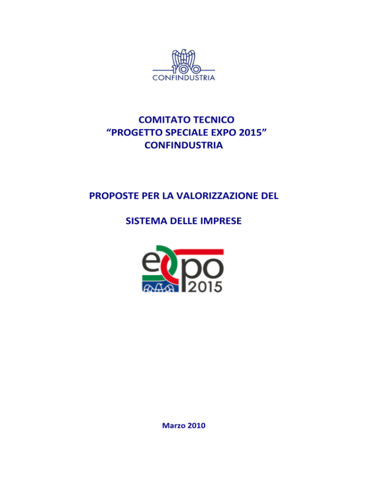 COMITATO TECNICO “PROGETTO SPECIALE EXPO 2015” CONFINDUSTRIA PROPOSTE PER LA VALORIZZAZIONE DEL SISTEMA DELLE IMPRESE Marzo 2010 INDICE DEI CONTENUTI INTRODUZIONE E OBIETTIVI 5 ARTICOLAZIONE GRUPPI DI LAVORO DEL PROGETTO SPECIALE EXPO 2015 DI CONFINDUSTRIA 7 1. 2. IL PROGETTO SPECIALE EXPO 2015 DI CONFINDUSTRIA 8 1.1 Nutrizione 1.2 Innovazione e sviluppo sostenibile 11 1.3 Turismo culturale, attrattività e ricettività 12 1.4 Expo-generation e nuove professionalità 14 1.5 Promozione internazionale 16 1.6 Mobilità e reti 17 1.7 Cooperazione allo sviluppo 18 SUPPORTARE L’EVENTO NEL PERCORSO QUINQUENNALE DI REALIZZAZIONE E DURANTE I SEI MESI PREVISTI 2.1 2.2 8 21 Comunicare, promuovere, anticipare… Creare attrattività valorizzando il territorio per il visitatore e per il residente 21 Le proposte di Confindustria 23 Sviluppo dei piani strategici e operativi per i servizi complementari dell’Expo 24 Le proposte di Confindustria 25 2 3. PROGETTARE E COSTRUIRE LE INFRASTRUTTURE NAZIONALI, REGIONALI E LOCALI 3.1 3.2 3.3 4. 4.2 4.3 5. Partecipare attivamente come fornitori agli affidamenti di contratti per lavori, servizi e forniture 26 Le proposte di Confindustria 27 Partecipare attivamente agli investimenti per la fase di progettazione e costruzione delle infrastrutture previste 28 Le proposte di Confindustria 28 L’Expo digitale e le opportunità legate alle tecnologie dell’innovazione 29 Le proposte di Confindustria 30 CREARE IL POSIZIONAMENTO DELL’ ECCELLENZA IMPRENDITORIALE ITALIANA 4.1 26 31 Declinare il Tema dell’Expo tenendo conto delle vocazioni ed eccellenze produttive italiane 31 Le proposte di Confindustria 33 Un piano di comunicazione e di marketing sulle tematiche di interesse per le imprese 33 Le proposte di Confindustria 34 La collaborazione con i paesi partecipanti 35 Le proposte di Confindustria 38 IL PUNTO DI VISTA DELLE IMPRESE PER LO SVILUPPO DEL TEMA 39 5.1 La scienza per la sicurezza e la qualità alimentare 41 3 5.2 L’innovazione nella filiera alimentare 44 5.3 La tecnologia per l’agricoltura e la biodiversità 48 5.4 L’educazione alimentare 50 5.5 Solidarietà e cooperazione alimentare 53 5.6 L’alimentazione per migliori stili di vita 55 5.7 L’alimentazione nelle culture e nelle etnie 57 4 INTRODUZIONE E OBIETTIVI Introduzione Confindustria crede nell’Expo 2015, quale opportunità di crescita e di sviluppo: una straordinaria vetrina per l’Italia e il Made in Italy nel mondo, un’occasione di cooperazione e di partnership per creare business, recuperare competitività in nuovi mercati e Paesi, incrementare l’occupazione, attrarre investimenti ed esportare la cultura italiana nel mondo. Le cifre parlano da sole: 21 milioni di visitatori stimati, una ventina di miliardi di investimenti diretti e indiretti, 70.000 posti di lavoro in tutti i settori che beneficeranno della manifestazione, dal turismo alle imprese dei servizi, dal commercio all’edilizia, dal manifatturiero ai beni culturali. Soprattutto nella congiuntura attuale, l’Expo assume una valenza assolutamente strategica, perché è un driver anticiclico di crescita economica e occupazionale e un formidabile acceleratore per la realizzazione di infrastrutture che il sistema produttivo chiede da anni e che sono determinanti per la competitività delle imprese. L’Expo potrà sviluppare molte delle innumerevoli attrattività del Sistema Italia. Esso fungerà anche da impulso alle nuove tecnologie ecocompatibili, che possono dare un contributo concreto alla promozione dell’innovazione e al miglioramento dei processi produttivi, incoraggiando lo sviluppo di prodotti sostenibili, ed alle tecnologie che contribuiranno a dare risposte sostenibili ai fabbisogni alimentari di una popolazione mondiale in rapida crescita attraverso l’aumento della produttività agricola e alimentare. Il compito del mondo produttivo è costruire l’Expo B2B volando alto con idee, progetti e realizzazioni che mirano, oltre che a creare, centri di attrattiva per gli operatori, a trasformarsi in un eredità permanente per il Paese. Obiettivo del documento Obiettivo del presente documento è quello di identificare i principali temi di collaborazione fra Expo 2015 S.p.A. e il sistema imprenditoriale del nostro paese al fine di assicurare: Un ritorno di immagine per il sistema produttivo italiano, attraverso la promozione, anche espositiva, delle sue eccellenze nei diversi comparti interessati da Expo 2015 5 Opportunità di business e accordi commerciali o di altra natura con i paesi partecipanti Opportunità di investimento, che aiutino Expo 2015 nel difficile obiettivo di raggiungere un equilibrio di bilancio complessivo Un contributo sostanziale al rafforzamento del comparto turistico, grazie alle proposte di pacchetti turistici legati a Expo 2015 Massima visibilità alle gare di appalto che Expo 2015 pubblicherà nei mesi a venire, sia per la parte di progettazione e costruzione delle infrastrutture, sia per quella di gestione dell’evento. Il Documento presenta le riflessioni maturate e le attività sinora svolte nei sette Gruppi di Lavoro di Confindustria. Nei capitoli successivi, presenta le tre aree di interesse già delineate dal Comitato Tecnico “Progetto Speciale Expo 2015” e si propone di dettagliarli passando in rassegna i principali “presidi organizzativi” di Expo 2015, ed elaborando suggerimenti e proposte che potranno trovare momento di valutazione e discussione in appositi incontri bilaterali fra Expo 2015 S.p.A. e Confindustria. Metodologicamente, il Documento fa riferimento al Dossier di Candidatura, per tutti quegli aspetti per cui non siano stati ancora elaborati aggiornamenti significativi da parte della Società Expo 2015. 6 ARTICOLAZIONE GRUPPI DI LAVORO DEL PROGETTO SPECIALE EXPO 2015 2015 DI CONFINDUSTRIA NUTRIZIONE Coordinatore: Silvio Ferrari Consigliere incaricato Federalimentare - Amministratore Delegato Cargill INNOVAZIONE E SVILUPPO SOSTENIBILE Coordinatore: Giorgio