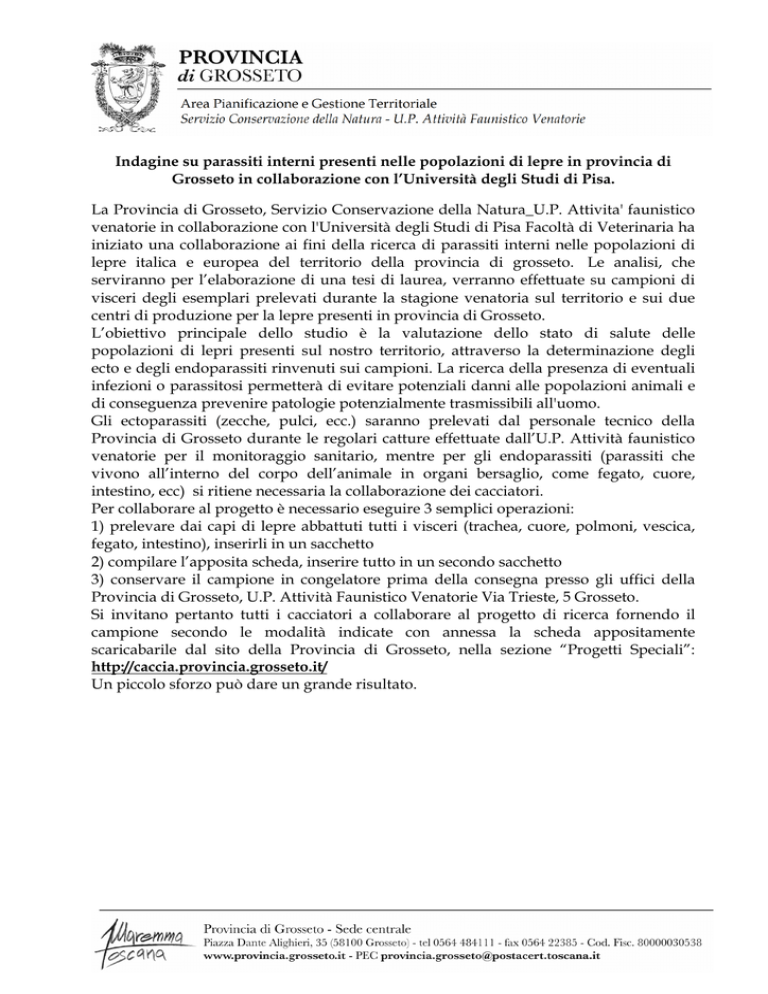 Indagine su parassiti interni presenti nelle popolazioni di lepre in provincia di Grosseto in collaborazione con l’Università degli Studi di Pisa. La Provincia di Grosseto, Servizio Conservazione della Natura_U.P. Attivita' faunistico venatorie in collaborazione con l'Università degli Studi di Pisa Facoltà di Veterinaria ha iniziato una collaborazione ai fini della ricerca di parassiti interni nelle popolazioni di lepre italica e europea del territorio della provincia di grosseto. Le analisi, che serviranno per l’elaborazione di una tesi di laurea, verranno effettuate su campioni di visceri degli esemplari prelevati durante la stagione venatoria sul territorio e sui due centri di produzione per la lepre presenti in provincia di Grosseto. L’obiettivo principale dello studio è la valutazione dello stato di salute delle popolazioni di lepri presenti sul nostro territorio, attraverso la determinazione degli ecto e degli endoparassiti rinvenuti sui campioni. La ricerca della presenza di eventuali infezioni o parassitosi permetterà di evitare potenziali danni alle popolazioni animali e di conseguenza prevenire patologie potenzialmente trasmissibili all'uomo. Gli ectoparassiti (zecche, pulci, ecc.) saranno prelevati dal personale tecnico della Provincia di Grosseto durante le regolari catture effettuate dall’U.P. Attività faunistico venatorie per il monitoraggio sanitario, mentre per gli endoparassiti (parassiti che vivono all’interno del corpo dell’animale in organi bersaglio, come fegato, cuore, intestino, ecc) si ritiene necessaria la collaborazione dei cacciatori. Per collaborare al progetto è necessario eseguire 3 semplici operazioni: 1) prelevare dai capi di lepre abbattuti tutti i visceri (trachea, cuore, polmoni, vescica, fegato, intestino), inserirli in un sacchetto 2) compilare l’apposita scheda, inserire tutto in un secondo sacchetto 3) conservare il campione in congelatore prima della consegna presso gli uffici della Provincia di Grosseto, U.P. Attività Faunistico Venatorie Via Trieste, 5 Grosseto. Si invitano pertanto tutti i cacciatori a collaborare al progetto di ricerca fornendo il campione secondo le modalità indicate con annessa la scheda appositamente scaricabarile dal sito della Provincia di Grosseto, nella sezione “Progetti Speciali”: http://caccia.provincia.grosseto.it/ Un piccolo sforzo può dare un grande risultato.