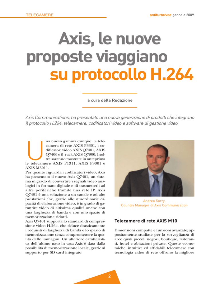 TELECAMERE antifurtotvcc gennaio 2009 Axis, le nuove proposte viaggiano su protocollo H.264 a cura della Redazione Axis Communications, ha presentato una nuova generazione di prodotti che integrano il protocollo H.264: telecamere, codificatori video e software di gestione video U na nuova gamma dunque: la telecamera di rete AXIS P3301, i codificatori video AXIS Q7401, AXIS Q7406 e il rack AXIS Q7900. Inoltre saranno mostrate in anteprima le telecamere AXIS P1311, AXIS P3301 e AXIS M3011. Per quanto riguarda i codificatori video, Axis ha presentato il nuovo Axis Q7401, un sistema in grado di convertire i segnali video analogici in formato digitale e di trasmetterli ad altre periferiche tramite una rete IP. Axis Q7401 è una soluzione a un canale e ad alte prestazioni che, grazie alle straordinarie capacità di elaborazione video, è in grado di garantire video di altissima qualità anche con una larghezza di banda e con uno spazio di memorizzazione ridotti. Axis Q7401 supporta lo standard di compressione video H.264, che riduce drasticamente i requisiti di larghezza di banda e lo spazio di memorizzazione senza compromettere la qualità delle immagini. Un’ulteriore caratteristica dell’ultimo nato in casa Axis è data dalla possibilità di memorizzazione locale, grazie al supporto per SD card integrato. Andrea Sorry, Country Manager di Axis Communication Telecamere di rete AXIS M10 Dimensioni compatte e funzioni avanzate, appositamente studiate per la sorveglianza di aree quali piccoli negozi, boutique, ristoranti, hotel e abitazioni private. Queste economiche, intuitive ed affidabili telecamere con tecnologia video di rete offrono la migliore 2 TELECAMERE antifurtotvcc gennaio 2009 qualità di immagine della loro classe, oltre a una serie di funzioni di monitoraggio professionali. Tutti e tre i modelli, AXIS M1011, AXIS M1011-W e AXIS M1031-W sono in grado di produrre immagini di altissima qualità a velocità di 30 fotogrammi al secondo, in modalità VGA. I modelli AXIS M1011W e AXIS M1031-W possono inoltre essere installati con maggiore flessibilità e facilità in quanto possono essere collegati anche a un'interfaccia wireless IEEE 802.11g tramite l'antenna incorporata. Il modello AXIS M1031-W dispone di un sensore a infrarossi passivo (PIR), in grado di rilevare oggetti in movimento anche in assenza di illuminazione, e di un LED bianco, che provvede a illuminare la scena automaticamente nel caso in cui si verifichi un evento specifico o a richiesta dell'utente. Le altre funzioni integrate nella telecamera comprendono il supporto per audio bidirezionale con microfono e altoparlante incorporati, che consentono agli utenti di ascoltare ciò che accade in un'area nonché di comunicare con altre persone sia direttamente che mediante clip audio caricati o pre-registrati. Axis P3301 Presentata anche Axis P3301, la nuova telecamera a cupola fissa particolarmente indicata per la sorveglianza discreta di ambienti interni esposti, come punti vendita, banche, edifici pubblici, scuole, università e aeroporti. Offre immagini di alta qualità, utilizza la tecnologia di scansione Progressive Scan, ha un ampio range dinamico ed è in grado di generare immagini chiare e nitide sia in normali che in scarse condizioni di illuminazione. Inoltre, è in grado di gestire più flussi video H.264 e Motion JPEG, sia alla massima velocità di trasmissione in fotogrammi che a velocità personalizzate. AXIS P1311 Network Camera è la soluzione perfetta per i sistemi di videosorveglianza con requisiti di memorizzazione e larghezza di banda specifici, quali quelli installati in scuole, punti vendita al dettaglio, banche e altri edifici. AXIS P1311 è in grado di gestire più flussi H.264 e Motion JPEG contemporaneamente, sia alla massima velocità 3 TELECAMERE antifurtotvcc gennaio 2009 di trasmissione che a velocità specifiche, ottimizzate in funzione della qualità e della larghezza di banda. AXIS P1311 offre immagini di qualità straordinaria, tecnologia Progressive Scan, nonché immagini nitide e ricche di dettagli in tutte le condizioni di illuminazione, anche negli ambienti scarsamente illuminati. Axis esporrà inoltre in anteprima assoluta presso il proprio stand in Fiera due nuove telecamere di rete ultracompatte, AXIS M3011 e AXIS M3014, due modelli a cupola fissi, ideali per una videosorveglianza discreta e progettati per il montaggio a incasso semplice e veloce. Queste telecamere sono in grado di gestire contemporaneamente flussi video in formato H.264 e Motion JPEG, sia alla massima velocità di trasmissione in fotogrammi che a velocità personalizzate, adattate a requisiti specifici di qualità e limiti di larghezza di banda. Telecamere di rete a cupola ultracompatte sta gamma di colori adatti a ogni tipologia di ambiente. Grazie al supporto per Power over Ethernet (IEEE 802.3af), le telecamere possono essere alimentate direttamente dalla rete, senza cavi di alimentazione e con costi di installazione notevolmente più bassi. Inoltre, supportano la più ampia gamma di funzionalità per la sicurezza e la gestione delle reti, compresa la crittografia HTTPS senza degrado delle prestazioni, IPv4/IPv6 e Quality of Service. Axis Communications, ha introdotto sul mercato due nuove telecamere di rete ultracompatte, AXIS M3011 e AXIS M3014, costituite da due modelli a cupola fissi, ideali per una videsorveglianza discreta e progettati per il montaggio a incasso semplice e veloce. Queste telecamere sono in grado di gestire contemporaneamente flussi video in formato H.264 e Motion JPEG, sia alla massima velocità di trasmissione in fotogrammi che a velocità personalizzate, adattate a requisiti specifici di qualità e limiti di larghezza di banda. La telecamera AXIS M3011 fornisce una risoluzione video VGA, mentre il modello AXIS M3014 offre una risoluzione pari a 1,3 megapixel. Entrambi i modelli utilizzano la tecnologia Progressive Scan, sono in grado di generare immagini nitide di oggetti in movimento alla 