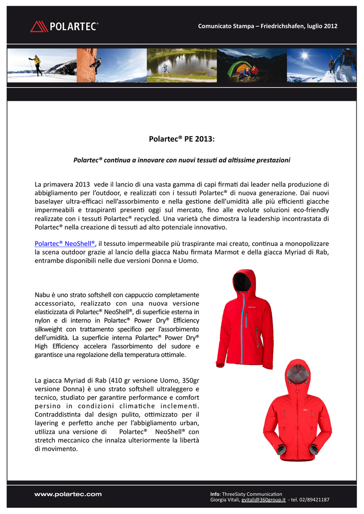 Comunicato Stampa – Friedrichshafen, luglio 2012 Polartec® PE 2013: Polartec® con,nua a innovare con nuovi tessu, ad al,ssime prestazioni La primavera 2013 vede il lancio di una vasta gamma di capi firma3 dai leader nella produzione di abbigliamento per l’outdoor, e realizza3 con i tessu3 Polartec® di nuova generazione. Dai nuovi baselayer ultra-‐efficaci nell’assorbimento e nella ges3one dell’umidità alle più efficien3 giacche impermeabili e traspiran3 presen3 oggi sul mercato, fino alle evolute soluzioni eco-‐friendly realizzate con i tessu3 Polartec® recycled. Una varietà che dimostra la leadership incontrastata di Polartec® nella creazione di tessu3 ad alto potenziale innova3vo. Polartec® NeoShell®, il tessuto impermeabile più traspirante mai creato, con3nua a monopolizzare la scena outdoor grazie al lancio della giacca Nabu firmata Marmot e della giacca Myriad di Rab, entrambe disponibili nelle due versioni Donna e Uomo. Nabu è uno strato softshell con cappuccio completamente accessoriato, realizzato con una nuova versione elasticizzata di Polartec® NeoShell®, di superficie esterna in nylon e di interno in Polartec® Power Dry® Efficiency silkweight con trattamento specifico per l’assorbimento dell’umidità. La superficie interna Polartec® Power Dry® High Efficiency accelera l’assorbimento del sudore e garantisce una regolazione della temperatura ottimale. La giacca Myriad di Rab (410 gr versione Uomo, 350gr versione Donna) è uno strato sobshell ultraleggero e tecnico, studiato per garan3re performance e comfort persino in condizioni clima3che inclemen3. Contraddis3nta dal design pulito, ocmizzato per il layering e perfedo anche per l’abbigliamento urban, u3lizza una versione di Polartec® NeoShell® con stretch meccanico che innalza ulteriormente la libertà di movimento. Info: ThreeSixty Communica3on Giorgia Vitali, [email protected] -‐ tel. 02/89421187 Polartec® Power Dry® High Efficiency -‐ versione del popolare tessuto Polartec® Power Dry®, progedato per mantenere la pelle asciuda quando si suda – si differenzia per la superficie interna con lavorazione traforata, studiata per massimizzare il calore, minimizzare il peso e innalzare la traspirabilità. I tessu3 Polartec® Power Dry® High Efficiency pesano meno, occupano meno spazio ed offrono maggiore isolamento e traspirabilità della maggior parte degli altri tessu3 della stessa categoria. Marmot ha scelto Polartec® Power Dry® High Efficiency per i suoi capi Thermo Hoodies e 1/2 Zips (disponibili nelle due version Donna e Uomo), che saranno disponibili in Europa a par3re dalla primavera 2013. Thermo Hoodies e 1/2 Zips sono progeda3 per offrire ges3one superiore dell’umidità, traspirabilità e calore senza peso, offrendo nel contempo un fit atle3co ocmizzato per le acvità aerobiche. Millet introduce le camicie Alpine Zip TS (manica lunga e a manica corta) e Alpi short-‐sleeve (parte della collezione "Low Impact"), realizzate con Polartec® Power Dry® recycled. Riciclato all’82%, questo eccezionale tessuto eco-‐friendly assicura la stessa este3ca, la stessa mano e le stesse performance della versione in poliestere vergine. Outdoor Research, Millet and The North Face® introdurranno invece una famiglia di shirts tecniche realizzate con tessu3 Polartec® Power Dry® di peso leggero, per offrire ges3one superiore dell’umidità corporea e traspirabilità, assicurando un comfort ocmale a contado con la pelle. I capi Torque LS and SS Tees (versione Uomo e Donna), firma3 da Outdoor Research, offrono la migliore tecnologia per la ges3one dell’umidità al momento disponibile, per un u3lizzo durante tude le acvità aerobiche in condizioni di caldo. Outdoor Research ha u3lizzato una versione elas3cizzata di Polartec® Power Dry® dotata di una costruzione brevedata differenziata sulle due superfici, che unisce i vantaggi del poliestere (lato esterno) e quelli del polipropilene (interno), velocizzando trasferimento dell’umidità e tempi di asciugatura. Info: ThreeSixty Communica3on Giorgia Vitali, [email protected] -‐ tel. 02/89421187 S/S Nihon 1/4-‐Zip di The North Face è invece un capo fleece eccezionalmente performante e morbido, realizzato con tessuto Polartec® Power Dry® e provvisto di una pra3ca zip ¼ per la migliore ven3lazione. Tuc i tessu3 Polartec® Power Dry® u3lizza3 da Outdoor Research, Millet e The North Face® sono dota3 di tradamento Polygiene per inibire la proliferazione dei baderi che causano i cacvi odori. “Abbiamo visto marchi partner u3lizzare sempre di più le versioni più leggere di Polartec® NeoShell®, in parte perché in condizioni clima3che più mi3 i benefici della permeabilità all’aria sono ancora più pronuncia3” ha affermato Allon Cohne, Diredore Marken3ng Globale per Polartec. “La domanda di stra3 shell in condizioni di caldo e di umido può essere addiridura più ampia quando sussiste una differenza minima tra il clima esterno e quello all’interno alla giacca, e diventa ancora più difficile allontanare l’umdità sodoforma di vapore. E ‘ proprio In ques3 casi che vengono riconosciu3 i benefici della permeabilità all’aria. A proposito di Polartec: Polartec, LLC proge'a, produce e commercializza i tessu3 ad alta prestazione Polartec®. La gamma di prodo9 Polartec® è u3lizzata dai migliori brand di abbigliamento del mondo e spazia dagli stra3 base di peso leggero ai layer per l’isolamento, fino ai tessu3 per la protezione da climi estremi. I tessu3 Polartec® sono u3lizza3 da tu9 i Corpi dell’esercito statunitense (Army, Navy, Marine Corps, Air Force e Special Opera3ons Forces). Visitate www.polartec.com Info: ThreeSixty Communica3on Giorgia Vitali, [email protected] -‐ tel. 02/89421187