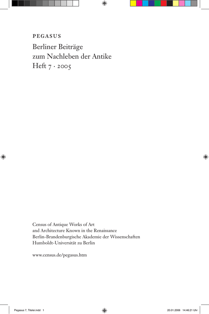 pegasus Berliner Beiträge zum Nachleben der Antike Heft 7 · 2005 Census of Antique Works of Art and Architecture Known in the Renaissance Berlin-Brandenburgische Akademie der Wissenschaften Humboldt-Universität zu Berlin www.census.de /pegasus.htm Pegasus 7, Titelei.indd 1 20.01.2006 14:46:21 Uhr Census of Antique Works of Art and Architecture Known in the Renaissance Berlin-Brandenburgische Akademie der Wissenschaften Humboldt-Universität zu Berlin Herausgeber: Horst Bredekamp, Arnold Nesselrath Redaktion: Mitarbeit: Charlotte Schreiter Hedda Finke, Barbara Lück Kunstgeschichtliches Seminar Unter den Linden 6 10099 Berlin © 2005 Census of Antique Works of Art and Architecture Known in the Renaissance Layout und Satz: Punkt.Satz, Zimmer & Partner, Berlin Druck: Druckhaus Köthen ISSN 1436-3461 Pegasus 7, Titelei.indd 2 20.01.2006 14:46:21 Uhr inhalt Vorwort Horst Bredekamp / Arnold Nesselrath 5 Le Rameau d’Or et de Science. »F. Ollandivs Apolini dicavit« Sylvie Deswarte-Rosa 9 Responding to the Antique. A Rediscovered Roman Circus Sarcophagus and its Renaissance Afterlife Sinclair Bell 49 Vincenzio Borghini disegnatore dall’Antico Eliana Carrara 81 L’Album Montalto e la collezione di sculture antiche di Villa Peretti Montalto Federico Rausa 97 Pyramiden im frühen Landschaftsgarten Annette Dogerloh / Michael Niedermeier 133 Antike Sarkophag-Bilder für Goethes »verteufelt humane« Iphigenie. Rom 1786: Eine Miszelle zu Heeren, Goethe und Lips Ruth Bielfeldt 163 Ein griechisches Grabepigramm auf dem Neuen Marienfriedhof, Berlin-Prenzlauer Berg Veit Vaelske 187 L’Association des Historiens de l’Art Italien (AHAI) 197 inhalt Inhalt.indd 3 20.01.2006 15:02:17 Uhr Inhalt.indd 4 20.01.2006 15:02:18 Uhr vorwort Objekte grundsätzlicher Kritik besitzen in der Regel ein stärkeres Eigenleben als wohlgefällige Mittel scheinbar voraussetzungsloser Anwendung. Es kann daher als Zeichen einer intensivierten Auseinandersetzung mit der Antike gelten, daß die kunsthistorische Methode der Antikenrezeption kürzlich durch Alexander Nagel und Christopher Wood grundlegend in Frage gestellt wurde.1 Ihre Kritik an der Rezeption der Antike zielt auf die verschiedenen Rezeptionsformen einer fest definierten, gleichsam in ihrer Materialität gesicherten Antike, wie sie Erwin Panofskys »Renaissance and Renaissances« von 1956 vor Augen stand. In der Tat, hierin ist Nagel und Wood zuzustimmen, müßte in jeder Epoche zunächst gefragt werden, was als »antik« bewertet wurde; im fünfzehnten Jahrhundert wären das Baptisterium wie auch San Minato von Florenz als Exempla der Antike aufgenommen worden, weil sie angesichts der Unklarheit ihres Ursprungszusammenhanges als antike Bauwerke angesehen wurden. So berechtigt diese methodische Verfeinerung ist, so kann ihr entgegengehalten werden, daß die Fixierung auf Panofskys Konzept einer gleichsam bereinigten Antikenrezeption deshalb nicht zu einer grundlegenden Absage taugt, weil es Deutungsalternativen gab, in denen die Frage der materiellen Bestimmbarkeit der Antike eine untergeordnete Rolle spielte. Hierzu gehörte etwa Richard Hamanns im Jahre 1949/50 formulierte Theorie, daß die Antike immer dann zu einem Medium der Orientierung wurde, wenn es um den aus Krisen entstandenen Zwang zu einer Neubestimmung ging.2 Eine solche Orientierung verlagert die instinktive Verbindung der Antike mit Ansehen und Macht in die Sphäre der Suche nach Auswegen aus existentiellen Problemen. Formuliert nach dem Ende des Zweiten Weltkrieges, hatte diese Theorie einer dynamischen Antikenrezeption ein Gegenüber in der Bestimmung Edgar Winds, der im Jahre 1934 von London aus die Beschäftigung mit der Antike als eine kulturelle Instanz definierte, die vom Ansatz her nicht auf Rassen, sondern auf transethnische Gemeinschaften abzielte.3 Es scheint, als sei die gegenwärtig sich abzeichnende Wiederkehr der Attraktion der Antike von diesen beiden Motiven bestärkt. Ein Indiz könnten Filme wie »Gladiator (2000)« oder »Troja (2003)« bilden, die ungeachtet der Problematik populärer Aktualisierungen von der ungebrochenen Faszination der Antike sprechen. Auch das spürbar gewachsene Interesse für die alten vorwort Vorwort.indd 5 20.01.2006 14:46:40 Uhr Sprachen im Schulunterricht markiert eine Trendwende. Vor allem aber sticht die Forcierung der auf die Antike bezogenen Forschung hervor. Eine Fülle von Forschungsprojekten widmet sich der Wiedergewinnung der Antike und ihrer nachantiken Anverwandlungen; in Marburg etwa der BA-Studiengang »Die Antike in Europa«, das Antikezentrum an der Humboldt-Universität und das »Zentrum Alte Welt« an der Freien Universität Berlin. Das größte Unternehmen wird durch den Sonderforschungsbereich 644 »Transformationen der Antike« der Humboldt-Universität gebildet, der, auch unterstützt durch Mitglieder der Freien Universität, die Antike nicht als normative Instanz begreift, sondern als eine Größe, die sich im Prozeß der Aktualisierung immer auch selbst verwandelt hat. Hamanns aus Krisen geborener, dynamischer Begriff der Zuwendung zur Antike kommt hier ebenso zum Tragen wie Winds Votum für eine internationale und transethnische Reflexion der antiken Kultur. Es sind diese beiden Motive, die in der forcierten Globalisierung der Gegenwart die Antike als Muster einer Kultur begreift, die aus der Krise neue Horizonte gewinnt. Diese Bestimmung zu überprüfen und möglicherweise auch weiterzuentwickeln, bleibt ein einzulösendes Programm. Ohne daß ein solcher Anspruch bereits sichtbar würde, ist doch die Vielfalt der Beiträge des vorliegenden Bandes ein Indiz für eine bewegliche Beschäftigung mit der Antike. Neben der Einzeluntersuchung eines antiken Sarkophags und seiner Aufbewahrungs- und Rezeptionsgeschichte (Bell) steht die Rekonstruktion eines römischen Sammlungszusammenhanges (Rausa) und die Wahrnehmung antiker Kunst durch einen einzelnen Künstler (Carrara), die Relation von Text und Bild (DeswarteRosa), Goethes 