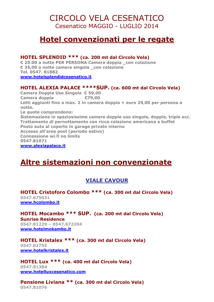 CIRCOLO VELA CESENATICO Cesenatico MAGGIO - LUGLIO 2014 Hotel convenzionati per le regate HOTEL SPLENDID *** (ca. 200 mt dal Circolo Vela) € 25.00 a notte PER PERSONA Camera doppia _con colazione € 35,00 a notte camera singola _con colazione Tel. 0547. 81882 www.hotelsplendidcesenatico.it HOTEL ALEXIA PALACE ****SUP. (ca. 600 mt dal Circolo Vela) Camera Doppia Uso Singola € 59,00 Camera doppia €79,00 Letti aggiunti fino a max. 2 in camera doppia + euro 29,00 per persona a notte. Le quote comprendono: Sistemazione in spaziosissime camere doppie uso singole, doppie, triple ecc. Trattamento di pernottamento con ricca colazione americana a buffet Posto auto al coperto in garage privato interno Accesso all'area pool (periodo estivo) Connessione wi.fi no limits 0547.81071 www.alexiapalace.it Altre sistemazioni non convenzionate VIALE CAVOUR HOTEL Cristoforo Colombo *** (ca. 300 mt dal Circolo Vela) 0547.679031 www.hcolombo.it HOTEL Mocambo *** SUP. (ca. 200 mt dal Circolo Vela) Sunrise Residence 0547.81229 – 0547.672204 www.hotelmokambo.it HOTEL Kristalex *** (ca. 300 mt dal Circolo Vela) 0547.82755 www.hotelkristalex.it HOTEL Lux *** (ca. 400 mt dal Circolo Vela) 0547.81384 www.hotelluxcesenatico.com Pensione Liviana ** (ca. 300 mt dal Circolo Vela) 0547.81076 CAMPING MOTEL ** (ca. 600 mt dal Circolo Vela) Tel. 0547. 678020 www.campingmotel.it VIA N. DA RECCO HOTEL Ragno *** (ca. 300 mt dal Circolo Vela) 0547.81339 www.hotelragno.it HOTEL Diamante ***SUP (ca. 350 mt dal Circolo Vela) 0547.700092 www.hoteldiamantecesenatico.com HOTEL Maree ***SUP (ca. 350 mt dal Circolo Vela) 0547.673357 www.mareehotel.com HOTEL Lucerna ** (ca. 400 mt dal Circolo Vela) 0547.82575 www.hotel-lucerna.net VIA A. DA NOLI HOTEL Croce del Sud *** (ca. 400 mt dal Circolo Vela) 0547.82402 www.hotelcrocedelsud.it HOTEL Abel *** (ca. 450 mt dal Circolo Vela) 0547.82505 www.hotelabel.com HOTEL Kursaal *** (ca. 500 mt dal Circolo Vela) 0547.81356 – 333.7980469 www.biondivacanze.com HOTEL Ambasciata *** (ca. 500 mt dal Circolo Vela) 0547.82824 www.hotelambasciata.com HOTEL Orly *** (ca. 500 mt dal Circolo Vela) 0547.82398 www.hotelorly.it HOTEL Lalla ***SUP. (ca. 550 mt dal Circolo Vela) 0547.82450 www.hotellalla.com HOTEL Solemare *** (ca. 600 mt dal Circolo Vela) 0547.82003 www.solemarecesenatico.com HOTEL Ponente ** (ca. 650 mt dal Circolo Vela) 0547.82190 www.hotelponente.it ALTRE VIE CAMPING CESENATICO*** (ca. 2 km dal Circolo Vela) 0547.81344 www.campingcesenatico.com/ HOTEL Darsena *** (ca. 800 mt dal Circolo Vela) 0547.82403 www.hoteldarsena.com HOTEL Devon *** (ca. 700 mt dal Circolo Vela) 0547.83101 www.hoteldevon.it HOTEL Concorde *** (ca. 700 mt dal Circolo Vela) 0547.83130 www.hotelconcorde.info HOTEL Gioiello *** (ca. 800 mt dal Circolo Vela) 0547.82514 www.hotelgioiello.com Onda Marina Residence *** (ca. 800 mt dal Circolo Vela) 0547.82924 www.hotelluxcesenatico.com HOTEL Ori - Universale*** (ca. 800 mt dal Circolo Vela) 0547.81880 - 82660 www.universalepromenade.it