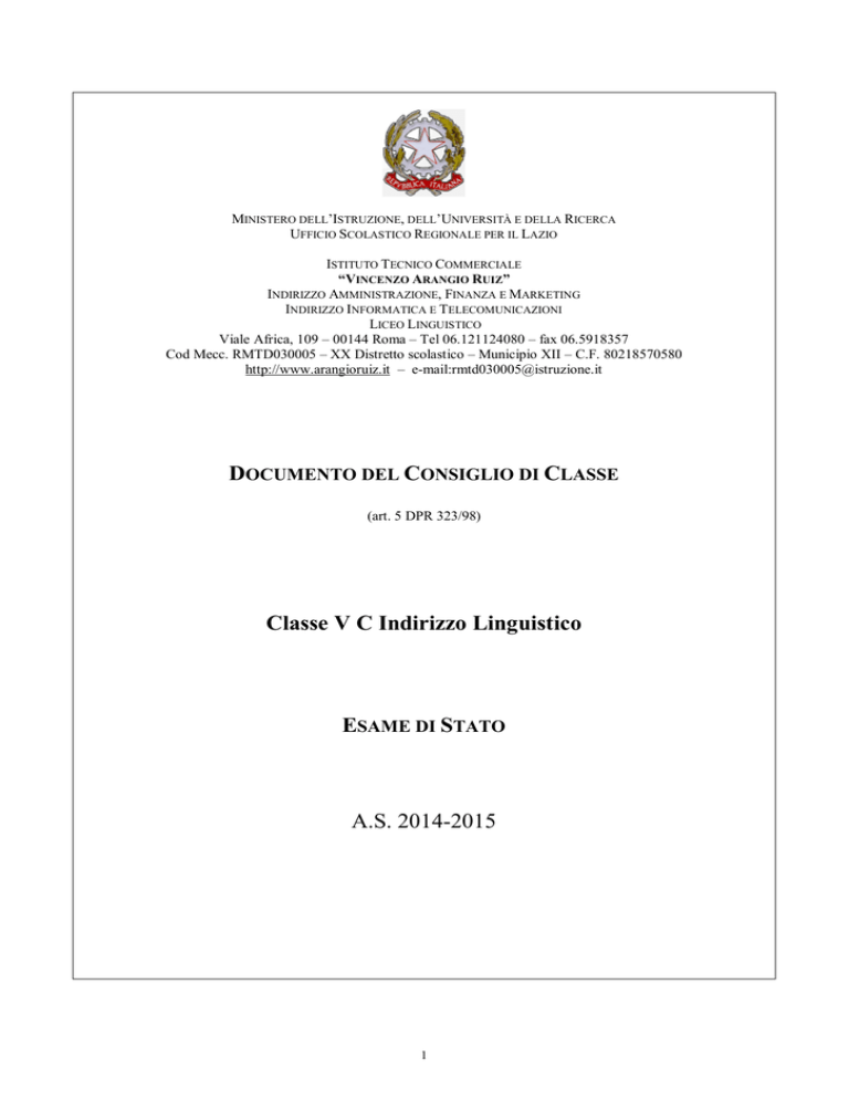 MINISTERO DELL’ISTRUZIONE, DELL’UNIVERSITÀ E DELLA RICERCA UFFICIO SCOLASTICO REGIONALE PER IL LAZIO ISTITUTO TECNICO COMMERCIALE “VINCENZO ARANGIO RUIZ” INDIRIZZO AMMINISTRAZIONE, FINANZA E MARKETING INDIRIZZO INFORMATICA E TELECOMUNICAZIONI LICEO LINGUISTICO Viale Africa, 109 – 00144 Roma – Tel 06.121124080 – fax 06.5918357 Cod Mecc. RMTD030005 – XX Distretto scolastico – Municipio XII – C.F. 80218570580 http://www.arangioruiz.it – e-mail:[email protected] DOCUMENTO DEL CONSIGLIO DI CLASSE (art. 5 DPR 323/98) Classe V C Indirizzo Linguistico ESAME DI STATO A.S. 2014-2015 1 INDICE Elenco dei docenti del Consiglio di Classe 3 SEZIONE PRIMA. LA SCUOLA 1. Descrizione sintetica della scuola 2. Profilo del diploma di licenza linguistica 4 5 SEZIONE SECONDA. LA CLASSE 1. Profilo della classe 2. Esercitazioni per le prove d’esame 3. Descrittori dell’apprendimento e criteri di valutazione 4. Verifiche e valutazioni 5. Simulazioni della terza prova 6 8 9 10 16 SEZIONE TERZA. RELAZIONI FINALI E PROGRAMMI 1. Religione 2. Italiano 3. Storia e Filosofia 4. Inglese 5. Conversazione in inglese 6. Francese 7. Conversazione in francese 8. Spagnolo 9. Conversazione in spagnolo 10. Storia dell’arte 11. Matematica 12. Fisica 13. Scienze naturali 14. Scienze motorie e sportive 21 23 28 36 38 39 43 44 48 49 50 51 54 56 2 ELENCO DEI DOCENTI DEL CONSIGLIO DI CLASSE MATERIA NOME E COGNOME Religione Tomás Scusceria Muffatti Italiano Laura Ottaviantonio Storia e Filosofia Barbara Valentini Inglese Roberta Lamonica Conversazione in inglese Patrizia Cannatelli Francese Anna Lisa Deidda Conversazione in francese Sacha Marsili Spagnolo Giuseppa Marrocco Conversazione in spagnolo Georgina Manau Gomez Storia dell’Arte Michelina Pertosa Matematica Ginevra Solieri Fisica Alessandra Ceraglia Scienze naturali Stefania Adorisio Scienze motorie e sportive Rosangela Di Salvo 3 FIRMA SEZIONE PRIMA. LA SCUOLA 1. DESCRIZIONE SINTETICA DELLA SCUOLA Le classi dell’istituto sono suddivise in tre indirizzi (Amministrazione, Finanza e Marketing- Liceo Linguistico-Informatica e Telecomunicazione). L’indirizzo Linguistico dà accesso al Diploma di Licenza Linguistica. Tali ordinamenti sono attuati nelle classi quinte dall’a.s. 2014-2015. Le classi quinte per l’a.s. 2014-2015 sono le seguenti: INDIRIZZO Amministrazione Finanza e Marketing Liceo Linguistico Informatica e Telecomunicazione CLASSI 2 DIPLOMA Perito Commerciale, Finanza e Marketing 5 4 Licenza Linguistica Informatico e Telecomunicazione La scuola è dotata delle seguenti attrezzature: - Aula Magna - Biblioteca/videoteca/audioteca - Laboratorio di Informatica 2 - Laboratorio di Elettronica - Laboratorio di trattamento testi e dati - Laboratorio Multidisciplinare - Laboratorio di Contabilità - Laboratorio di Sistemi - Laboratorio di Chimica - Laboratorio di Fisica - Laboratorio di Scienze - Laboratorio di Lingue - Palestre 2 - Campo di calcetto - Campetto Pallamano all’aperto Ogni laboratorio è provvisto di dotazione informatica con collegamento alla rete di Istituto e a Inter net. Sono da anni attivi i servizi di Accoglienza, Orientamento, Progetto Giovani, ECDL, Certificazioni Europee in tutte e quattro le lingue insegnate nel nostro istituto. Nell’ambito di un’offerta formativa più ricca, vengono proposti agli alunni attività teatrali, itinerari didattici strutturati in tema di educazione ambientale, visite culturali. Nel Liceo Linguistico del nuovo Ordinamento vengono attuati sin dal Terzo anno Percorsi CLIL. L’Istituto è Presidio “Poseidon” per la formazione in servizio degli Insegnanti di Italiano, Lingue Classiche e Moderne Il Gruppo Sportivo d’Istituto permette a numerosi alunni di dedicarsi all’attività agonistica nella disciplina preferita, con partecipazione a Campionati studenteschi, a campionati interni di calcetto e pallavolo, (maschile e femminile) e ad altre gare. La programmazione educativa è prerogativa del Collegio dei docenti, articolato in Commissioni, Dipartimenti, e dei singoli Consigli di classe per la parte di loro competenza. La didattica è stata organizzata sulla base del classico schema delle lezioni settimanali delle varie discipline, organizzato dall’orario settimanale delle lezioni, articolato su cinque giorni in orario antimeridiano. In tale fascia oraria sono state inserite alcune attività extra curricolari (visite guidate di un giorno, partecipazione a spettacoli cinematografici o teatrali, manifestazioni sportive). Altre iniziative extracurricolari sono state svolte in orario pomeridiano, dopo l’approvazione didattica del Collegio dei Docenti, coerentemente con le linee di indirizzo del POF. Infine l’attività didattica, in occasione di viaggi di istruzione, si è trasferita nella meta della visita. L’Istituto aderisce a: “Scuoleinsieme” rete interscolastica del XII Municipio Nell’Istituto è presente tutti i giorni un Presidio medico. 4 2. PROFILO DEL DIPLOMA DI LICENZA LINGUISTICA Le seguenti qualità sono da attribuirsi ad un diplomato che ha abbia frequentato un corso di studi regolare. CAPACITÀ 1 - Possiede capacità di apprendimento. 2 - Possiede capacità logico-interpretative. 3 - Possiede capacità linguistico-espressive. 4 - Possiede capacità di rielaborazione. 5 - Possiede la capacità di valutare eventi storico-socio-letterari da un punto di vista non solo nazionale. 6 - Sa comunicare e relazionarsi con gli altri documentando le proprie argomentazioni. 7 - Sa lavorare in gruppo. CONOSCENZE 1 - Possiede una cultura storico-umanistica che lo mette in grado di valutare criticamente le problematiche socio-culturali in divenire. 2 - Conosce lo sviluppo diacronico dei fenomeni storico-letterari italiani e dei paesi delle tre lingue straniere studiate, con particolare riguardo ai secoli XIX e XX. 3 - Possiede le conoscenze linguistiche di livello intermedio-avanzato che gli consentono di affrontare testi e conversazioni in lingua straniera su argomenti di at