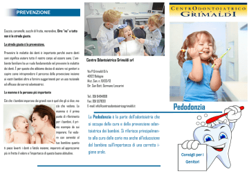 PREVENZIONE Ciuccio, caramelle, succhi di frutta, merendine. Dire "no" a tutto non è la strada giusta. La strada giusta è la prevenzione. Prevenire le malattie dei denti è importante perché avere denti sani significa aiutare tutto il nostro corpo ad essere sano. L'ambiente familiare ha un ruolo fondamentale nel prevenire le malattie dei denti. È per questo che abbiamo deciso di aiutare voi genitori a capire come intraprendere il percorso della prevenzione insieme ai vostri bambini oltre a fornire suggerimenti per un uso razionale ed efficace dei servizi odontoiatrici. La mamma è la persona più importante Ciò che i bambini imparano dai grandi non è quel che gli si dice, ma ciò che vedono. La mamma è il primo punto di riferimento per i bambini, il primo esempio da cui imparare. Fai vedere con serenità al tuo bambino quanto ti piace lavarti i denti e fatelo insieme, imparerà ad apprezzarne più in fretta il valore e l'importanza di questa buona abitudine. Centro Odontoiatrico Grimaldi srl Via P.Grimaldi 6/e 40122 Bologna IAut. San. n. 15103/13 Dir. San Dott. Germano Lenzarini Tel.: 051 6494868 Fax: 051 557030 E-mail: [email protected] La Pedodonzia è la parte dell’odontoiatria che si occupa della cura e della prevenzione odontoiatrica dei bambini. Si riferisce principalmente alla cura delle carie ma anche all’educazione del bambino sull’importanza di una corretta igiene orale. Pedodonzia Consigli per i Genitori DENTI DECIDUI I denti decidui, detti anche “denti da latte”, si compongono di 20 denti, disposti in numero di 5 per ogni semiarcata. L'eruzione dei denti decidui avviene dai 4 mesi e mezzo fino ai due anni ed ogni dente fuoriesce in tempi diversi, che possono essere influenzati da fattori individuali. DENTI PERMANENTI La seconda dentizione si compone di 32 denti. I denti permanenti erompono da un periodo che va dai 6 anni fino ad arrivare a 18 o anche 30 anni e anche qui i momenti dell’eruzione dei diversi denti sono indicativi. Il primo molare permanente viene facilmente interpretato e trascurato come dente da latte. All'età di sei anni un bambino ha già formati, all'interno delle ossa mascellari, quasi tutti i denti definitivi, con l'esclusione degli ultimi molari. DA 0 A 3 ANNI Lavare i denti anche quando non ci sono ancora Avvolgi il dito in una garza sterile, inumidiscila e passala sulle gengive, la lingua e le guance del bambino. Racconta e spiega al tuo bambino cosa stai facendo: anche se non ti capisce, la tua voce lo rassicurerà e lo indirizzerà verso una buona abitudine, oltre a stimolare in lui il processo di comprensione quando sarà più grande verso l'importanza di lavarsi i denti con regolarità. Questo lo aiuterà ad accumulare meno batteri e sarà un’ottima pratica fino al terzo anno di età, quando sarà in grado di spazzolare da solo i suoi dentini. Intorno ai 3anni, infatti, il tuo bambino vorrà lavarsi i denti da solo. Permettigli di tenere in mano lo spazzolino, di morderlo e di masticarlo ed aiutalo a spazzolare i suoi denti in modo corretto. DA 4 A 6 ANNI Anche se i denti da latte durano pochi anni, sono importanti per molte ragioni. La più importante è che faranno da guida per i denti permanenti che seguiranno. I bambino in autonomia deve spazzolarsi i denti almeno due volte al giorno. OLTRE I 6 ANNI Ecco spuntare i primi denti permanenti del tuo bambino. A partire dai 6 anni di età vengono infatti sostituiti gli incisivi centrali decidui con quelli permanenti ed erompono i primi molari permanenti, che non sostituiscono alcun dente da latte. Questa fase viene definita "dentizione mista", in quanto è caratterizzata dalla presenza contemporanea di denti decidui e permanenti. Da questo momento in poi i denti saranno per tutta la vita. BAMBINO - DENTISTA È importante che il tuo bambino non si senta a disagio all'interno dello studio e con il dentista stesso, e che possa vivere l'appuntamento dal dentista come un'esperienza giocosa, divertente e gratificante. Il dentista non è un nemico, è un alleato! Qualche consiglio pratico per arrivare senza ansia dal dentista: 1. La paura è contagiosa. Probabilmente sarai tu per prima ad aver paura, magari per qualche intervento doloroso che hai già sopportato. Non mostrare la tua ansia al tuo bambino. 2. Un luogo familiare. Portare i bambini dal dentista ogni 6 mesi è utile non solo a mantenere una corretta igiene orale. Se attendi di andare dal dentista solo quando c'è un problema, il tuo bambino assocerà il dentista ad azioni dolorose. Inoltre, controlli regolari permettono di individuare ed affrontare eventuali problemi prima che questi diventino fastidiosi ed esigano trattamenti più dolorosi. 3. Stanco = Nervoso. Sappiamo bene quanto tutto diventi più complicato quando i bambini sono stanchi. Per questo motivo è preferibile prenotare la visita al mattino. 4. Paura? Parliamone. Dialoga con il tuo bambino ed esplora le sue paure. Cerca di capire da dove derivano ed aiutalo a raccontartele e superarle, magari con un gioco o una battuta divertente sul dentista! Supererà le sue paure quando imparerà a scherzarci sopra.