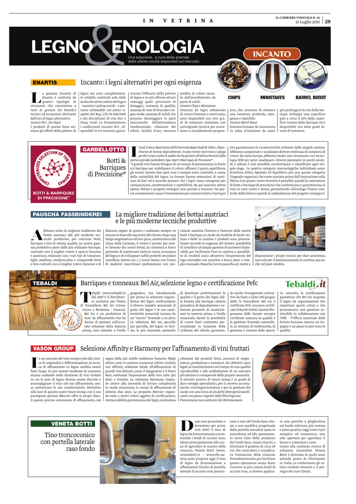 I N & LEGNO ENARTIS L a gamma Incanto di Enartis è costituta da quattro tipologie di strumenti che consentono a tutti di giovare dei benefici tecnici ed economici derivanti dall’uso di legni alternativi. Incanto N.C. (no chips) I prodotti di questa linea mimano gli effetti della polvere di 29 Una selezione, a cura delle aziende, delle ultime novità disponibili sul mercato Incanto: i legni alternativi per ogni esigenza legno ma sono completamente solubili, costituiti solo dalle molecole attive cedute del legno - tannini e polisaccaridi - e pertanto utilizzabili nel pieno rispetto del Reg. (CE) N. 606/2009 e dei disciplinari di vini Doc e Docg. Usati in fermentazione, i coadiuvanti Incanto N.C., disponibili in tre versioni, garan- tiscono l’efficacia della polvere di legno e in più offrono alcuni vantaggi quali: precisione di dosaggio; costanza di qualità; assenza di note di bruciato o legno verde; assenza di solidi che possono danneggiare le parti meccaniche dell’attrezzatura vendemmiale; riduzione dei rifiuti; facilità d’uso; nessuna perdita di colore causata dall’assorbimento da parte di solidi. Incanto Chips e Ministaves Ottenuti da legni selezionati di rovere francese e americano, sono disponibili con otto gradi di tostatura realizzata con un’originale tecnica per convezione a riscaldamento progres- I Botti & Barriques di Precisione® PAUSCHA FASSBINDEREI A bbiamo unito la migliore tradizione dei bottai austriaci alle più moderne tecniche produttive, per costruire botti, barrique e tini di ottima qualità. La nostra gamma produttiva parte dalle più utilizzate barrique, costruite con il miglior rovere a spacco francese e austriaco, realizzate con i vari tipi di tostatura: light, medium, medium-plus e comprende botti e tini costruiti con il miglior rovere francese e di l prof.Franco Battistutta dell’Università degli Studi di Udine, Dipartimento di Scienze degli alimenti, in una recente intervista ci spiega perché è stato svolto lo studio che ha portato all’ultimo brevetto della storica azienda Garbellotto Spa, Botti &Barriques di Precisione®. “I grandi vini hanno bisogno di un tempo di permanenza in botte e/o barrique per stabilizzare il colore, affinare il gusto, equilibrare gli aromi. Questa fase però non è sempre sotto controllo, a causa della variabilità del legno. Le foreste hanno estensioni di centinaia di km2 ed è assurdo pensare che i legni siano omogenei per composizione, caratteristiche e ripetibilità. Da qui nascono attese spesso deluse e progetti enologici non portati a termine. Da queste constatazioni nasce l’innovazione per costruire botti e barrique sivo, che consente di ottenere una tostatura profonda, omogenea e ripetibile. Incanto Barrel Boost Sistema formato da ministaves in calza d’infusione da usare per prolungare la vita della barrique. Sviluppa una superficie pari a circa il 25% della superficie tostata della barrique ed è disponibile con sette gradi diversi di tostatura. che garantiscano le caratteristiche richieste dalle singole cantine. Abbiamo campionato e analizzato diverse centinaia di campioni di rovere da tutta Europa, abbiamo tarato uno strumento con tecnologia NIR per poter analizzare i diversi parametri in pochi secondi, e adesso è così possibile caratterizzare e classificare ogni singola doga. Le quattro categorie merceologiche individuate sono: Struttura, Dolce, Speziato ed Equilibrio, più una quinta categoria (Vegetale-segatura) che viene scartata prima dell’immissione sulla filiera. Con questo nuovo brevetto è possibile quindi la costruzione di botti e barrique di precisione che conferiscano e garantiscono al vino le note scelte e attese, permettendo all’enologo l’intero controllo della filiera e quindi la soddisfazione del progetto enologico”. La migliore tradizione dei bottai austriaci e le più moderne tecniche produttive Slavonia segato di quarto e realizzate sempre su misura in base alle necessità del cliente. Dopo una lunga stagionatura all’aria pura, caratteristica del clima della Carinzia, il rovere è pronto per essere lavorato dai nostri bottai, la curvatura a fuoco permette di mantenere tutta la carica aromatica del legno e di sviluppare nobili prodotti secondari (vanillina, lattoni ecc.). I nostri bottai con l’aiuto di moderni macchinari perfezionano con pre- cisione assoluta l’interno e l’esterno delle nostre botti e barrique, in modo da renderle di facile utilizzo e belle in cantina. I prodotti sono personalizzati secondo le esigenze del cliente: possibilità di installare un’ampia gamma di accessori disponibili, per facilitarne l’uso in cantina, e possibilità di renderli unici attraverso l’impressione del logo aziendale con marchio a fuoco, laser o intaglio manuale. Pauscha (www.pauscha.at) mette a disposizione i propri tecnici per dare assistenza, non solo per il posizionamento in cantina, ma anche nel post-vendita. Barriques e tonneaux Bel Air, selezione legno e certificazione Pefc T ebaldi (www.tebaldi.it) dal 2007 è il distributore esclusivo per l’Italia di Tonnellerie Bel Air (Cenac vicino a Bordeaux – Francia). Bel Air è un produttore di fusti da affinamento che ha deciso di puntare sull’accurata selezione della materia prima, non soltanto a livello VASON GROUP 13 Luglio 2015 ENOLOGIA GARBELLOTTO TEBALDI IL CORRIERE VINICOLO N. 22 V E T R I N A geografico, ma introducendo per primo la selezione organolettica dei legni, verificandone il diverso impatto sensoriale. Il gusto del legno e le sue caratteristiche sensoriali variano da un “terroir” forestale a un altro. La selezione Bel Air, parcella per parcella, del legno in foreste, le più rinomate, permette di dominare perfettamente la qualità e il gusto dei legni, dalla foresta alla barrique. Questa procedura di degustazione e selezione permette di caratterizzare la materia prima a livello sensoriale, dando la possibilità di creare fusti realmente personalizzati in funzione della richiesta del cliente