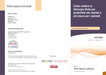 Come rendere la Chirurgia Orale più predicibile nei risultati e più sicura per i pazienti Informazioni Generali SEDE DEL CORSO WEEMED S.r.l. Via Parini n° 13 40069 Zola Predosa BOLOGNA Tel. 051/758904 Corso Teorico-Pratico SEGRETERIA ORGANIZZATIVA Segreteria Organizzativa MV Congressi Spa Via Marchesi 26/d 43126 Parma Tel. +39 0521 290191 Fax +39 0521 291314 BOLOGNA Venerdì, 17 Aprile 2015 QUOTA DI PARTECIPAZIONE euro 100,00 + iva Il partecipante riceverà in omaggio, a fronte della quota di iscrizione: - n° 1 kit da 12 fili di Ethibond Excel - cod. 18563G del valore di € 90,86 E’ obbligatoria la preiscrizione almeno 15 giorni prima del giorno dell’evento Numero massimo di partecipanti: 25 Main Sponsor Relatore: E’ indispensabile che i partecipanti portino: Prof. Mauro Labanca « manico bisturi con lama ; porta-aghi, pinza per tessuti e forbici evento non accreditato Relatore Prof. Mauro Labanca M.D. D.D.S. CURRICULUM VITAE Laureato in Medicina e Chirurgia presso l’Universita’ degli Studi di Milano, ottiene poi presso la stessa Università le specializzazioni in Chirurgia dell’Apparato Digerente ed in Odontostomatologia. È International Speaker e Key Opinion Leader per le più importanti aziende nel settore Odontoiatrico. E’ Deputy Regent per l’Italia dell’ ICD (International College of Dentists) ed Ambasciatore del Global Visionary Found (GVF), la parte filantropica dell’International Council dell’ICD. È coautore del testoatlante “Anatomia Chirurgica per l’Odontoiatria”, attualmente alla sua seconda edizione, del libro “Clinical Neurochemical and Experimental Aspects of Orofacial Pain in Dentistry”, del DVD “L’anatomia Chirurgica nella pratica Odontoiatrica”. E’ autore del DVD “ Le suture in Odontoiatria: quali materiali e quali tecniche di annodamento” anch’esso alla sua seconda edizione. Dal 2001 al 2005 è stato il fautore, coordinatore e relatore principale del primo corso esistente in Italia di Anatomia Chirurgica e di Tecniche Avanzate in Implantologia con esercitazioni su Cadavere. Dal 2006 in qualità di direttore del corso porta la V edizione del sopraccitato corso di Anatomia Chirurgica presso l’ Istituto di Anatomia dell’Università di Vienna. Il corso continua ad essere erogato con cadenza annuale. Dal 2007 al 2013 è stato professore a C. in Chirurgia Orale presso l’ Università Vita e Salute – S. Raffaele di Milano. Dal 2007 a tutt’oggi è consulente per l’Odontoiatria della MEDACorp, Leerink Swann LLC Boston, MA. Dal 2008 a tutt’oggi è professore a C. di Anatomia al Corso di Laurea in Medicina presso l’ Università degli studi di Brescia. Nel 2009 è co-fondatore e vice presidente della Società Italiana per lo Studio del Dolore Oro-Facciale (SISDO). Nel 2011 è fondatore e presidente della “Labanca Open Academy” (LOA) , associazione nata con la finalità di promuovere la crescita delle competenze umane e professionali nell’ambito dell’Odontoiatria attraverso il contributo attivo della rete di colleghi che hanno, nel corso degli anni, partecipato ai suoi corsi. ABSTRACT Questo incontro si rivolge a tutti coloro che intendono affrontare con maggior sicurezza e tranquillità la chirurgia odontoiatrica ambulatoriale, qualunque essa sia. E’ una revisione delle metodiche chirurgiche e dei principi anatomici da conoscere e rispettare oltre che delle tecniche di sutura rapportate alla necessità dell’operatore. Troppo spesso, infatti, la massima attenzione viene rivolta alla procedura centrale (impianto, apicectomia, rigenerazione ecc.) dimenticando che la chirurgia orale, spesso a rischio di infezione e di traumi accidentali, non può esistere senza una opportuna conoscenza delle modalità di gestione del lembo e del posizionamento delle suture, pena un risultato molto spesso non prevedibile o riproducibile. Il corso prevede una parte esercitativa pratica su simulatori in silicone utili per esercitarsi sulle diverse tecniche di sutura ed annodamento. Programma Coupon d’iscrizione Come rendere la Chirurgia Orale più predicibile nei risultati e più sicura per i pazienti Bologna - Venerdì 17 Aprile 2015 SESSIONE TEORICA - ore 14:00 - 16:30 « Valutazioni preliminari sull’anatomia delle regioni da trattare « Modalità di scelta dell’anestesia e sua esecuzione « Scelta del tipo di lembo in accordo alle esigenze cliniche - Scelta degli strumenti necessari per la chirurgia ambulatoriale e loro corretta modalità di utilizzo « Ergonomia della gestione dello strumentario e gestione del tavolo chirurgico « Criteri di scelta della sutura più adeguata in rapporto al tipo di intervento « Scelta della tecnica di annodamento in relazione al tipo di filo selezionato « Criteri per la scelta e l’utilizzo più opportuno dei materiali emostatici COFFEE BREAK ore 16:30 - 17:00 SESSIONE PRATICA ore 17:00 - 18:30 su mandibola in plastica « Importanza dell’adeguata selezione dello strumentario chirurgico e suo utilizzo « Scelta della tecnica di sutura (materassaio orizzontale, materassaio verticale, Gottlow, semplice, continuo) « Comparazione tra i risultati e i benefici ottenibili dai diversi punti « Esecuzione delle suture con differenti tipologie di fili e di aghi per verificarne le differenti prestazioni e caratteristiche (monofilamento, intrecciato, intrecciato rivestito, ecc.) Medico Odontoiatra N° Iscrizione Ordine degli Odontoiatri di Nome Cognome E-mail Codice Fiscale Indirizzo professionale CAPCittà Prov. TelefonoFax Dati per la fatturazione (se diversi dai dati dell’iscritto) Ragione sociale Indirizzo CAP Città Prov. Partita IVA o Cod. Fisc. Modalità di pagamento: BONIFICO BANCARIO a favore di: MV Congressi spa Causale: specificare Nome, Cognome + Codice congresso 1618 J&J 1 Banca : CARIPARMA - AG. 1 PARMA IBAN: IT44F0623012701000082117331 INVIARE LA SCHEDA A: [email protected] La scheda di iscrizione sarà considerata valida solo se accompagnata dalla relativa quota. Autorizzo 