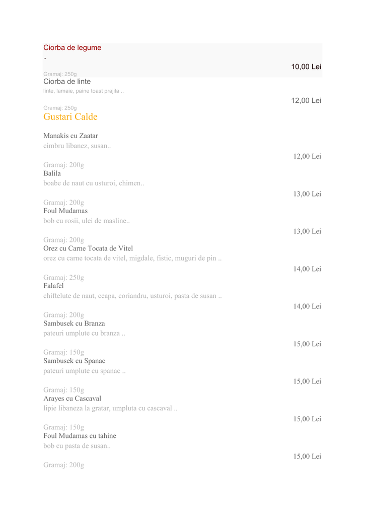 Ciorba de legume .. 10,00 Lei Gramaj: 250g Ciorba de linte linte, lamaie, paine toast prajita .. 12,00 Lei Gramaj: 250g Gustari Calde Manakis cu Zaatar cimbru libanez, susan.. 12,00 Lei Gramaj: 200g Balila boabe de naut cu usturoi, chimen.. 13,00 Lei Gramaj: 200g Foul Mudamas bob cu rosii, ulei de masline.. 13,00 Lei Gramaj: 200g Orez cu Carne Tocata de Vitel orez cu carne tocata de vitel, migdale, fistic, muguri de pin .. 14,00 Lei Gramaj: 250g Falafel chiftelute de naut, ceapa, coriandru, usturoi, pasta de susan .. 14,00 Lei Gramaj: 200g Sambusek cu Branza pateuri umplute cu branza .. 15,00 Lei Gramaj: 150g Sambusek cu Spanac pateuri umplute cu spanac .. 15,00 Lei Gramaj: 150g Arayes cu Cascaval lipie libaneza la gratar, umpluta cu cascaval .. 15,00 Lei Gramaj: 150g Foul Mudamas cu tahine bob cu pasta de susan.. 15,00 Lei Gramaj: 200g Lahmajun lipie libaneza la gratar umpluta cu carne, ceapa, rosii la cuptor.. 15,00 Lei Gramaj: 200g Sambusek cu Carne pateuri umplute cu carne de vitel .. 15,00 Lei Gramaj: 150g Arayes cu Pui, cascaval si ciuperci lipie libaneza la gratar, umpluta cu piept de pui, cascaval si ciuperci .. 16,00 Lei Gramaj: 150g Ficatei de Pui cu Sos ficatei de pui cu sos de usturoi, coriandru.. 16,00 Lei Gramaj: 200g Fatteh Humus Simpla pasta de susan, boabe de naut, iaurt, usturoi, chimen, muguri de pin .. 16,00 Lei Gramaj: 250g Macanek cu Sos Acrisor Sujuk cu Sos de Rosii si Usturoi carnati picanti cu sos de rosii si usturoi .. 16,00 Lei Gramaj: 200g Limba cu Sos de Usturoi si Lamaie .. 16,00 Lei Gramaj: 200g Arayes Kafta (Maria) lipie libaneza la gratar, umpluta cu carne tocata de vita si berbecut, rosii, ceapa, patrunjel.. 16,00 Lei Gramaj: 150g Arayes Toska lipie libaneza la gratar, umpluta cu carne tocata de vita si berbecut, rosii, ceapa, patrunjel, bran.. 16,00 Lei Gramaj: 150g Kebbeh Prajita chiftelute umplute cu carne tocata de vitel, muguri de pin, nuca .. 17,00 Lei Gramaj: 150g Fatteh Humus cu Carne de Vitel carne de vitel tocata cu pasta de susan, boabe de naut, iaurt, usturoi, chimen, muguri de pin.. 18,00 Lei Gramaj: 250g Pui Tulin cu Sos piept de pui cu sos de usturoi, coriandru, suc de lamaie .. 20,00 Lei Gramaj: 200g Shaworma de Pui .. 20,00 Lei Gramaj: 200g Ras Asfur de Pui cu Suc de Rodii cubulete din piept de pui, ceapa, suc de rodii, suc de lamaie, coriandru .. 22,00 Lei Gramaj: 200g Sarhat de Pui cu Sos felii din piept de pui cu sos de usturoi, coriandru .. 22,00 Lei Gramaj: 200g Aripioare de Pui Prajite cu Sos aripioare de pui cu sos de usturoi, coriandru .. 23,00 Lei Gramaj: 200g Ras Asfur de Vita cu Suc de Rodii bucatele din muschi de vita, ceapa, suc de rodii, suc de lamaie .. 25,00 Lei Gramaj: 200g Shaworma de vita .. 25,00 Lei Gramaj: 200g Sarhat de Vitel cu Sos felii din muschi de vitel cu sos de usturoi, menta .. 25,00 Lei Gramaj: 200g Aripioare de pui dezosate pane cu sos iute .. 25,00 Lei Gramaj: 250g Shaworma de Pui cu Cartofi Prajiti .. 26,00 Lei Gramaj: 400g Shaworma de vita cu cartofi prajiti .. 30,00 Lei Gramaj: 400g Peste Pui de Balta Prajit .. 30,00 Lei Gramaj: 200g Dorada Prajita .. 50,00 Lei Gramaj: 500g Dorada la Gratar .. 50,00 Lei Gramaj: 500g Creveti fierti .. 145,00 Lei Gramaj: 500g Creveti la Gratar .. 145,00 Lei Gramaj: 500g Gratar Uzii rasol de berbec la tava cu orez, nuca, migdale si fistic doar la comanda, pretul se calculeaz.. 0,00 Lei Gramaj: doar la comanda Berbec la tava cu orez doar la comanda, pretul se calculaza in functie de kg .. 0,00 Lei Macanek la Gratar carnaciori libanezi din carne de berbecut si vitel .. 20,00 Lei Gramaj: 200g Sujuk la Gratar carnati picanti din carne de berbecut si vitel .. 20,00 Lei Gramaj: 200g Piept de Pui la Gratar .. 20,00 Lei Gramaj: 250g Branza la Gratar .. 22,00 Lei Gramaj: 200g Aripioare de Pui la Gratar .. 26,00 Lei Gramaj: 250g Shish Tawouk Frigarui din piept de pui.. 26,00 Lei Gramaj: 200g Kebab carne tocata de vitel si berbecut.. 26,00 Lei Gramaj: 200g Kebab Iaurt carne tocata de vitel si berbec cu sos de iaurt, menta, usturoi.. 28,00 Lei Gramaj: 200g Kebab Orfali carne tocata de vitel si berbec cu sos de rosii iute.. 28,00 Lei Gramaj: 250g Cotlete de Berbecut .. 28,00 Lei Gramaj: 250g Ismerli carne tocata de vitel si berbecut, nuca, ciuperci, muguri de pin, branza.. 30,00 Lei Gramaj: 200g Kebab Adana carne tocata de vitel si berbecut, usturoi, patrunjel, condimente, ardei iute.. 30,00 Lei Gramaj: 200g Pui de Casa Dezosat(1 pers) .. 30,00 Lei Gramaj: 500g Gratar Kebe al Sih carne tocata cu grau si muguri de pin .. 30,00 Lei Gramaj: 250g Frigarui din Muschi de Vitel .. 32,00 Lei Gramaj: 200g Frigarui din Muschi de Berbecut .. 32,00 Lei Gramaj: 200g Mixtgrill frigarui de vita, frigarui de pui, kebab .. 38,00 Lei Gramaj: 300g Muschi de Vita la Gratar .. 45,00 Lei Gramaj: 200g Sarhat de Vita la Gratar felii din muschi de vita la gratar .. 45,00 Lei Gramaj: 200g Pui de casa dezosat(2 pers) .. 60,00 Lei Gramaj: 1000g Majuca carne de vitel si oaie, branza, ciuperci, muguri de pin .. 80,00 Lei Gramaj: 800g Garnituri Cartofi Natur .. 6,00 Lei Gramaj: 200g Cartofi Prajiti Simpli .. 6,00 Lei Gramaj: 200g Cartofi Prajiti cu Usturoi si Menta .. 7,00 Lei Gramaj: 200g Cartofi Piure .. 7,00 Lei Gramaj: 200g Orez Alb Simplu .. 7,00 Lei Gramaj: 200g Legume Sote .. 8,00 Lei Gramaj: 200g Ciuperci Sote .. 10,00 Lei Gramaj: 200g Orez cu Legume .. 10,00 Lei Gramaj: 200g Friche Simpla grau .. 12,00 Lei Gramaj: 200g Cartofi Iuti cartofi prajiti cu pasta iute, usturoi.. 12,00 Lei Gramaj: 200g Friche cu carne tocata de vitel carne tocata cu grau, migdale, fistic, muguri de pin .. 15,00 Lei Gramaj: 200g Legume la Gratar rosii, ceapa, ardei gras, ardei iute.. 20,00 Lei Gramaj: 200g Salate Salata de Varza .. 8,00 Lei Gramaj: 250g Castraveti Murati, ardei iute, masline .. 8,00 Lei Gramaj: 250g Salata de Castraveti cu Ceapa .. 10,00 Lei Gramaj: 250g Salata de Rosii .. 10,00 Lei Gramaj: 250g Salata Verde .. 10,00 Lei Gramaj: 250g Tatichi iaurt cu castraveti, menta, usturoi .. 12,00 Lei Gramaj: 200g Salata Mixt