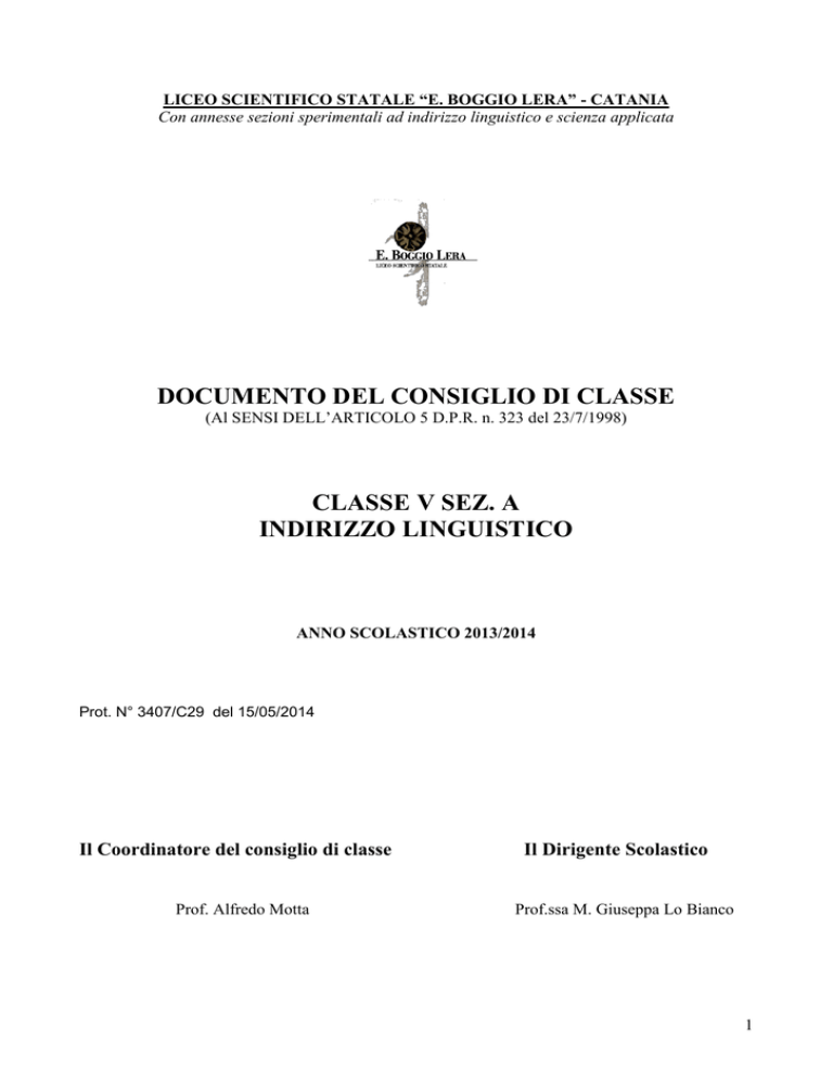 LICEO SCIENTIFICO STATALE “E. BOGGIO LERA” - CATANIA Con annesse sezioni sperimentali ad indirizzo linguistico e scienza applicata DOCUMENTO DEL CONSIGLIO DI CLASSE (Al SENSI DELL’ARTICOLO 5 D.P.R. n. 323 del 23/7/1998) CLASSE V SEZ. A INDIRIZZO LINGUISTICO ANNO SCOLASTICO 2013/2014 Prot. N° 3407/C29 del 15/05/2014 Il Coordinatore del consiglio di classe Prof. Alfredo Motta Il Dirigente Scolastico Prof.ssa M. Giuseppa Lo Bianco 1 Prot. 3382 / C29 PRESENTAZIONE DELLA SCUOLA Il nostro Istituto insiste sul territorio della prima municipalità. E’ frequentato prevalentemente da allievi provenienti dai quartieri della zona sud della città, attualmente comprende i seguenti corsi di studio: Liceo Scientifico Ordinario, Liceo delle Scienze Applicate, Liceo Linguistico. L’istituto è dotato di laboratori linguistici e multimediali nonché di palestre e aule per le attività musico-espressive. La scuola possiede inoltredue succursali : la prima è situata in via Teatro Greco, la seconda ha sede in corso Indipendenza presso la ex S.M.S. Leonardo Grassi che è stato interamente acquisita dal Liceo. FINALITÀ Finalità prioritaria di questo Istituto è fornire agli studenti gli strumenti indispensabili per un inserimento attivo e responsabile nell’attuale contesto sociale ed, eventualmente, nel mondo del lavoro, e per un proficuo proseguimento degli studi. All’interno di una società complessa, obiettivo della scuola è la formazione di mentalità aperte, dotate di forte capacità di osservazione e riflessione, di analisi e di sintesi. La capacità di comprendere, di informarsi e di essere criticamente informato sono oggi il fondamento della libertà individuale e della possibilità dell’esercizio reale dei diritti e dei doveri. Da qui l’obiettivo di operazioni coordinate che mirino al raggiungimento delle seguenti finalità educative: - Educazione alla consapevolezza di se’ e degli altri La società ha bisogno di persone libere perché consapevoli dei propri mezzi e dei propri limiti, capaci di porre problemi nel modo giusto, capaci di affrontare con pari efficacia i problemi della vita personale, del lavoro e della vita sociale - Educazione alla valorizzazione dei beni culturali e alla sensibilità estetica per acquisire l’abilità di lettura del proprio territorio e saper guardare attraverso le cose, i fatti e la gente. - Educazione alla convivenza democratica attraverso la riqualificazione degli ambiti assembleari e partecipativi previsti dalla legge. Gli spazi assembleari devono diventare occasione di confronto grazie all’uso intelligente degli spazi autogestiti del tempo scolastico. 2 La classe, non rientrata nella Riforma della scuola secondaria di Secondo Grado, ha seguito il seguente quadro orario : LICEO LINGUISTICO Quadro orario Materie di insegnamento I Anno II Anno III Anno IV Anno V Anno Prove Religione 1 1 1 1 1 O. Italiano 5 5 4 4 4 O.S. Latino 3 3 - - - O.S. Latino - - 3 3 2 O. Storia e Geografia 3 3 - - - O. Storia - - 2 2 3 O. 1^Lingua straniera (Francese o Inglese) 3 (1) 3 (1) 4 (1) 4 (1) 4( 1) O.S. 2^Lingua straniera (Francese o Inglese) 4 (1) 4 (1) 4 (1) 4 (1) 4 (1) O.S. 3^Lingua straniera (Tedesco o Spagnolo) - - 5 (1) 5 (1) 5 (1) O.S. Educazione Civica Giuridica Economica 2 2 - - - O. Filosofia - - 3 3 3 O. Matematica & Informatica 4 4 3 3 3 O.S. Fisica 3 3 - - - O Scienze naturali, Chimica, Biologia, Geografia 3 3 2 2 2 O. Disegno e Linguaggi Visivi 2 2 - - - O. Gr. Storia dell’arte - - 2 2 2 O. 3 Educazione fisica 2 2 2 2 2 Pr. TOTALE 35 35 35 35 35 - ELENCO DEI DOCENTI DISCIPLINA COGNOME E NOME RELIGIONE Prof.ssa N. Amato ITALIANO Prof. S. Piccinini LATINO Prof. M.A. Cottone STORIA FILOSOFIA Prof. A. Motta Prof. o. Di Mauro LINGUA E CIVILTA’ INGLESE Prof.ssa D. Cucchiara CONVERSAZIONE IN LINGUA INGLESE Prof.ssa S. Catania LINGUA E CIVILTA’ FRANCESE Prof.ssa T. Profeta CONVERSAZIONE IN LINGUA FRANCESE Prof.ssa P. Russo LINGUA E CIVILTA’ SPAGNOLA Prof.ssa R. Musmeci CONVERSAZIONE IN LINGUA SPAGNOLA Prof.ssa G. Gomez LINGUA E CIVILTA’TEDESCA Prof.ssa R. Albo CONVERSAZIONE IN LINGUA TEDESCA Prof.ssa A. Greco MATEMATICA Prof. D. Scirè SCIENZE NATURALI, CHIMICA, BIOLOGIA,GEOGRAFIA Prof. M. Foti FIRMA 4 STORIA DELL’ARTE Prof.ssa A.Cozza EDUCAZIONE FISICA Prof.ssa M.G.Mazzone ELENCO ALUNNI Nome e Cognome 1. 2. 3. 4. 5. 6. 7. 8. 9. 10. 11. 12. 13. FINOCCHIARO GIORGIA GENTILE ANNUNZIATA GIUGNO RAMONA LOMBARDO MONIA FEDERICA MAZZULLO ROSARIA AGATA OLIVERI GINEVRA POSA GLORIA RITA PRIVITERA CHIARA SAITTA MIRIAM STRANO HELENA TIMPANO MARTINA WILLIAMS ENYA KIARA ZINGHIRINO CSILLA Data e luogo di nascita Catania, 15/09/1995 Catania, 17/05/1995 Catania 28/04/1995 Catania, 30/07/1995 Catania, 14/01/1995 Catania, 13/12/1995 Catania, 08/06/1995 Catania, 24/10/1995 Catania, 03/10/1994 Catania, 10/10/1995 Catania, 24/10/1995 Cagliari, 17/09/1995 Miskolc, 02/10/1994 Provenienza Mascalucia Catania Aci Catena Catania Misterbianco C. di Judica Catania Catania Gravina di Ct Catania Catania Motta S.Anast. Misterbianco INFORMAZIONI GENERALI SULLA CLASSE La classe è costituita da 13 ragazze di cui 6 provenienti dal comune di Catania, 6 da comuni limitrofi (Motta S.Anastasia, Gravina, Mascalucia, Misterbianco) e una da Castel di Judica. Al gruppo classe si è aggiunta nel precedente a.s. l’alunna Saitta Miriam proveniente da altro isituto. Nel corso del quinquennio la classe ha dimostrato sempre una certa disponibilità a partecipare al dialogo educativo pur permanendo diversi stili di apprendimento fra le discenti.Il dialogo educativo complessivo non ha mai registrato rilevanti problemi dal punto di vista disciplinare e le alunne hanno dimostrato, specie nell’ultimo anno di corso, una certa disposizione a migliorare le proprie conoscenze animate sempre da buona e crescente forza di volontà. Possiamo, pertanto, suddividere la classe in tre livelli di apprendimento come di seguito riportato: a) alunne che hanno conseguito pienamente gli obiettivi fissati dal C