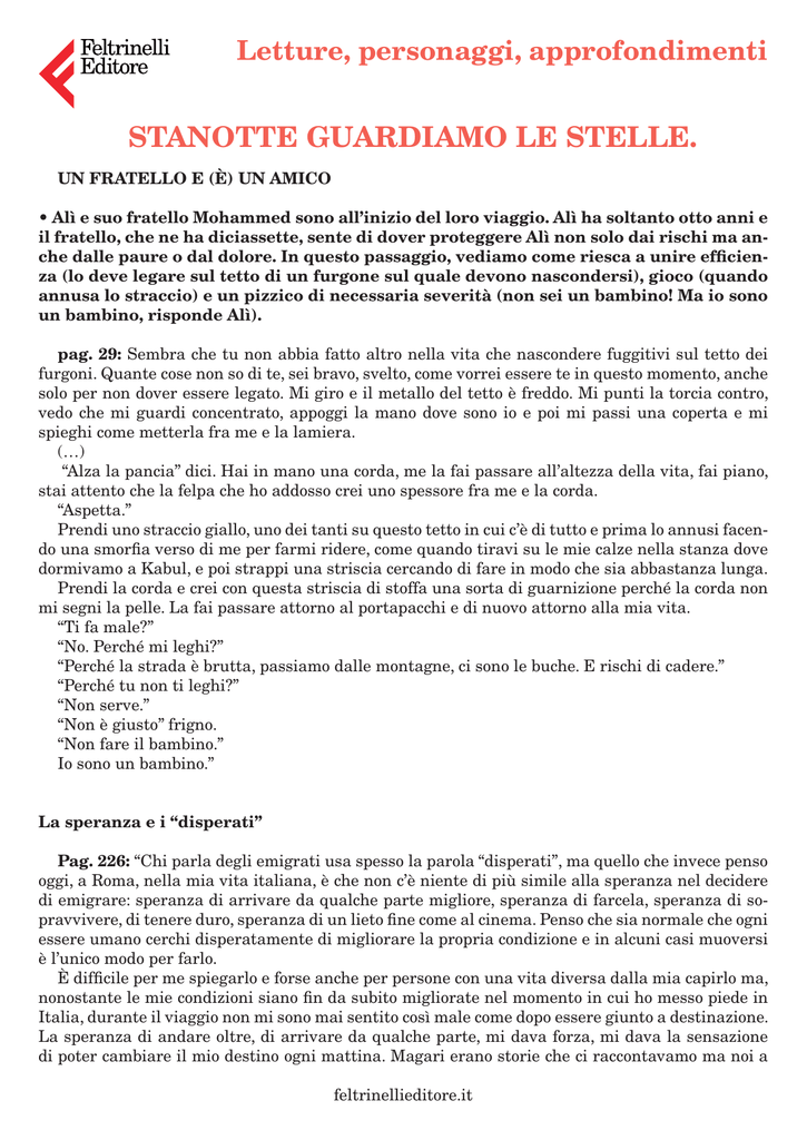 Letture, personaggi, approfondimenti STANOTTE GUARDIAMO LE STELLE. UN FRATELLO E (È) UN AMICO • Alì e suo fratello Mohammed sono all’inizio del loro viaggio. Alì ha soltanto otto anni e il fratello, che ne ha diciassette, sente di dover proteggere Alì non solo dai rischi ma anche dalle paure o dal dolore. In questo passaggio, vediamo come riesca a unire efficienza (lo deve legare sul tetto di un furgone sul quale devono nascondersi), gioco (quando annusa lo straccio) e un pizzico di necessaria severità (non sei un bambino! Ma io sono un bambino, risponde Alì). pag. 29: Sembra che tu non abbia fatto altro nella vita che nascondere fuggitivi sul tetto dei furgoni. Quante cose non so di te, sei bravo, svelto, come vorrei essere te in questo momento, anche solo per non dover essere legato. Mi giro e il metallo del tetto è freddo. Mi punti la torcia contro, vedo che mi guardi concentrato, appoggi la mano dove sono io e poi mi passi una coperta e mi spieghi come metterla fra me e la lamiera. (…) “Alza la pancia” dici. Hai in mano una corda, me la fai passare all’altezza della vita, fai piano, stai attento che la felpa che ho addosso crei uno spessore fra me e la corda. “Aspetta.” Prendi uno straccio giallo, uno dei tanti su questo tetto in cui c’è di tutto e prima lo annusi facendo una smorfia verso di me per farmi ridere, come quando tiravi su le mie calze nella stanza dove dormivamo a Kabul, e poi strappi una striscia cercando di fare in modo che sia abbastanza lunga. Prendi la corda e crei con questa striscia di stoffa una sorta di guarnizione perché la corda non mi segni la pelle. La fai passare attorno al portapacchi e di nuovo attorno alla mia vita. “Ti fa male?” “No. Perché mi leghi?” “Perché la strada è brutta, passiamo dalle montagne, ci sono le buche. E rischi di cadere.” “Perché tu non ti leghi?” “Non serve.” “Non è giusto” frigno. “Non fare il bambino.” Io sono un bambino.” La speranza e i “disperati” Pag. 226: “Chi parla degli emigrati usa spesso la parola “disperati”, ma quello che invece penso oggi, a Roma, nella mia vita italiana, è che non c’è niente di più simile alla speranza nel decidere di emigrare: speranza di arrivare da qualche parte migliore, speranza di farcela, speranza di sopravvivere, di tenere duro, speranza di un lieto fine come al cinema. Penso che sia normale che ogni essere umano cerchi disperatamente di migliorare la propria condizione e in alcuni casi muoversi è l’unico modo per farlo. È difficile per me spiegarlo e forse anche per persone con una vita diversa dalla mia capirlo ma, nonostante le mie condizioni siano fin da subito migliorate nel momento in cui ho messo piede in Italia, durante il viaggio non mi sono mai sentito così male come dopo essere giunto a destinazione. La speranza di andare oltre, di arrivare da qualche parte, mi dava forza, mi dava la sensazione di poter cambiare il mio destino ogni mattina. Magari erano storie che ci raccontavamo ma noi a feltrinellieditore.it Letture, personaggi, approfondimenti queste storie ci credevamo. Mi dicevo che ce l’avrei dovuta mettere tutta ma che poi sarei riuscito a realizzare i sogni che tu, Mohammed, avevi per noi: innamorarsi, trovare una casa in cui vivere, avere dei figli e poter camminare a testa alta senza essere continuamente umiliati.” • Quanta determinazione deve avere una famiglia, un ragazzo o, come nel caso di Alì, un bambino, per decidere di partire e affrontare rischi e difficoltà verso un mondo che neppure si conosce? Quanta speranza in un futuro migliore deve accompagnare un emigrato? Quello che Alì vuol dire qui sembra essere che tante volte una speranza vale più di qualsiasi altra cosa: il bambino senza niente che dalla Grecia cerca di arrivare in Italia clandestinamente era quasi più felice di quello che, con un letto e un tetto sopra la testa, deve affrontare la delusione di essere arrivato a destinazione per scoprire che c’è ancora molto da lottare per raggiungere la felicità. Immigrazione e Razzismo • Alì adesso è a Teheran, in Iran, e con Mohammed vivono da zii di amici. Suo fratello durante il giorno lavora in un mercato ed è molto impegnato, e ad Alì non resta che trascorrere le giornate a fare piccoli lavoretti e a giocare con i bambini. Ma purtroppo, come si sa, il razzismo non è solo in Italia o solo contro determinati gruppi di persone. Alì, che non capisce molto bene la lingua della città in cui si trova, sta per scoprire che i ragazzini con cui gioca si prendono gioco di lui alle sue spalle. Pag. 98-99: Teheran diventa per me una mappa dei divertimenti: la piazza in cui incontro sempre quelli che corrono dietro a un aquilone, la via in cui si gioca a pallone, le biglie, le pistole ad acqua con cui mi innaffiano. Quando arrivo, spesso mi cantano una canzone, capisco solo che c’è dentro la parola “afghano” e che deve essere divertente e quindi la canto anch’io ma senza conoscere il significato delle parole. Come aiutante degli zii non sono un granché, capita che mi mandino a comprare dieci pomodori e che ritorni dopo un’ora perché mi fermo per strada a giocare. Un giorno mi attardo più del solito e zio Enaiath viene a cercarmi. Ha paura che mi sia successo qualcosa, va al negozio dove dovevo comprare il pane e non mi trova, neanche in un altro, comincia a preoccuparsi finché mi vede che canto assieme ad altri bambini una delle solite canzoncine. Vedo che mi osserva stupito. “Scusa” dico. “C’era troppa coda, sono venuto qui un momento e poi mi sono scordato della commissione.” “Di dove sei, tu?” mi chiede sorridendo. “In che senso?” “Sei afghano, no?” “Certo. Perché, zio?” “Sai cosa stai cantando?” “Boh, afghano qualcosa, non lo so, non ho ben capito.” “La canzone dice ‘Gli afghani hanno tutti la barba, si mettono in testa il colbacco e si abbracciano come dei froci quando si salutano...’. Hai capito adesso?” mi 