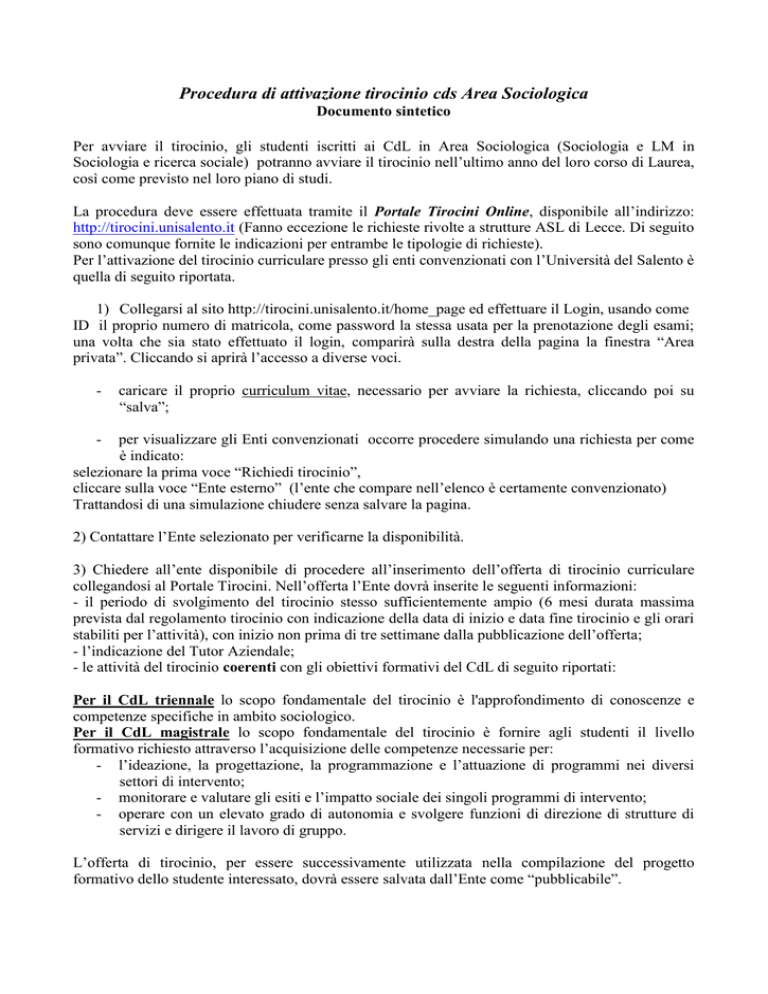 Procedura di attivazione tirocinio cds Area Sociologica Documento sintetico Per avviare il tirocinio, gli studenti iscritti ai CdL in Area Sociologica (Sociologia e LM in Sociologia e ricerca sociale) potranno avviare il tirocinio nell’ultimo anno del loro corso di Laurea, così come previsto nel loro piano di studi. La procedura deve essere effettuata tramite il Portale Tirocini Online, disponibile all’indirizzo: http://tirocini.unisalento.it (Fanno eccezione le richieste rivolte a strutture ASL di Lecce. Di seguito sono comunque fornite le indicazioni per entrambe le tipologie di richieste). Per l’attivazione del tirocinio curriculare presso gli enti convenzionati con l’Università del Salento è quella di seguito riportata. 1) Collegarsi al sito http://tirocini.unisalento.it/home_page ed effettuare il Login, usando come ID il proprio numero di matricola, come password la stessa usata per la prenotazione degli esami; una volta che sia stato effettuato il login, comparirà sulla destra della pagina la finestra “Area privata”. Cliccando si aprirà l’accesso a diverse voci. - caricare il proprio curriculum vitae, necessario per avviare la richiesta, cliccando poi su “salva”; - per visualizzare gli Enti convenzionati occorre procedere simulando una richiesta per come è indicato: selezionare la prima voce “Richiedi tirocinio”, cliccare sulla voce “Ente esterno” (l’ente che compare nell’elenco è certamente convenzionato) Trattandosi di una simulazione chiudere senza salvare la pagina. 2) Contattare l’Ente selezionato per verificarne la disponibilità. 3) Chiedere all’ente disponibile di procedere all’inserimento dell’offerta di tirocinio curriculare collegandosi al Portale Tirocini. Nell’offerta l’Ente dovrà inserite le seguenti informazioni: - il periodo di svolgimento del tirocinio stesso sufficientemente ampio (6 mesi durata massima prevista dal regolamento tirocinio con indicazione della data di inizio e data fine tirocinio e gli orari stabiliti per l’attività), con inizio non prima di tre settimane dalla pubblicazione dell’offerta; - l’indicazione del Tutor Aziendale; - le attività del tirocinio coerenti con gli obiettivi formativi del CdL di seguito riportati: Per il CdL triennale lo scopo fondamentale del tirocinio è l'approfondimento di conoscenze e competenze specifiche in ambito sociologico. Per il CdL magistrale lo scopo fondamentale del tirocinio è fornire agli studenti il livello formativo richiesto attraverso l’acquisizione delle competenze necessarie per: - l’ideazione, la progettazione, la programmazione e l’attuazione di programmi nei diversi settori di intervento; - monitorare e valutare gli esiti e l’impatto sociale dei singoli programmi di intervento; - operare con un elevato grado di autonomia e svolgere funzioni di direzione di strutture di servizi e dirigere il lavoro di gruppo. L’offerta di tirocinio, per essere successivamente utilizzata nella compilazione del progetto formativo dello studente interessato, dovrà essere salvata dall’Ente come “pubblicabile”. 4) Il tirocinante, ottenuta la disponibilità dell’ente, può procedere all’inserimento definivo della richiesta sempre attraverso il Portale Tirocini selezionando come tipologia “tirocinio curriculare”, con indicazione della data di inizio e data fine tirocinio concordata con l’ente, inserendo la preferenza della Struttura scelta nella voce “Ente esterno” e indicando la sede dove si svolgerà l’attività di tirocinio se essa è differente dalla sede principale (es. sede principale ASL di Brindisi – Sede di tirocinio consultorio di San Pietro Vernotico). 5) Salvare e stampare la richiesta di tirocinio e inviarne copia via mail all’indirizzo mail della Segreteria Servizi agli Studenti di riferimento, di seguito indicato: - [email protected], per i tirocini formativi curriculari di studenti iscritti ai cds con sede didattica LECCE (cdl magistrale Sociologia e Ricerca Sociale); - [email protected], per i tirocini formativi di studenti iscritti ai cds con sede didattica BRINDISI (cdl Sociologia). N. B. tale invio va effettuato dall’indirizzo e-mail più utilizzato dallo studente, in quanto è a questo indirizzo che la segreteria inoltrerà tutte le comunicazioni. 6) La Segreteria servizi agli studenti, ricevuta dallo studente la richiesta di tirocinio e verificato che l’ente abbia compilato l’offerta sul portale tirocini, invierà allo studente il progetto formativo e la lettera di trasmissione all’Ente tramite e-mail; 7) lo studente, a sua volta, stamperà 3 copie del progetto formativo facendole firmare dal rappresentante legale o da un delegato dell’ente ospitante (non già dal tutor aziendale); dal Manager Didattico dott.ssa Mariacristina Solombrino, nel rispetto degli orari di ricevimento indicati sul sito di Facoltà, avendo cura di apporre, oltre alla propria firma, data e luogo in cui verranno rispettivamente firmate. Lo studente inoltre dovrà stampare una copia della lettera di trasmissione sempre a firma della dott.ssa Solombrino. Le 3 copie del progetto e la lettera di trasmissione allegata, debitamente firmate, dovranno essere consegnate nella Segreteria Servizi agli studenti (segreteria didattica) di riferimento (c/o CodacciPisanelli per i cds con sede Lecce e c/o Cittadella della Ricerca per i cds con sede Brindisi), negli orari di ricevimento studenti previsti, per la necessaria acquisizione al protocollo di Facoltà propedeutica all’AVVIO del Tirocinio. 8) Scaricare il libretto di tirocinio, disponibile sul sito di Facoltà www.formazionescienzesociali.unisalento.it – Sezione STAGE E TIROCINI – RISORSE CORRELATE – DOCUMENTI – “Registro Tirocinio_TUTTI_CORSI” per la necessaria compilazione con le ore svolte in struttura, di concerto con il Tutor Aziendale. ENTI NON ANCORA CONVENZIONATI CON L’UNIVERSITA’ DEL SALENTO Tutti gli enti/aziende (soggetti ospitanti) interessate alla creazione