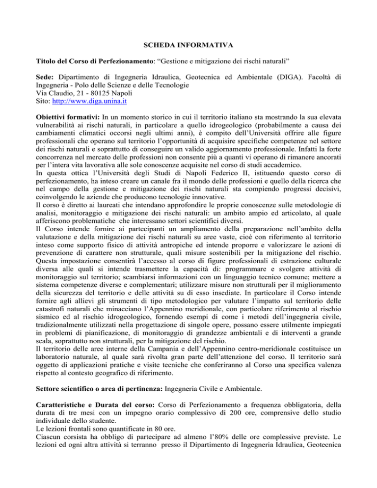 SCHEDA INFORMATIVA Titolo del Corso di Perfezionamento: “Gestione e mitigazione dei rischi naturali” Sede: Dipartimento di Ingegneria Idraulica, Geotecnica ed Ambientale (DIGA). Facoltà di Ingegneria - Polo delle Scienze e delle Tecnologie Via Claudio, 21 - 80125 Napoli Sito: http://www.diga.unina.it Obiettivi formativi: In un momento storico in cui il territorio italiano sta mostrando la sua elevata vulnerabilità ai rischi naturali, in particolare a quello idrogeologico (probabilmente a causa dei cambiamenti climatici occorsi negli ultimi anni), è compito dell’Università offrire alle figure professionali che operano sul territorio l’opportunità di acquisire specifiche competenze nel settore dei rischi naturali e soprattutto di conseguire un valido aggiornamento professionale. Infatti la forte concorrenza nel mercato delle professioni non consente più a quanti vi operano di rimanere ancorati per l’intera vita lavorativa alle sole conoscenze acquisite nel corso di studi accademico. In questa ottica l’Università degli Studi di Napoli Federico II, istituendo questo corso di perfezionamento, ha inteso creare un canale fra il mondo delle professioni e quello della ricerca che nel campo della gestione e mitigazione dei rischi naturali sta compiendo progressi decisivi, coinvolgendo le aziende che producono tecnologie innovative. Il corso è diretto ai laureati che intendano approfondire le proprie conoscenze sulle metodologie di analisi, monitoraggio e mitigazione dei rischi naturali: un ambito ampio ed articolato, al quale afferiscono problematiche che interessano settori scientifici diversi. Il Corso intende fornire ai partecipanti un ampliamento della preparazione nell’ambito della valutazione e della mitigazione dei rischi naturali su aree vaste, cioè con riferimento al territorio inteso come supporto fisico di attività antropiche ed intende proporre e valorizzare le azioni di prevenzione di carattere non strutturale, quali misure sostenibili per la mitigazione del rischio. Questa impostazione consentirà l’accesso al corso di figure professionali di estrazione culturale diversa alle quali si intende trasmettere la capacità di: programmare e svolgere attività di monitoraggio sul territorio; scambiarsi informazioni con un linguaggio tecnico comune; mettere a sistema competenze diverse e complementari; utilizzare misure non strutturali per il miglioramento della sicurezza del territorio e delle attività su di esso insediate. In particolare il Corso intende fornire agli allievi gli strumenti di tipo metodologico per valutare l’impatto sul territorio delle catastrofi naturali che minacciano l’Appennino meridionale, con particolare riferimento al rischio sismico ed al rischio idrogeologico, fornendo esempi di come i metodi dell’ingegneria civile, tradizionalmente utilizzati nella progettazione di singole opere, possano essere utilmente impiegati in problemi di pianificazione, di monitoraggio di grandezze ambientali e di interventi a grande scala, soprattutto non strutturali, per la mitigazione del rischio. Il territorio delle aree interne della Campania e dell’Appennino centro-meridionale costituisce un laboratorio naturale, al quale sarà rivolta gran parte dell’attenzione del corso. Il territorio sarà oggetto di applicazioni pratiche e visite tecniche che conferiranno al Corso una specifica valenza rispetto al contesto geografico di riferimento. Settore scientifico o area di pertinenza: Ingegneria Civile e Ambientale. Caratteristiche e Durata del corso: Corso di Perfezionamento a frequenza obbligatoria, della durata di tre mesi con un impegno orario complessivo di 200 ore, comprensive dello studio individuale dello studente. Le lezioni frontali sono quantificate in 80 ore. Ciascun corsista ha obbligo di partecipare ad almeno l’80% delle ore complessive previste. Le lezioni ed ogni altra attività si terranno presso il Dipartimento di Ingegneria Idraulica, Geotecnica ed Ambientale dell’Università degli Studi di Napoli Federico II. Il corso sarà tenuto nel periodo da febbraio a maggio 2012 ed impegnerà i corsisti per due pomeriggi a settimana. Valenza e caratteristiche del titolo conseguibile: Formazione di professionisti con specifiche competenze tecnico-scientifiche di analisi, monitoraggio e mitigazione dei rischi naturali. Vengono riconosciuti 8 crediti formativi. Coordinatore: Prof. Ing. Gianfranco URCIUOLI - Dipartimento di Ingegneria Idraulica, Geotecnica ed Ambientale – Via Claudio, 21 - 80125 Napoli – Telefono 081 7683544 – Fax 081 5938936 - e-mail: [email protected] Responsabile didattica: Prof. Ing. Luca Pagano - Dipartimento di Ingegneria Idraulica, Geotecnica ed Ambientale - Via Claudio, 21 - 80125 Napoli. Telefono: 081 7683478 – Fax: 081 5938936 – e-mail: [email protected] Segreteria didattica: Dott. Ing. Marianna Pirone - Dipartimento di Ingegneria Idraulica, Geotecnica ed Ambientale Via Claudio 21 - 80125 Napoli. Telefono: 081 7685913 – Fax: 081 5938936 – e-mail: [email protected] Responsabile amministrativo: Dott.sa Nicolina Naccarato – segretaria amministrativa Dipartimento di Ingegneria Idraulica, Geotecnica ed Ambientale - Via Claudio, 21 - 80125 Napoli. Telefono: 081 7683447 – Fax: 081 5938936 – e-mail: [email protected]. Numero chiuso: Il numero massimo di iscritti è pari a 50. Agli allievi in possesso di laurea in Ingegneria Civile e Ingegneria per l’Ambiente e il Territorio del vecchio ordinamento e delle classi di laurea specialistiche in Ingegneria Civile e Ingegneria per l’Ambiente e il Territorio sarà riservato un numero di posti pari a 25. Fra tutti gli aspiranti sarà effettuata una selezione sulla base del curriculum e dei titoli, valutando l’attinenza delle esperienze culturali e professionali dei candidati al tema del corso. Requisiti di ammissione: Possesso del Diploma di Laurea degli ordinamenti previgenti al D.M. 509/99 (lauree del v.o.), laurea quinquennale o una qualsiasi laurea specia