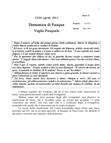 1 Anno A 23/24 apr ile 2011 Domenica di Pasqua Veglia Pasquale Romani 6, 311 Matteo 28, 110 1 Dopo il sabato, all’alba del primo giorno della settimana, Maria di Màgdala e l’altra Maria andarono a visitare la tomba. 2 Ed ecco, vi fu un gran terremoto. Un angelo del Signore, infatti, sceso dal cielo, si avvicinò, rotolò la pietra e si pose a sedere su di essa. 3 Il suo aspetto era come folgore e il suo vestito bianco come neve. 4 Per lo spavento che ebbero di lui, le guardie furono scosse e rimasero come morte. 5 L’angelo disse alle donne: «Voi non abbiate paura! So che cercate Gesù, il crocifisso. 6 Non è qui. È risorto, infatti, come aveva detto; venite, guardate il luogo dove era stato deposto. 7 Presto, andate a dire ai suoi discepoli: “È risorto dai morti, ed ecco, vi precede in Galilea; là lo vedrete” Ecco, io ve l’ho detto». 8 Abbandonato in fretta il sepolcro con timore e gioia grande, le donne corsero a dare l’annuncio ai suoi discepoli. 9 Ed ecco, Gesù venne loro incontro e disse: «Salute a voi!». Ed esse si avvicinarono, gli abbracciarono i piedi e lo adorarono. 10 Allora Gesù disse loro: «Non temete; andate ad annunciare ai miei fratelli che vadano in Galilea: là mi vedranno». L’ultimo capitolo del Vangelo, che ha il suo centro nella risurrezione di Gesù, viene particolarmente curato dall’evangelista. Matteo, come del resto nessuno degli altri evangelisti, non descrive la risurrezione di Gesù, che è ricordata come un evento già accaduto “è stato risuscitato dai morti”, ma solo quel che si è verificato dopo. L’evangelista tramanda solo quello che è necessario per lo scopo teologico. La scena della risurrezione del Cristo tramandata dagli artisti non trova riscontro nel NT, ma in un testo apocrifo, Il Vangelo di Pietro (sec. II), definito il più antico racconto non canonico della passione. 2 1 VOye. de. sabba,twn( th/| evpifwskou,sh| eivj mi,an sabba,twn h=lqen Maria.m h` Magdalhnh. kai. h` a;llh Mari,a qewrh/sai to.n ta,fonÅ lett. Dopo (il) sabato, all’albeggiante (giorno) in (il) primo (giorno uno) della settimana venne Maria la Maddalena e l’altra Maria a vedere/osservare/verificare il sepolcro. CEI Dopo il sabato, all’alba del pr imo gior no della settimana, Mar ia di Màgdala e l’altr a Mar ia andar ono a visitar e la tomba. La narrazione inizia con un dato cronologico e, nello stesso tempo, teologico: dopo il sabato. L’esperienza della vita indistruttibile è stata ritardata dall’osservanza del riposo del Sabato. L’evangelista denuncia la fatica da parte dei discepoli di liberarsi dalla sottomissione della Legge, e li avverte che proprio l’osservanza della Legge, in questo caso, ritarda l’esperienza della nuova creazione inaugurata da Gesù. Per evidenziare questo, Matteo, segnala che l’intenzione delle donne è di andare a vedere/osservare il sepolcro (v. trad. letterale), quale conferma della morte di Gesù, e non accenna né a lamentazioni funebri né a unzioni del cadavere. L’espressione primo giorno (lett. l’uno della settimana ) richiama il racconto della creazione: E fu sera e fu mattina: primo giorno (Gn 1,5). L’evangelista, che ha cominciato il suo Vangelo ponendolo sotto la chiave della creazione (Biblos gheneseos, Mt 1,1), presenta la risurrezione di Gesù come azione creatrice di Dio con la quale inizia la nuova e definitiva creazione: Dio l’ha risuscitato dai morti (At 3,15; cfr. 10,40; 13,30). Con l’alba del primo giorno si apre un’era nuova dove l’uomo non è più condizionato dalla paura della morte e può sperimentare la pienezza di vita. La settimana ebraica terminava con il Sabato. Questo unico giorno che viene dopo la settimana è l’ottavo giorno, che nel cristianesimo assunse il valore simbolico dell’inizio di una vita nuova indistruttibile (per questi i battisteri, luogo dove il catecumeno decideva pubblicamente di cambiare vita aderendo a Gesù, erano di forma ottagonale). Questa prima indicazione rimanda alle beatitudini che in Matteo sono esattamente otto (Mt 5,310) e composte da settantadue parole, come le nazioni all’epoca conosciute. Protagoniste del racconto della risurrezione di Gesù sono due donne, Maria di Magdala e l’altra Maria (la madre di Giacomo e Giuseppe), che sono già state presentate come testimoni della crocifissione e della sepoltura di Gesù (Mt 27,56.61). Queste donne fanno parte del gruppo di discepole che avevano seguito Gesù dalla Galilea per assisterlo. È assente la terza testimone della crocifissione, la madre dei figli di Zebedeo. Con la morte di Gesù sono morti pure i suoi sogni di gloria per i propri figli e le sue ambizioni di madre (Mt 20,2021). 3 2 kai. ivdou. seismo.j evge,neto me,gaj\ a;ggeloj ga.r kuri,ou kataba.j evx ouvranou/ kai. proselqw.n avpeku,lisen to.n li,qon kai. evka,qhto evpa,nw auvtou/Å Ed ecco (un) terremoto ci fu grande; un angelo infatti del Signore essendo sceso da (il) cielo ed essendosi avvicinato rotolò via la pietra e si sedette/istallò sopra di essa. Ed ecco, vi fu un gr an ter r emoto. Un angelo del Signor e, infatti, sceso dal cielo, si avvicinò, r otolò la pietr a e si pose a seder e su di essa. Il terremoto era uno dei segni che nell’AT precedevano le manifestazioni di Dio. Nel libro dell’Esodo è scritto che prima che il Signore scendesse sul Sinai tutto il monte tremava molto (Es 19,18). Questo terremoto segnala una manifestazione divina (non apre il sepolcro) del tutto particolare e nella quale si rivela la vittoria della vita sulla morte. Come della pietra rotolata sulla porta del sepolcro è stato indicato che era grande (Mt 27,60), lo stesso si dice del terremoto. Al tentativo umano di separare il mondo dei vivi da quello dei morti, ponendo fra mezzo una pietra , risponde l’intervento di Dio con un gran terremoto per manifestare che la vita dell’uomo è stata liberata dagli effetti della morte. Quando Gesù spirò la terra tremò (Mt 27,51) e il centurione e quelli che con lu
