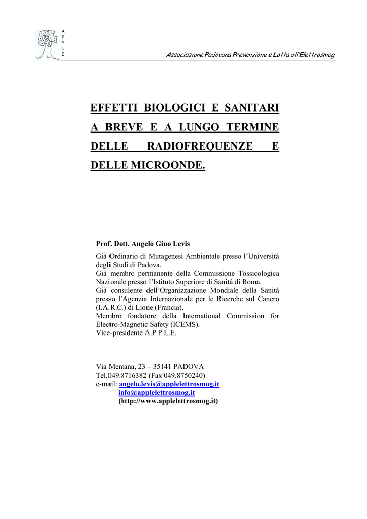 A P P L E EFFETTI BIOLOGICI E SANITARI A BREVE E A LUNGO TERMINE DELLE RADIOFREQUENZE E DELLE MICROONDE. Prof. Dott. Angelo Gino Levis Già Ordinario di Mutagenesi Ambientale presso lUniversità degli Studi di Padova. Già membro permanente della Commissione Tossicologica Nazionale presso lIstituto Superiore di Sanità di Roma. Già consulente dellOrganizzazione Mondiale della Sanità presso lAgenzia Internazionale per le Ricerche sul Cancro (I.A.R.C.) di Lione (Francia). Membro fondatore della International Commission for Electro-Magnetic Safety (ICEMS). Vice-presidente A.P.P.L.E. Via Mentana, 23 35141 PADOVA Tel.049.8716382 (Fax 049.8750240) e-mail: [email protected] [email protected] (http://www.applelettrosmog.it) INDICE ABBREVIAZIONI. Pag. 1 1. PREMESSA. 2 2. DISAMINA CRITICA DELLE POSIZIONI CONSERVATIVE. 3 2.1. DALLIRPA ALLICNIRP E ALLOMS. 4 2.2. IL RAPPORTO DELLICNIRP (1996) SUGLI EFFETTI SANITARI DEI TELEFONI CELLULARI E DELLE STAZIONI RADIO BASE. 7 2.3. IL RAPPORTO DELLICNIRP (1998) SULLE LINEE-GUIDA PER DEFINIRE I LIMITI DI ESPOSIZIONE A CEM NELLINTERO AMBITO DI FREQUENZE (DA 0 A 300 GHz). 9 2.4. IL PROGETTO INTERNAZIONALE CEM DELLOMS . 10 2.5. LA POSIZIONE DEL PARLAMENTO EUROPEO SULLE LINEEGUIDA ICNIRP/OMS E LA RACCOMANDAZIONE 519/1999 DEL CONSIGLIO DELLA COMUNITA EUROPEA . 11 I RAPPORTI DELLE PRINCIPALI ORGANIZZAZIONI E DEI CONGRESSI INTERNAZIONALI RICONDUCIBILI ALLA POSIZIONE CAUTELATIVA. 15 3.1. I PRIMI RICHIAMI ALLA PRUDENZA E LA POSIZIONE DI A. FIRSTENBERG. 15 3.2. IL CONGRESSO INTERNAZIONALE DI ROCKVILLE . 16 3.3. LA POSIZIONE DELLISPESL E DELLISS. 17 3.4. IL RAPPORTO DELLA SOCIETA REALE DEL CANADA. 19 3.5. IL CONGRESSO INTERNAZIONALE DI VIENNA . 20 3.6. IL RAPPORTO STEWART. 23 3.7. LA CONFERENZA INTERNAZIONALE DI SALISBURGO SULLE SRB. 27 3.8. IL RAPPORTO ZMIROU. 31 3.9. IL RAPPORTO DI G. HYLAND AL PARLAMENTO EUROPEO. 33 3.10. IL CONGRESSO INTERNAZIONALE DI STOCCOLMA SULLA ELETTROSENSIBILITA. 39 3. 3.11 40 3.12. LA CONFERENZA INTERNAZIONALE DI CATANIA. 43 3.13. IL 1° CONGRESSO INTERNAZIONALE DELLICEMS A VENEZIA. 43 EFFETTI GENETICI, EMBRIOTOSSICI, TERATOGENI E CANCEROGENI DELLE RADIOFREQUENZE E DELLE MICROONDE SU SISTEMI SPERIMENTALI DI LABORATORIO E SULLUOMO. 51 EFFETTI GENETICI DELLE RADIOFREQUENZE E MICROONDE. 51 4.1.1. ALTERAZIONI STRUTTURALI E FUNZIONALI DEL DNA. 52 4.1.2. EFFETTI CITOGENETICI. 53 4.1.3. MUTAZIONI GENICHE. 55 4.1.4. TRASFORMAZIONE NEOPLASTICA IN VITRO. 55 4.1.5. EFFETTI SUGLI SPERMI E SULLA FERTILITA MASCHILE. 56 4.2. EMBRIOTOSSICITA E TERATOGENESI. 56 4.3. EFFETTI CANCEROGENETICI SULLANIMALE. 56 4.4. ALTRI EFFETTI IN VITRO E IN VIVO, RILEVANTI AI FINI DELLA CANCEROGENESI. 57 5. INDAGINI EPIDEMIOLOGICHE SULLEFFETTO CANCEROGENO DELLE RADIOFREQUENZE E DELLE MICROONDE SU POPOLAZIONI UMANE. 59 5.1. DEFINIZIONI UTILIZZATE. 59 5.2. ESPOSIZIONI OCCUPAZIONALI A RADIOFREQUENZE E MICROONDE. 60 5.3. ESPOSIZIONI RESIDENZIALI A RADIOFREQUENZE. 61 5.4. ESPOSIZIONI PERSONALI A TELEFONI PALMARI (CORDLESS E CELLULARI). 63 6. EFFETTI ACUTI DELLE RADIOFREQUENZE E DELLE MICROONDE SULLUOMO: LA SINDROME DA ELETTROSENSIBILITA (ES). 76 6.1. PRINCIPALI CARATTERISTICHE DELLA SINDROME DA ELETTROSENSIBILITA. 76 4. 4.1. 6.2. LAPPELLO DI FRIBURGO SULLA ELETTROSENSIBILITA. INDAGINI EPIDEMIOLOGICHE SU SINTOMATOLOGIE RICON- DUCIBILI ALLA ELETTROSENSIBILITA DA RF/MO. 77 6.3. POSSIBILI BASI CELLULARI E FISIOLOGICHE DELLA ELETTROSENSIBILITA DA RF/MO. 80 7. CARATTERISTICHE DELLAZIONE BIOLOGICA DELLE RADIOFREQUENZE E DELLE MICROONDE: POSSIBILI MECCANISMI DAZIONE. 86 7.1. FATTORI FISICI CHE INFLUENZANO LATTIVITA BIOLOGICA DELLE RF/MO. 87 7.2. EFFETTI BIOLOGICI DI RF/MO DI INTENSITA MOLTO BASSA. 88 7.3. EFFETTI TERMICI E NON TERMICI. 88 7.4. FREQUENZE ELETTROMAGNETICHE E FREQUENZE BIOLOGICHE: BIOCOMPATIBILITA ELETTROMAGNETICA. 90 7.5. MECCANISMI ELETTROMAGNETICI CHE POSSONO ALTERARE IL TRAFFICO OMEOSTATICO DEGLI IONI. 93 8. VALUTAZIONI CONCLUSIVE. 95 8.1. CONSIDERAZIONI DI CARATTERE GENERALE. 95 8.2. VALUTAZIONE CRITICA CONCLUSIVA DEI DATI SCIENTIFICI RELATIVI AGLI EFFETTI BIOLOGICI E SANITARI DELLE RF/MO. 98 8.3 CONSEGUENZE OPERATIVE ALLA LUCE DELLE NORMATIVE IN VIGORE 101 9. APPENDICE: INDAGINI EPIDEMIOLOGICHE SULLEFFETTO CANCEROGENO DELLE RADIOFREQUENZE E DELLE MICROONDE SU POPOLAZIONI UMANE (DATI GRAFICI). 106 BIBLIOGRAFIA 110 TABELLA 1. VALORI DI ESPOSIZIONE (V/m) IN DIVERSI STATI O REGIONI. 50 TABELLA 2. NEOPLASIE IN ESPOSIZIONI OCCUPAZIONALI A RF/MO. 69 TABELLA 3. NEOPLASIE IN ESPOSIZIONI RESIDENZIALI A RF. 74 FIGURA 1. TRENI DI IMPULSI GSM E FREQUENZE ELF. 90 FIGURA 2. VALORI DI CAMPO ELETTRICO (V/m) IN UN SISTEMA A MACROCELLE O A MICROCELLE. 104 FIGURA 3. NEOPLASIE IN ESPOSIZIONI OCCUPAZIONALI A RF/MO. 107/108 10 FIGURA 4. NEOPLASIE IN ESPOSIZIONI RESIDENZIALI A RF E IN ESPOSIZIONI DA TELEFONI CELLULARI (MO). 109 ABBREVIAZIONI. ALARA, as low as reasonably achievable (il livello più basso ragionevolmente ottenibile); ALATA, as low as technically achievable (il livello più basso tecnicamente ottenibile); CE, Comunità Europea; CEM, campi elettromagnetici; CNR, Consiglio Nazionale delle Ricerche; ELF, extremely low frequencies (frequenze estremamente basse, p.es. quelle usate negli elettrodotti); EM, elettromagnetici; ES, elettrosensibilità; GHz, giga (109) hertz; GSM, Global Service for Mobile communication system (2a generazione della telefonia mobile digitale); Hz, hertz (unità di misura della frequenza delle onde EM), IARC, Agenzia Internazionale per la Ricerca sul Cancro, Lione (Francia); ICEMS, Commissione Internazionale per la Sicurezza Elettromagnetica; ICNIRP, Commissione Internazionale per la Protezione dalle Radiazioni Non Ionizzanti; INIRC, Comitato Internazionale per le Radiazioni Non Ionizzanti; IRPA, Associazione Internazionale per la Protezione dalle Radiazioni; ISPESL, Istituto Superiore per la Prevenzione e la Sicurezza del Lavoro; ISS, Istituto Superiore di Sanità; KHz, chilo (103) Hz; MHz, mega (106) hertz; MO, microonde (p.es. quelle usate nella telefonia 