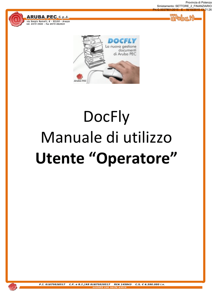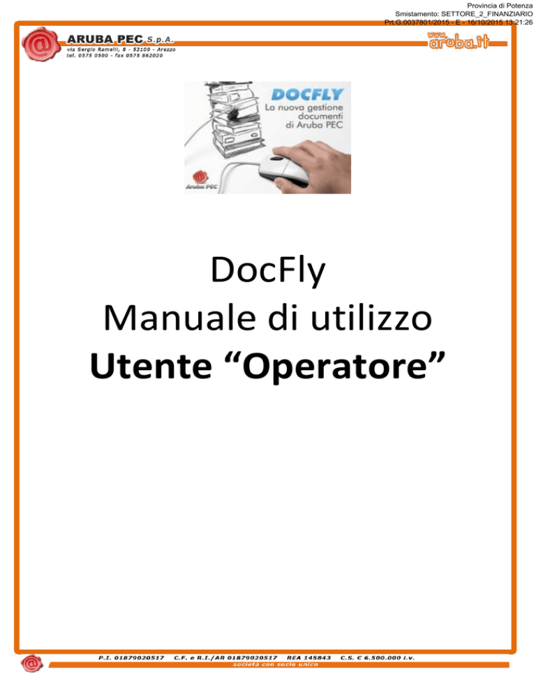 Provincia di Potenza Smistamento: SETTORE_2_FINANZIARIO Prt.G.0037801/2015 - E - 16/10/2015 13:21:26 DocFly Manuale di utilizzo Utente “Operatore” Sommario 1. Introduzione ........................................................................................................................ 3 2. Pannello web DocFly ........................................................................................................... 3 2.1 Requisiti di utilizzo del Pannello ....................................................................................... 3 2.2 Accesso al Sistema DocFly ................................................................................................ 4 2.3 Pagina “Home” ................................................................................................................ 5 2.4 Procedura di versamento e conservazione tramite pannello web ...................................... 6 2.4.1 Procedura guidata (Wizard) .......................................................................................... 6 2.4.2 Procedura manuale ...................................................................................................... 9 2.5 Ricerca documenti in conservazione ............................................................................... 10 2.6 Esibizione dei documenti conservati ............................................................................... 11 2.6.1 Preparazione e creazione del PdD coincidente con il PdA ............................................. 12 2.6.2 Preparazione e creazione del PdD NON coincidente con il PdA ..................................... 13 2.7 Reportistica di sistema ................................................................................................... 14 Pag. 2 Pagina 2 - p_pz_0037801/2015 1. Introduzione Questa guida vuole essere per l'utente un valido strumento ai fini di un corretto utilizzo del sistema di conservazione DocFly erogato in modalità outsourcing . Aruba DocFly garantisce la conservazione a norma di qualsiasi tipo di documento informatico in linea con la normativa vigente, ovvero il DPCM 3 dicembre 2013, assicurandone le caratteristiche di autenticità, integrità, affidabilità, leggibilità e reperibilità. All'interno del presente documento sono trattati gli argomenti relativi alla gestione e navigazione del sistema e le procedure di esibizione dei documenti in conservazione, tramite l’utente “Operatore”, con l'intento di soddisfare le esigenze dell'utente che potrà sfruttare al meglio le potenzialità offerte da DocFly. Per una descrizione dettagliata delle caratteristiche del servizio, incluso le misure adottate per la sicurezza e il processo di conservazione si rimanda in ogni caso alla consultazione del Manuale di Conservazione pubblicato sul sito ufficiale dell'Agid: http://www.agid.gov.it/sites/default/files/linee_guida/aruba_manuale_di_conservazione.pdf 2. Pannello web DocFly Il sistema DocFly dispone di un pannello di gestione attraverso il quale, l'utente che accede, dispone di tutti gli strumenti utili per la gestione delle sue attività, in linea con i privilegi previsti per quella utenza: 2.1 Requisiti di utilizzo del Pannello Il pannello è fruibile tramite un comune browser web, ma per rendere migliore e più veloce la fruibilità delle funzionalità sono state adottate anche tecnologie moderne. E' quindi consigliato utilizzare un browser moderno, a costo di qualche malfunzionamento con le versioni più obsolete. A puro titolo di esempio si consiglia l'uso di uno dei seguenti browser: Google Chrome 35 o superiore Microsoft Explorer 10 o superiore Mozilla Firefox 32 o superiore Pag. 3 Pagina 3 - p_pz_0037801/2015 2.2 Accesso al Sistema DocFly L'utente operativo può accedere all'interfaccia Web di DocFly digitando l'indirizzo: https://www.docfly.it e inserendo le proprie credenziali, username e password, entrambe create e inviate via PEC in automatico, a seguito della procedura di creazione dell’utenza da parte dell’amministratore del sistema. Al primo accesso il sistema DocFly richiede obbligatoriamente la personalizzazione della propria password. Quella fornita in automatico dal sistema via mail infatti è temporanea e non consente l'accesso a nessun altra funzionalità. Rimane responsabilità dell’utente conservare accuratamente la nuova password, in quanto essa viene salvata nel profilo criptata e non viene in nessun caso reinviata. Tale operazione è prevista ogniqualvolta viene effettuato un reset della password o quando un'utenza precedentemente disabilitata viene nuovamente resa disponibile. In questo modo l'utente finale ha la garanzia di essere l'unica persona a conoscere i propri dati di accesso. Pag. 4 Pagina 4 - p_pz_0037801/2015 2.3 Pagina “Home” Una volta effettuato il login, l'utente “Operatore” accede all'area riservata da cui è possibile navigare l'archivio o gli archivi associati alla propria utenza. La pagina di accesso “Home” si divide in due aree. La prima, collocata nel quadrante superiore del pannello, mostra i dati di identificazione relativi all'utente Operativo che ha effettuato l’accesso: L'icona “Cambia password”, presente all'interno del box premette all'utente di modificare o effettuare reset della password di accesso al pannello. Nella parte sottostante, sono presenti le seguenti sezioni: - Ricerca - Area di lavoro - Report L’estremo quadrante inferiore mostra l’elenco degli archivi associati all’utenza (nell’esempio esiste un solo archivio associato). Pag. 5 Pagina 5 - p_pz_0037801/2015 2.4 Procedura di versamento e conservazione tramite pannello web L'operazione di acquisizione (o versamento) consiste nella trasmissione dei documenti da conservare e dei metadati che li specializzano. La procedura segue uno schema logico di funzionamento che si articola in due fasi distinte: ricezione dell'Indice del Pacchetto di Versamento (IPdV) e ricezione dei documenti che fanno parte del Pacchetto d