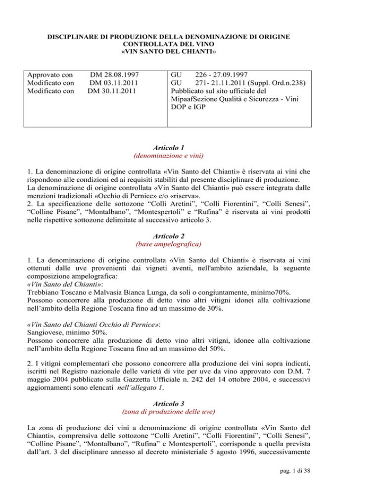 DISCIPLINARE DI PRODUZIONE DELLA DENOMINAZIONE DI ORIGINE CONTROLLATA DEL VINO «VIN SANTO DEL CHIANTI» Approvato con Modificato con Modificato con DM 28.08.1997 DM 03.11.2011 DM 30.11.2011 GU 226 - 27.09.1997 GU 271- 21.11.2011 (Suppl. Ord.n.238) Pubblicato sul sito ufficiale del MipaafSezione Qualità e Sicurezza - Vini DOP e IGP Articolo 1 (denominazione e vini) 1. La denominazione di origine controllata «Vin Santo del Chianti» è riservata ai vini che rispondono alle condizioni ed ai requisiti stabiliti dal presente disciplinare di produzione. La denominazione di origine controllata «Vin Santo del Chianti» può essere integrata dalle menzioni tradizionali «Occhio di Pernice» e/o «riserva». 2. La specificazione delle sottozone “Colli Aretini”, “Colli Fiorentini”, “Colli Senesi”, “Colline Pisane”, “Montalbano”, “Montespertoli” e “Rufina” è riservata ai vini prodotti nelle rispettive sottozone delimitate al successivo articolo 3. Articolo 2 (base ampelografica) 1. La denominazione di origine controllata «Vin Santo del Chianti» è riservata ai vini ottenuti dalle uve provenienti dai vigneti aventi, nell'ambito aziendale, la seguente composizione ampelografica: «Vin Santo del Chianti»: Trebbiano Toscano e Malvasia Bianca Lunga, da soli o congiuntamente, minimo70%. Possono concorrere alla produzione di detto vino altri vitigni idonei alla coltivazione nell’ambito della Regione Toscana fino ad un massimo de 30%. «Vin Santo del Chianti Occhio di Pernice»: Sangiovese, minimo 50%. Possono concorrere alla produzione di detto vino altri vitigni, idonee alla coltivazione nell’ambito della Regione Toscana fino ad un massimo del 50%. 2. I vitigni complementari che possono concorrere alla produzione dei vini sopra indicati, iscritti nel Registro nazionale delle varietà di vite per uve da vino approvato con D.M. 7 maggio 2004 pubblicato sulla Gazzetta Ufficiale n. 242 del 14 ottobre 2004, e successivi aggiornamenti sono elencati nell’allegato 1. Articolo 3 (zona di produzione delle uve) La zona di produzione dei vini a denominazione di origine controllata «Vin Santo del Chianti», comprensiva delle sottozone “Colli Aretini”, “Colli Fiorentini”, “Colli Senesi”, “Colline Pisane”, “Montalbano”, “Rufina” e Montespertoli”, corrisponde a quella prevista dall’art. 3 del disciplinare annesso al decreto ministeriale 5 agosto 1996, successivamente pag. 1 di 38 integrata con la delimitazione della sottozona “Montespertoli” di cui al decreto ministeriale 8 settembre 1997. Nella zona di produzione della denominazione “Vin Santo del Chianti Classico” non si possono impiantare ed iscrivere vigneti allo schedario viticolo con denominazione di origine controllata “Vin Santo del Chianti” né produrre vini “Vin Santo del Chianti”. La zona di produzione dei vini a denominazione di origine controllata «Vin Santo del Chianti» è così delimitata: Provincia di Arezzo Territorio A La delimitazione ha inizio nel punto di incontro fra il confine provinciale Firenze-Arezzo ed il torrente Resco, a nord-est di Figline Valdarno. Da tale punto il limite segue, in direzione nord-est il confine fra le province sopra indicate e sorpassata quota 399 si immette sulla mulattiera e poi sulla strada che per C.se Treggiano, quota 512, Menzano e C.S. Donato giunge a Villa Casamora, tocca successivamente quota 370 e quota 364 sul T. Resco, risale la mulattiera per il Casino (quota 512) passando per quota 478, poi per la carreggiabile giunge a Pulicciano, C. la Fonte, tocca la quota 387 e al bivio successivo ripiega ad est sulla carreggiabile per C. Mocale. Alla curva di quota 485 che precede C. Mocale, il limite prosegue sul sentiero per C.se le Mura, quota 549 e C. Casale fino al ponte di quota 466, ove incontra il Borro delle Faelle; risale questo borro fino a quota 867 e si immette su un affluente del Borro Rigodi fino a raggiungere quest’ultimo e seguirlo fino ad inserirsi, in prossimità di quota 726, sulla mulattiera per Poggioli (quota 699). Da qui il limite prosegue a nord sul sentiero che per quote 739 e 751 giunge, prima di C. Castagnola, su un affluente del T. Ciuffenna che segue fino al T. Ciuffenna; risale questo torrente verso nord fino a quota 701, indi devia a est su un altro suo affluente e da quota 814 si identifica con la mulattiera che per quote 840 e 788, Maestà del Renaccio, quota 680 e Poggio di Loro raggiunge Salci. Da Salci il limite segue a sud la strada per C. Sagona, indi ad est segue la strada per Trevane e Chiassaia e al bivio di quota 853 devia a sud-ovest sulla strada per le Casacce (quota 823). A questo punto il limite segue verso sud la mulattiera ed il sentiero che costeggiano poi il Fosso del Gattaio, indi segue questo fosso fino alla sua confluenza con T. Agna (quota 566), segue il T. Agna fino a quota 445. Qui il limite abbandona il T. Agna per risalire a C. la Costa (quota 495), da dove, per una mulattiera e in direzione sud-est, raggiunge quota 447 e da qui risale un affluente del T. Agna fino a quota 791. Da tale quota il limite segue verso nord il confine comunale Loro Ciuffenna-Castiglion Fibocchi indi verso sud-est il confine comunale Castiglion FibocchiTalla fino a quota 670 nei pressi di Spedale, da dove prosegue sulla mulattiera fino a Bicciano; volge quindi ad est sulla mulattiera per quote 529 e 555, C. Pratucci e quota 654, ove incontra la carreggiabile per Bibbiano con la quale s’identifica fino a quota 570. Da questo punto il limite segue in direzione nord la mulattiera che per C. Ortelli I (quota 545), C. Fani, Migliarino ed il Santo discende a Poggiaccio e da qui segue la strada verso sud e si innesta, prima di Cenina, sulla carreggiabile per Poggiolino, Podere Uliveto, quota 414 e la Fornace. Il limite prosegue ancora verso est fino alla ferrovia, con la quale s’identifica, in direzione sud fino alla strada Caliano-Ponte Caliano; segue detta strada verso sud fino a Capolona (quota 263